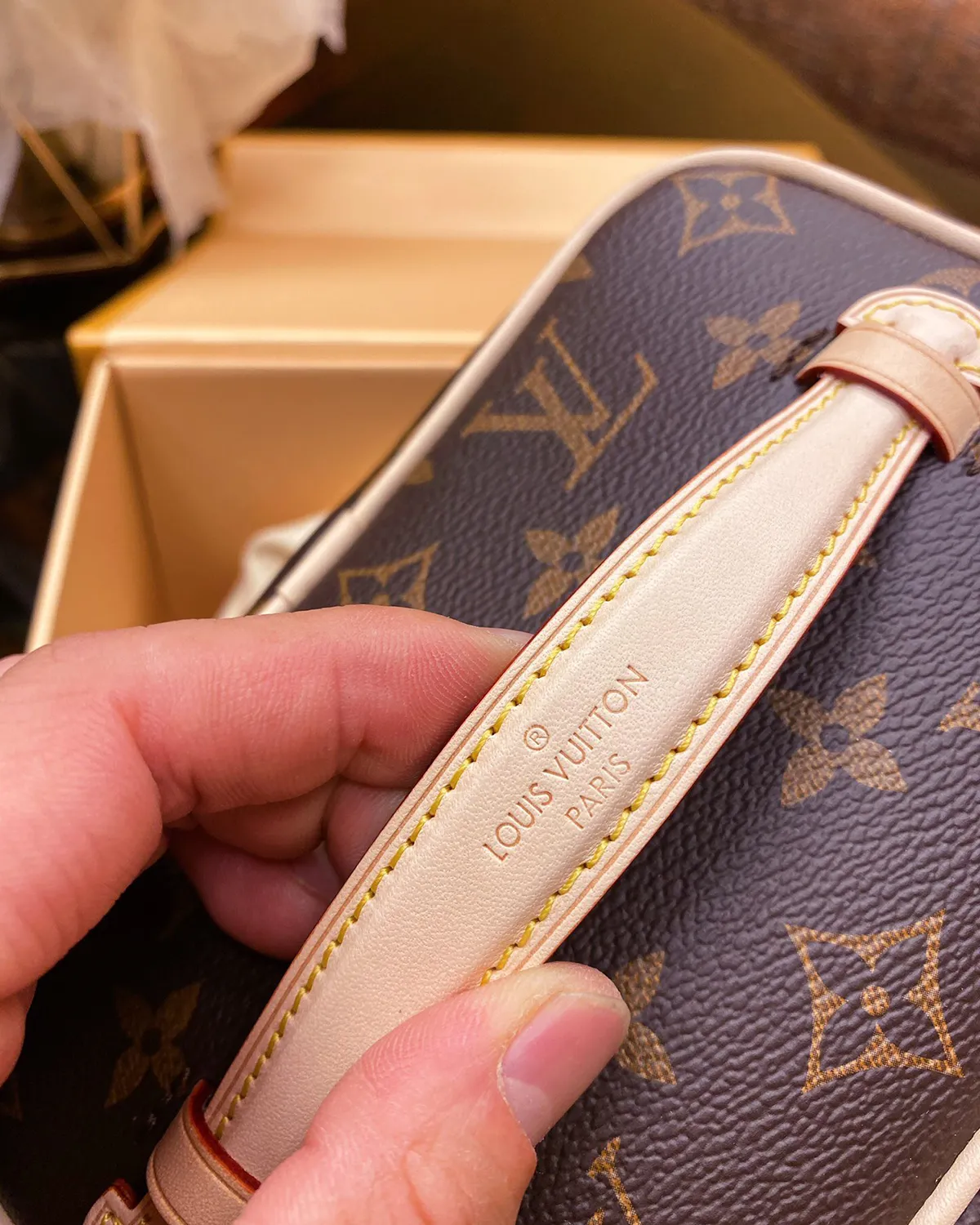 The body is constructed from the legendary coated canvas, famous for its resistance to water and wear. It is framed by piping and a top handle made from natural cowhide leather (Vachetta). This untreated leather starts as a pale beige and will slowly develop a rich amber patina, adding a personalized vintage character to the case.