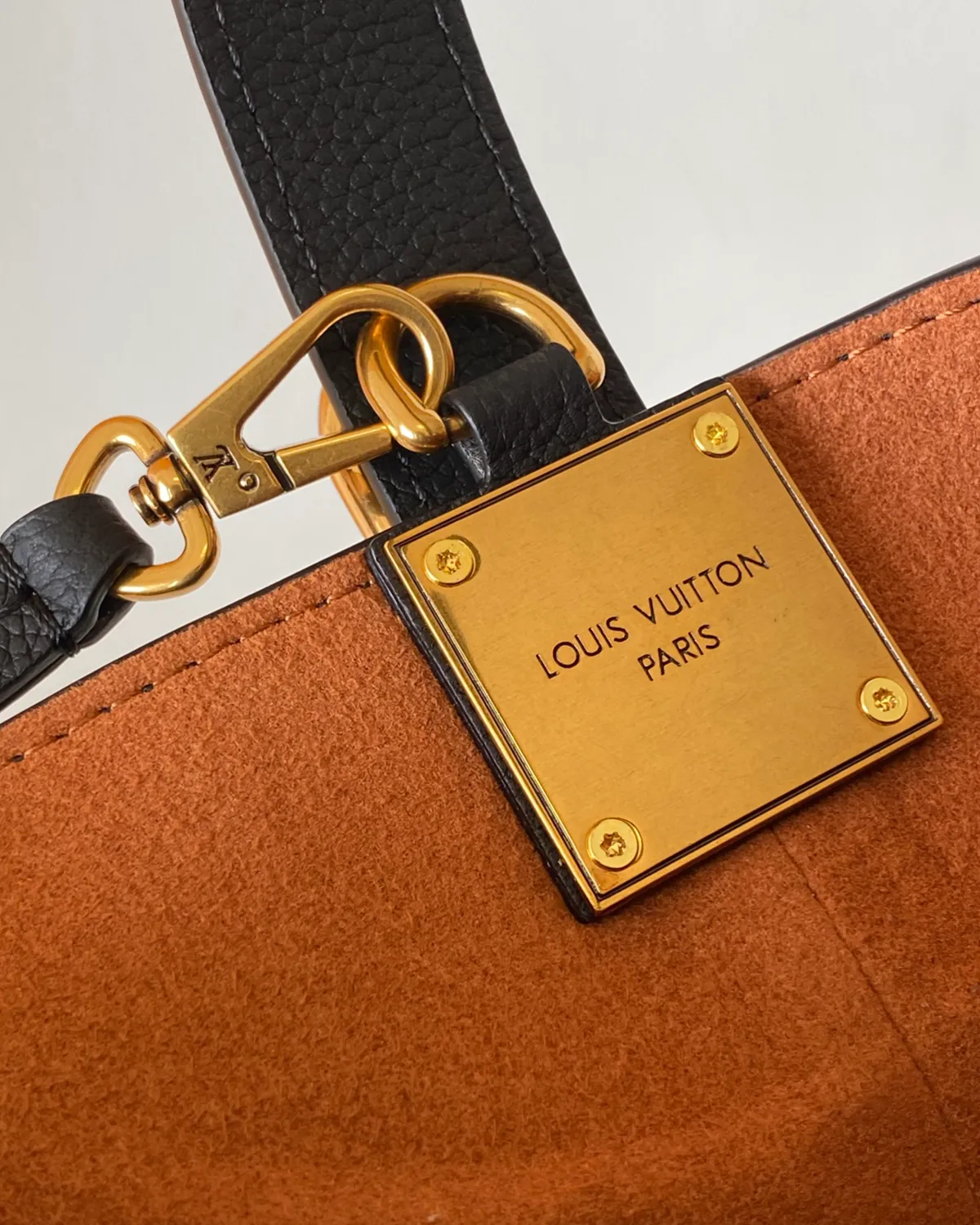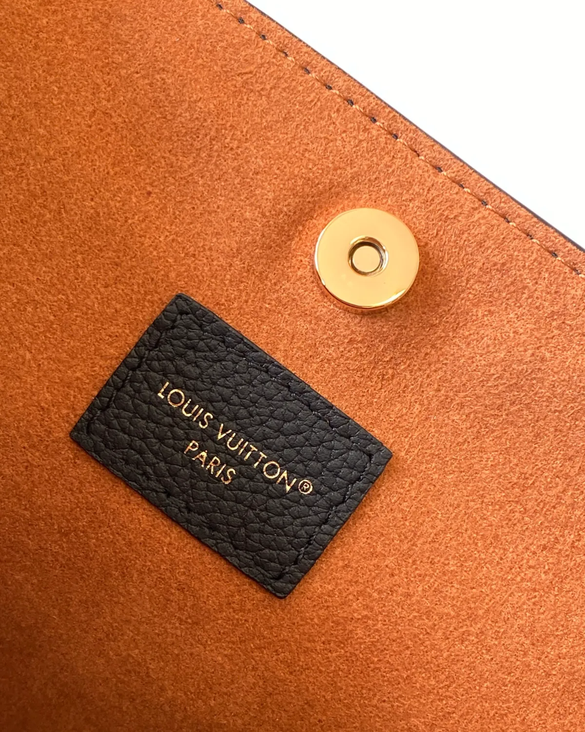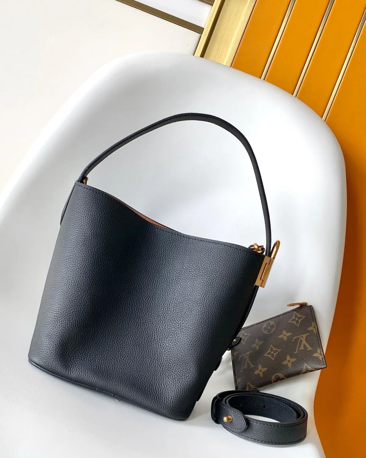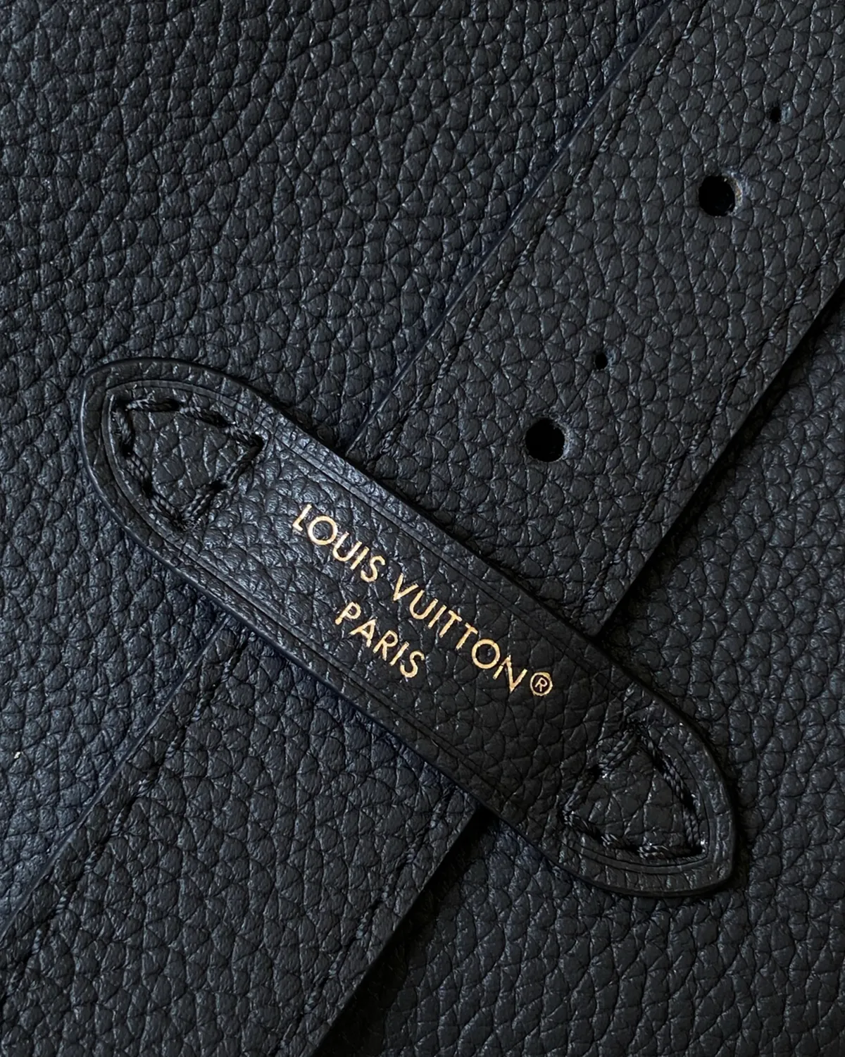 While the bag is free of monogram prints, it carries one unmistakable heritage code: the padlock. A polished gold-tone padlock secures the adjustable strap mechanism on the side. It serves as both a functional adjuster and a solitary jewel-like accent, anchoring the design in the brand’s trunk-making history.