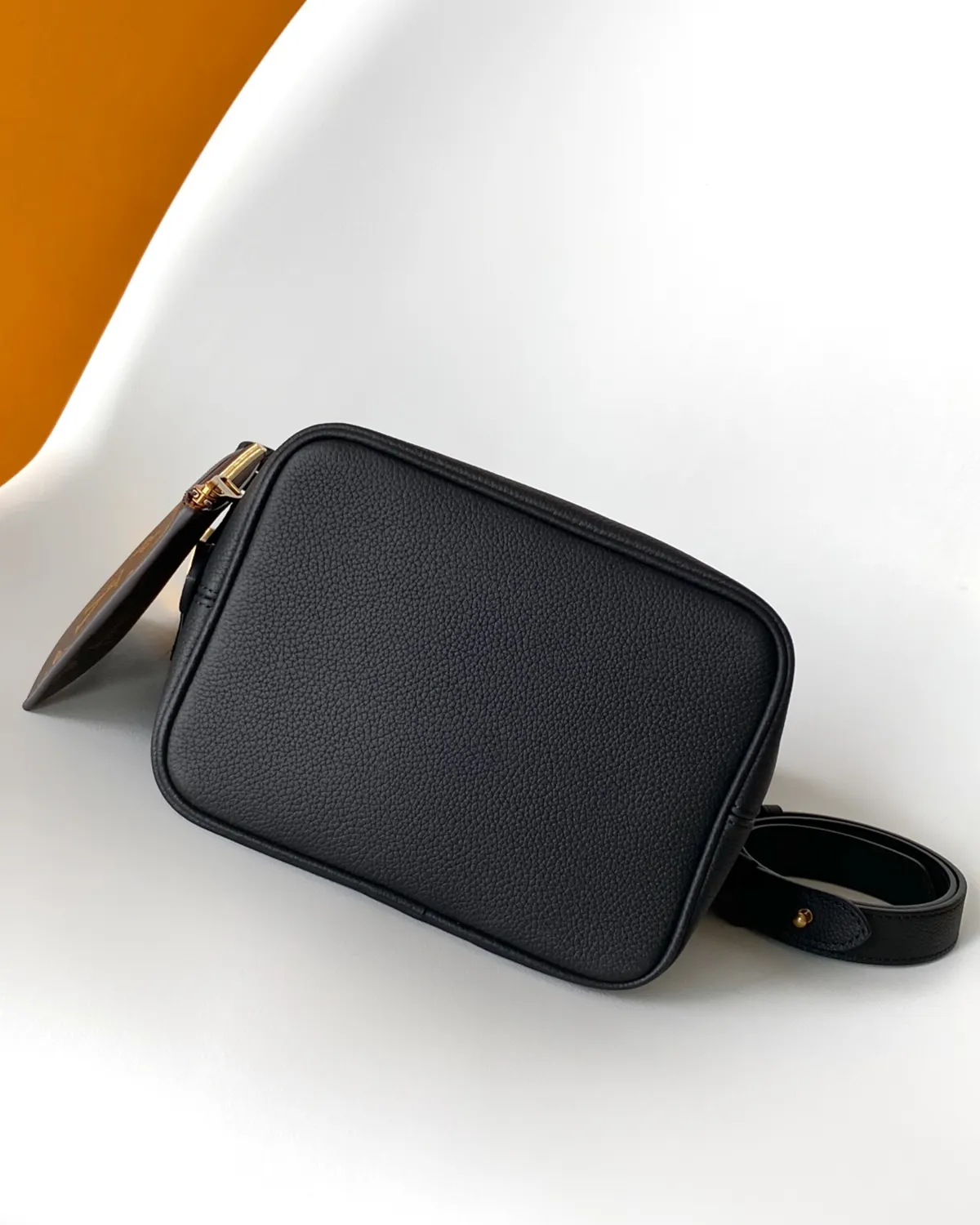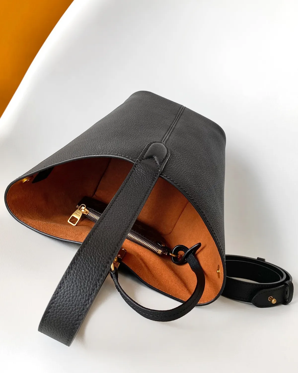 The body is crafted from a specific grade of grained calfskin selected for its exceptional softness. This allows the bag to slouch naturally against the body, creating a relaxed, effortless silhouette. The deep black grain is tactile and rich, resistant to daily wear while feeling incredibly luxurious to the touch.