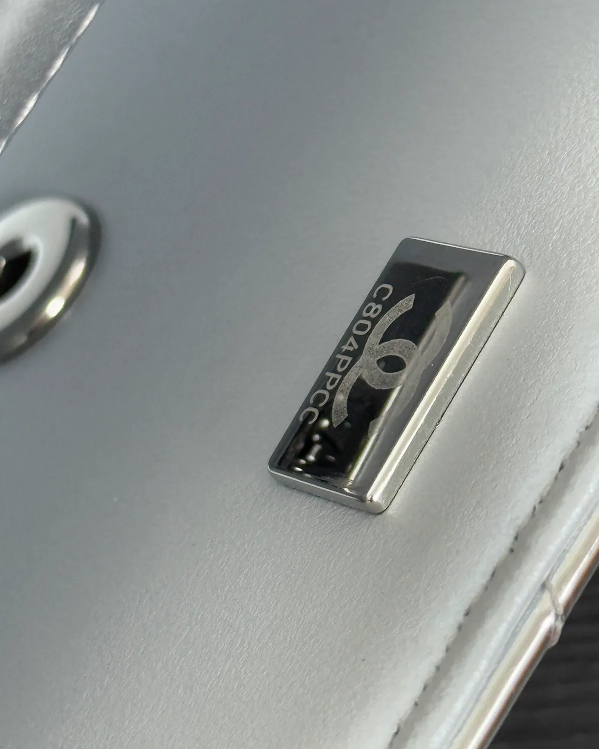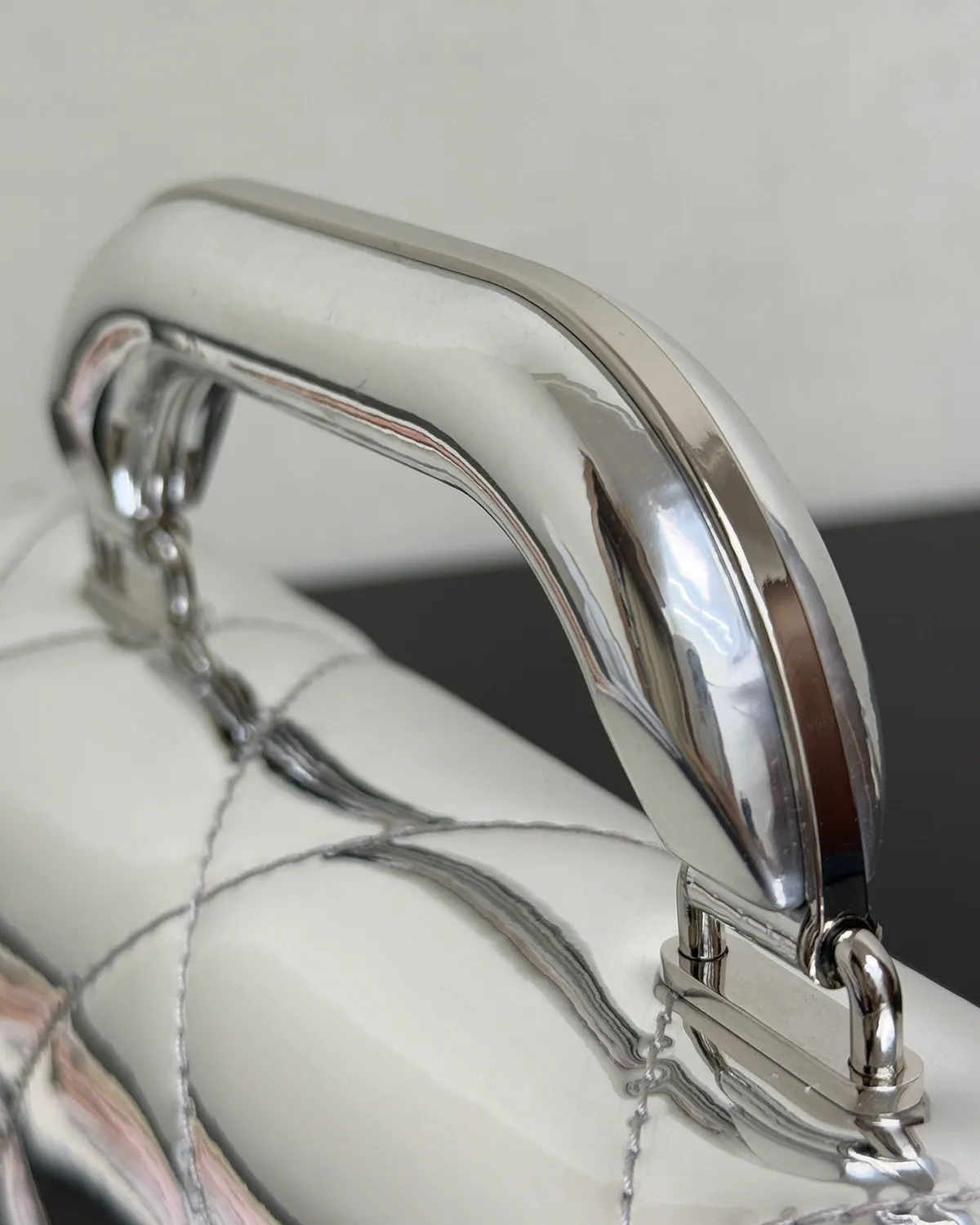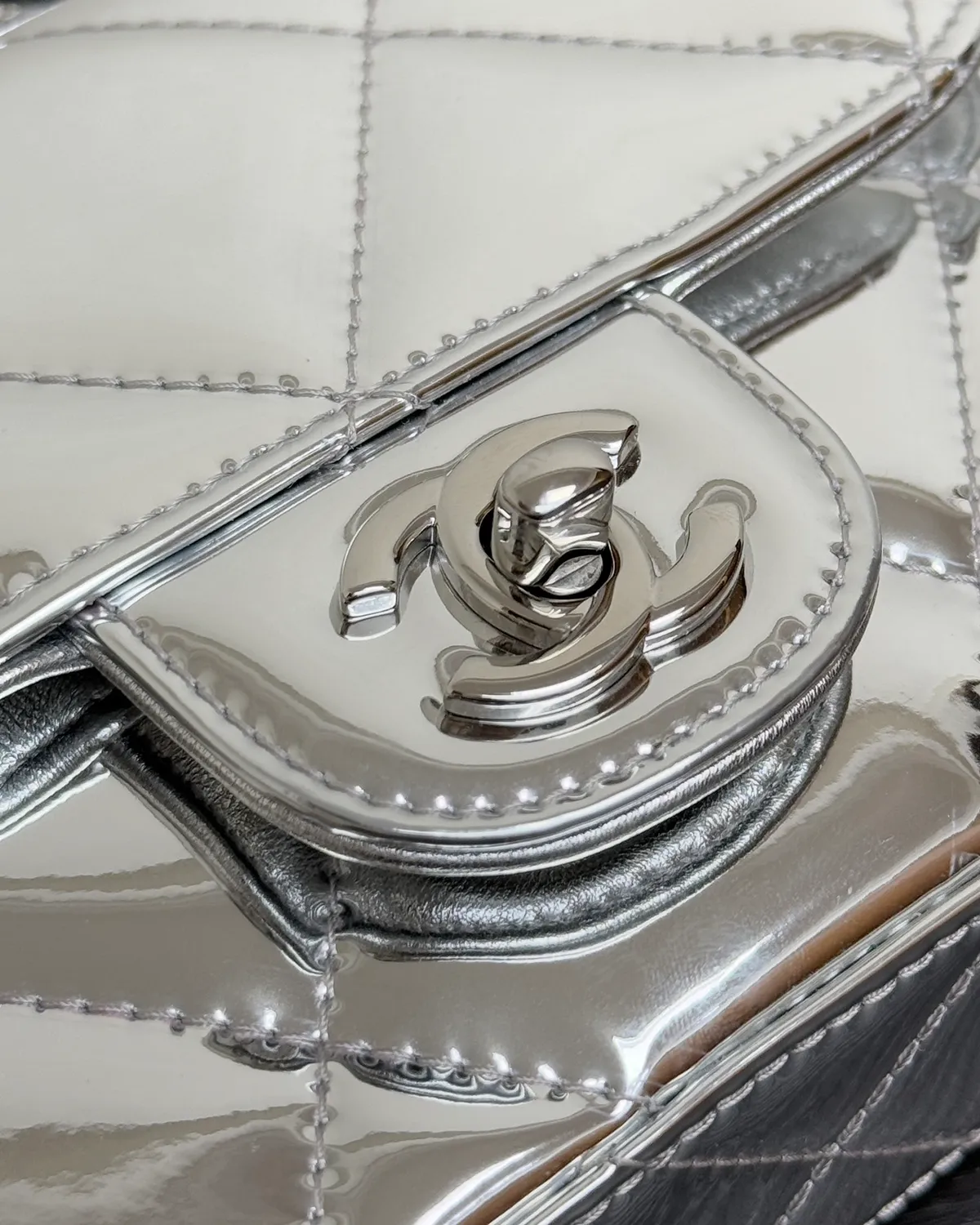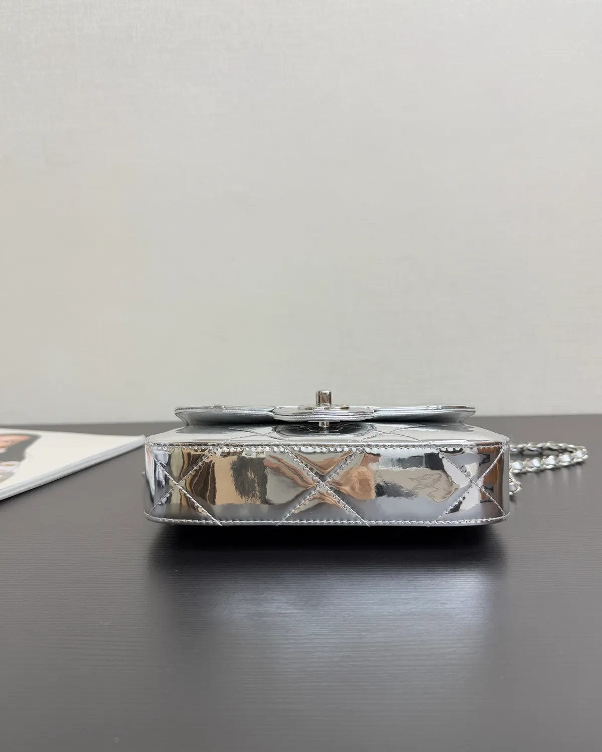 The body uses premium calfskin treated with a metallic foil overlay to achieve a flawless mirror effect. This “Liquid Silver” finish is cool, modern, and edgy. The classic diamond quilting provides a soft, pillowy texture that contrasts with the hard, reflective shine, adding depth to the compact form.