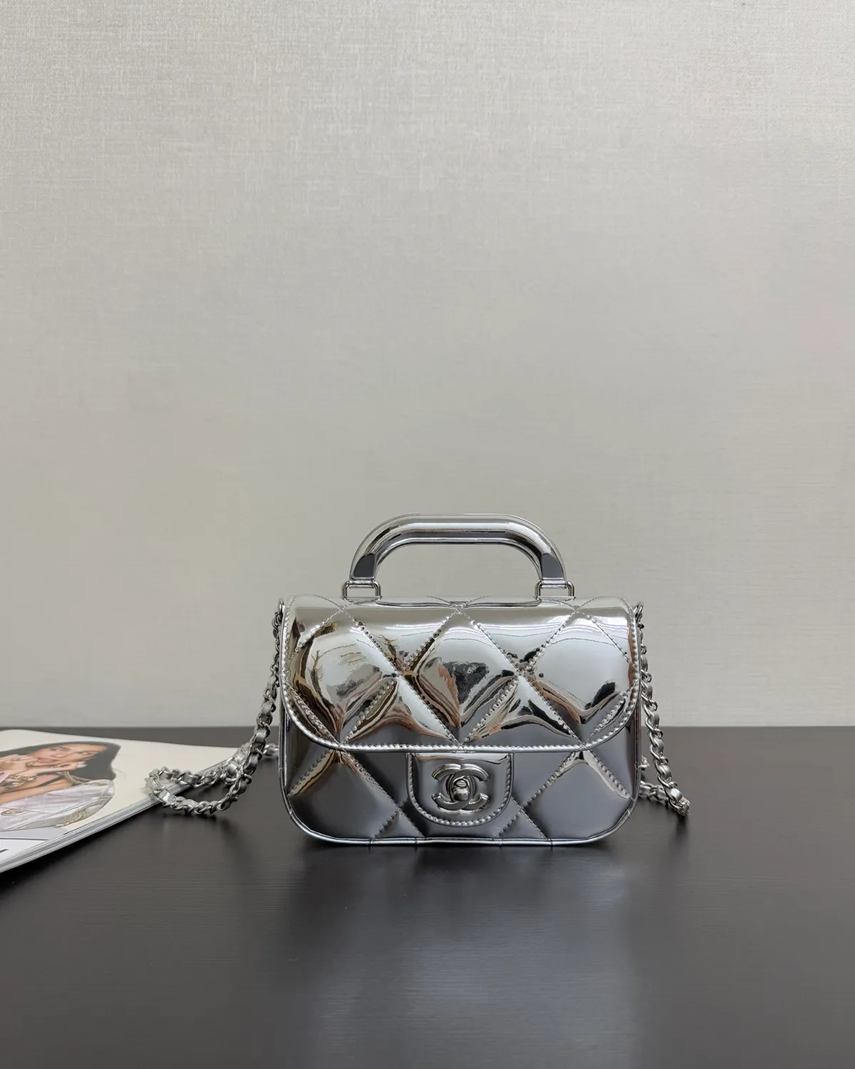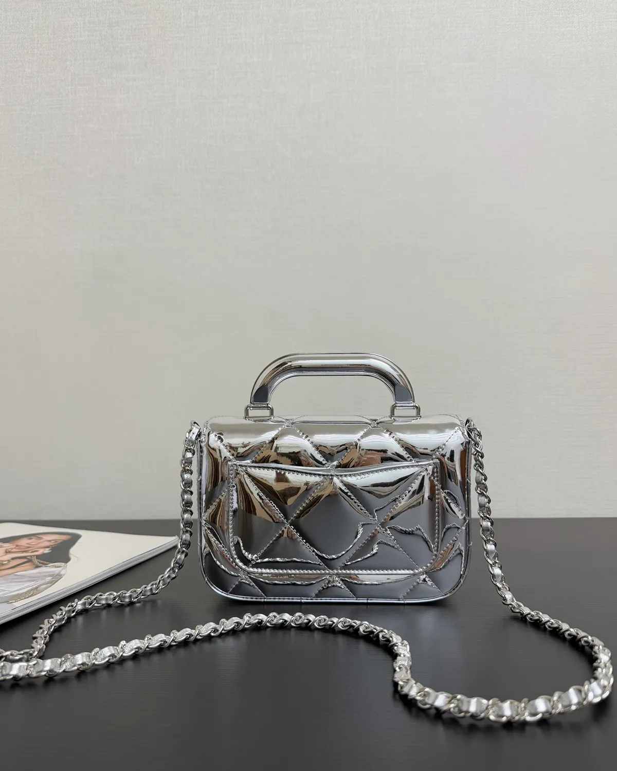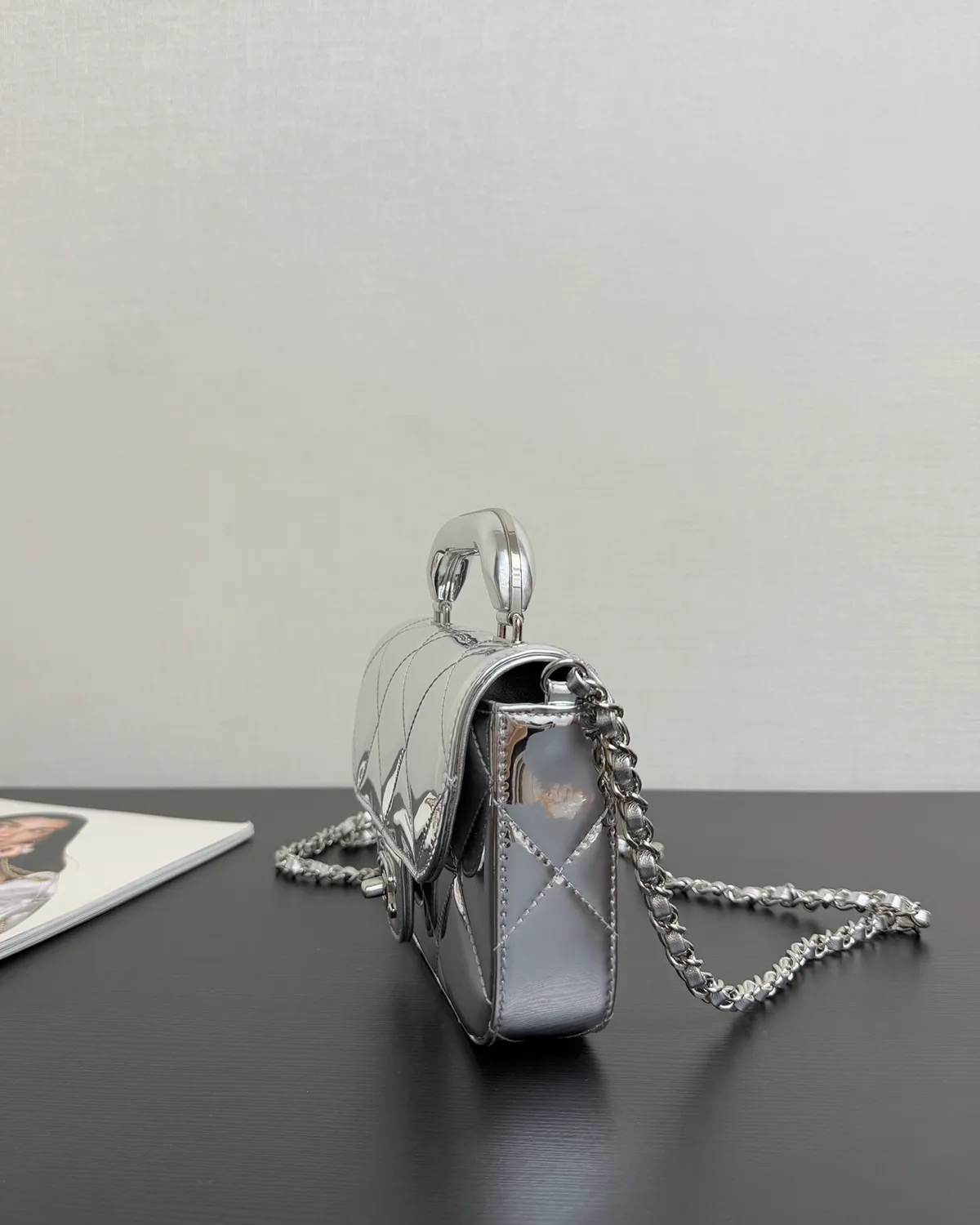 *Note: This item is a high-quality homage inspired by the Chanel Mirror Metallic Clutch with Chain design. It captures the high-shine silver aesthetic and vanity silhouette at an accessible price point.