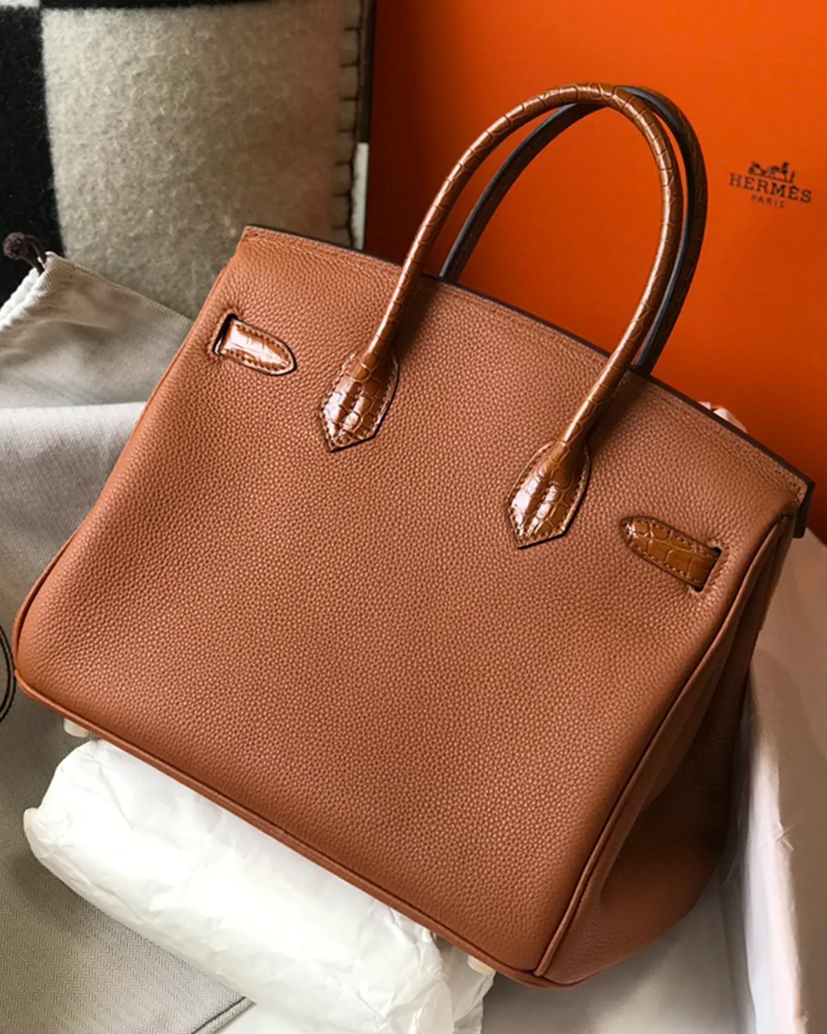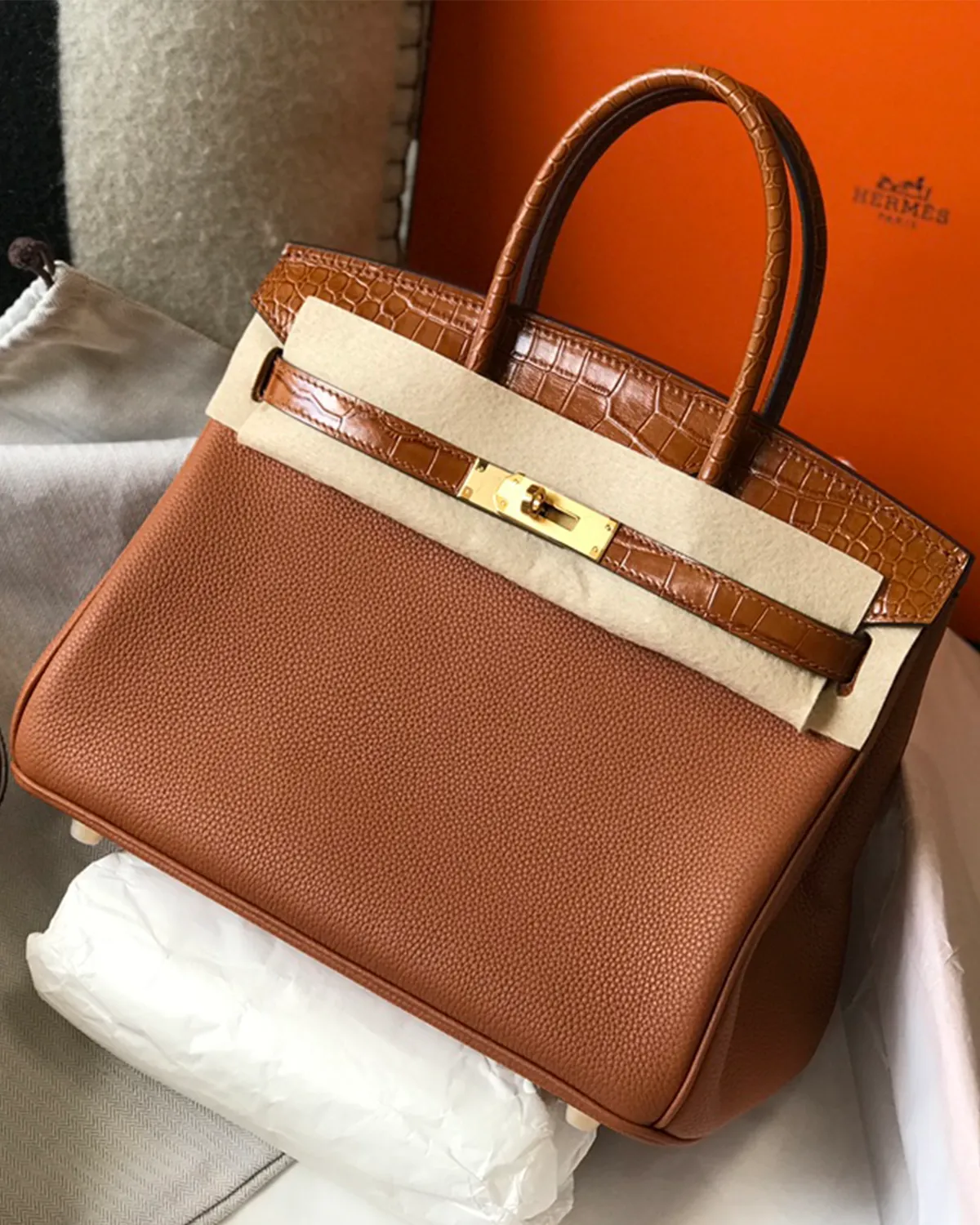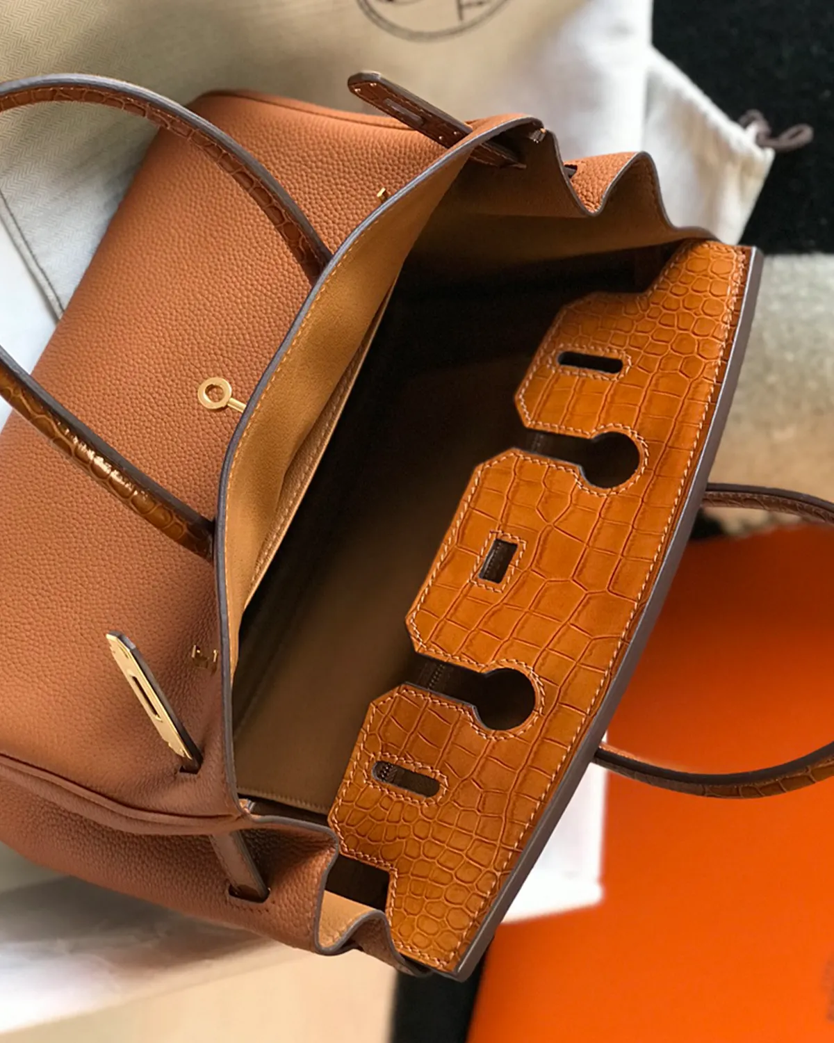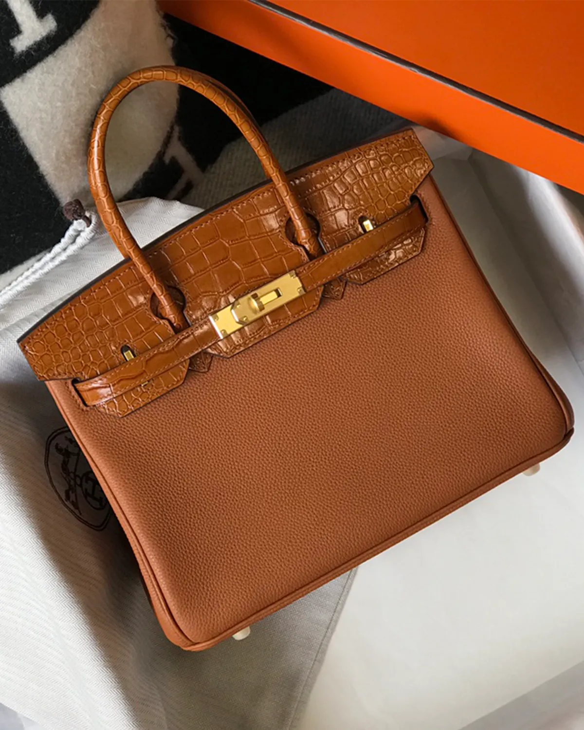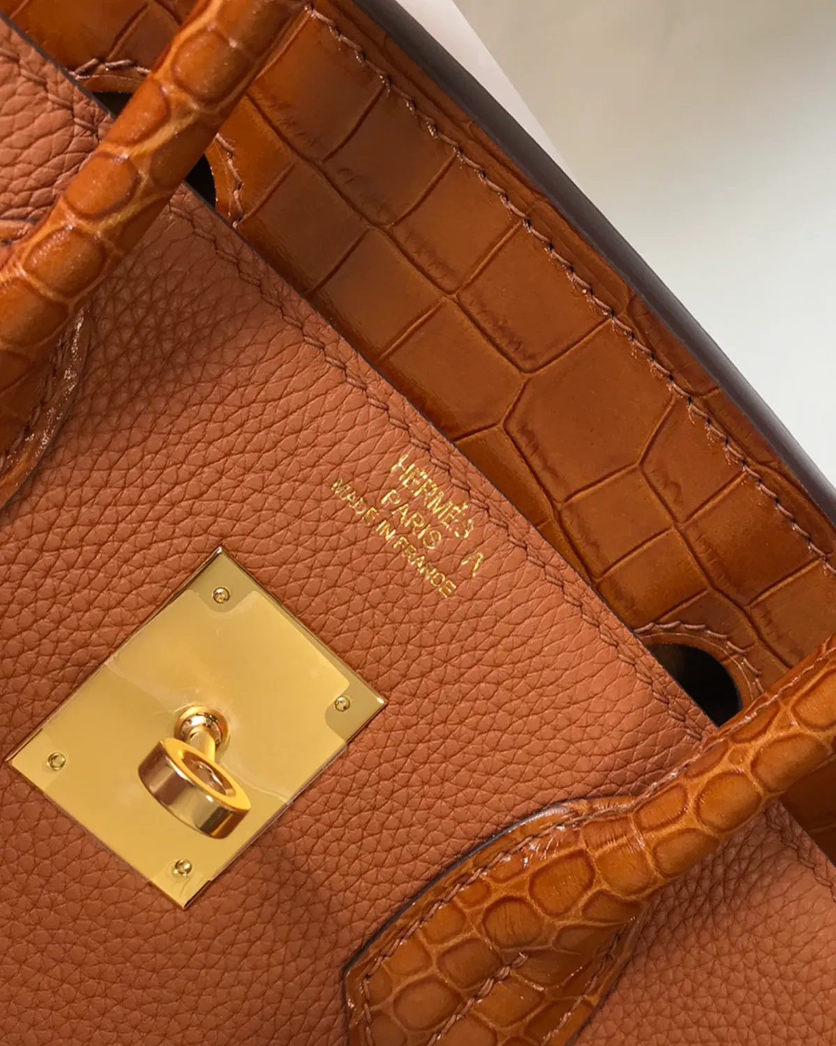 The Signature Mixed Leather Tote 25 “Touch” is designed for the connoisseur who appreciates nuance. At first glance, it appears to be a classic Gold tote, but a closer look reveals the exotic secret. The tactile interplay between the pebbled calfskin and the smooth, scaled alligator creates a sensory experience that is far more sophisticated than a full exotic bag.