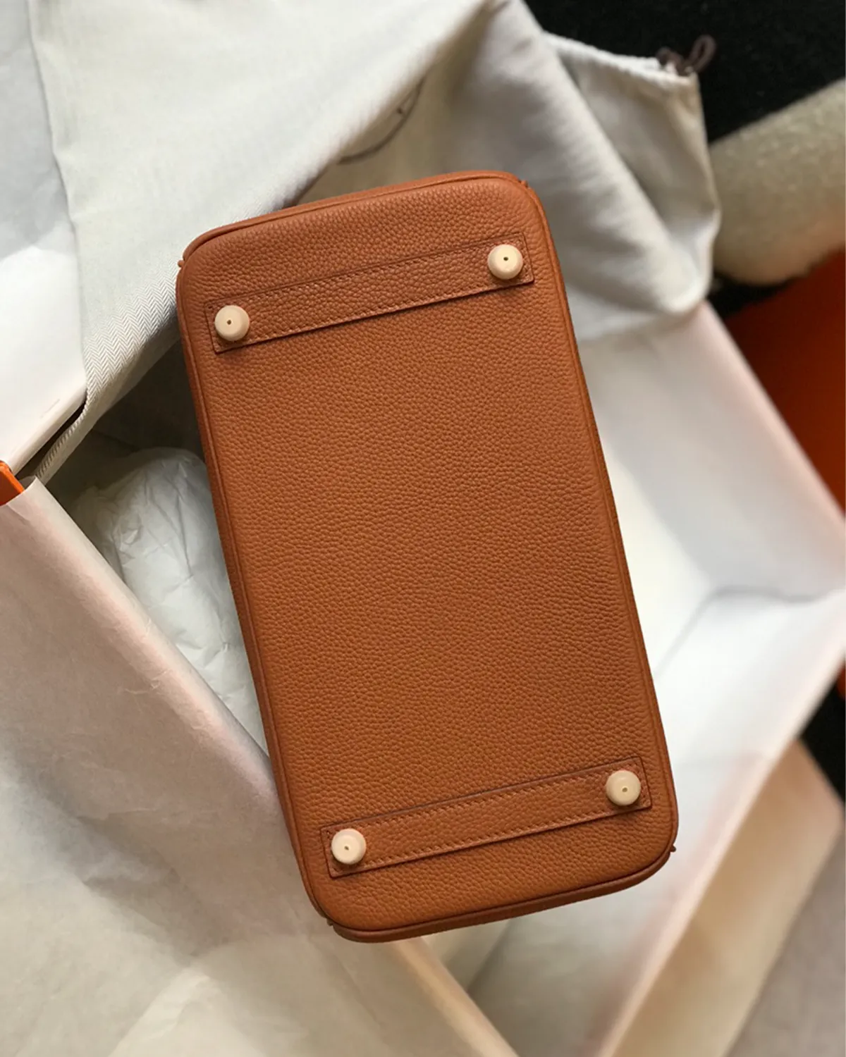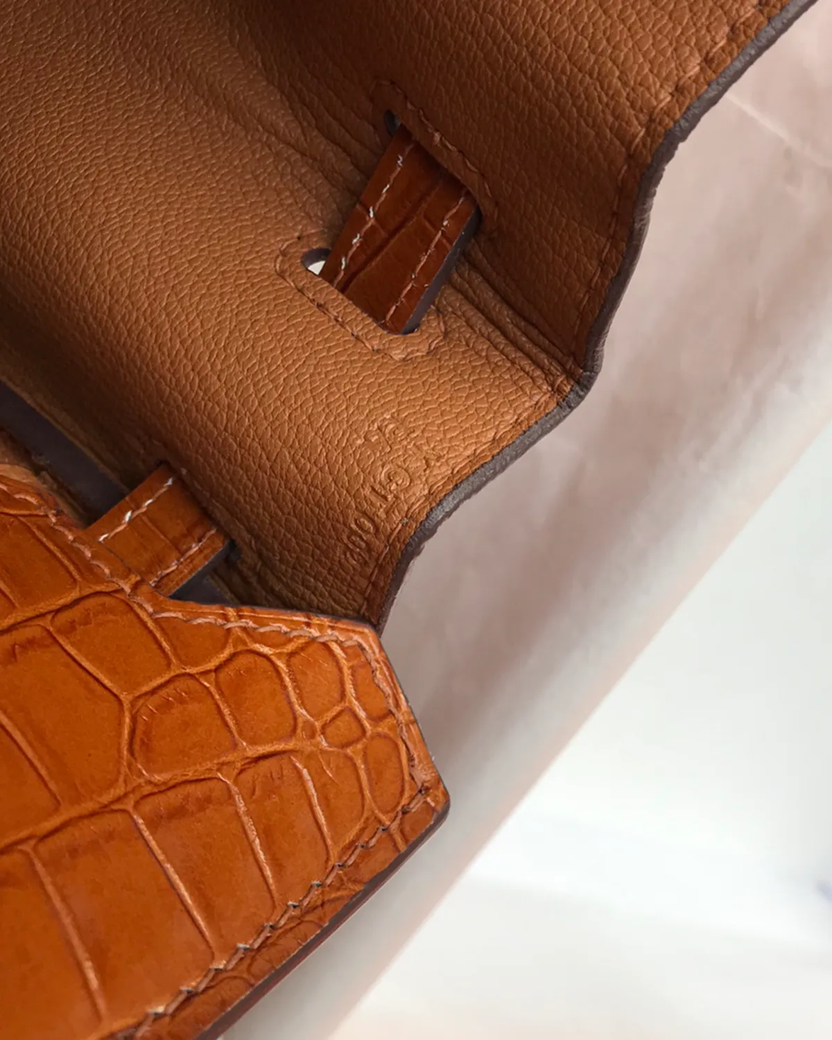 The challenge of this bag is color matching. The “Gold” dye must look identical on two completely different materials. The result is a seamless visual flow where the square scales of the alligator blend effortlessly with the grain of the Togo body. The matte finish on the exotic skin ensures it remains understated and elegant.