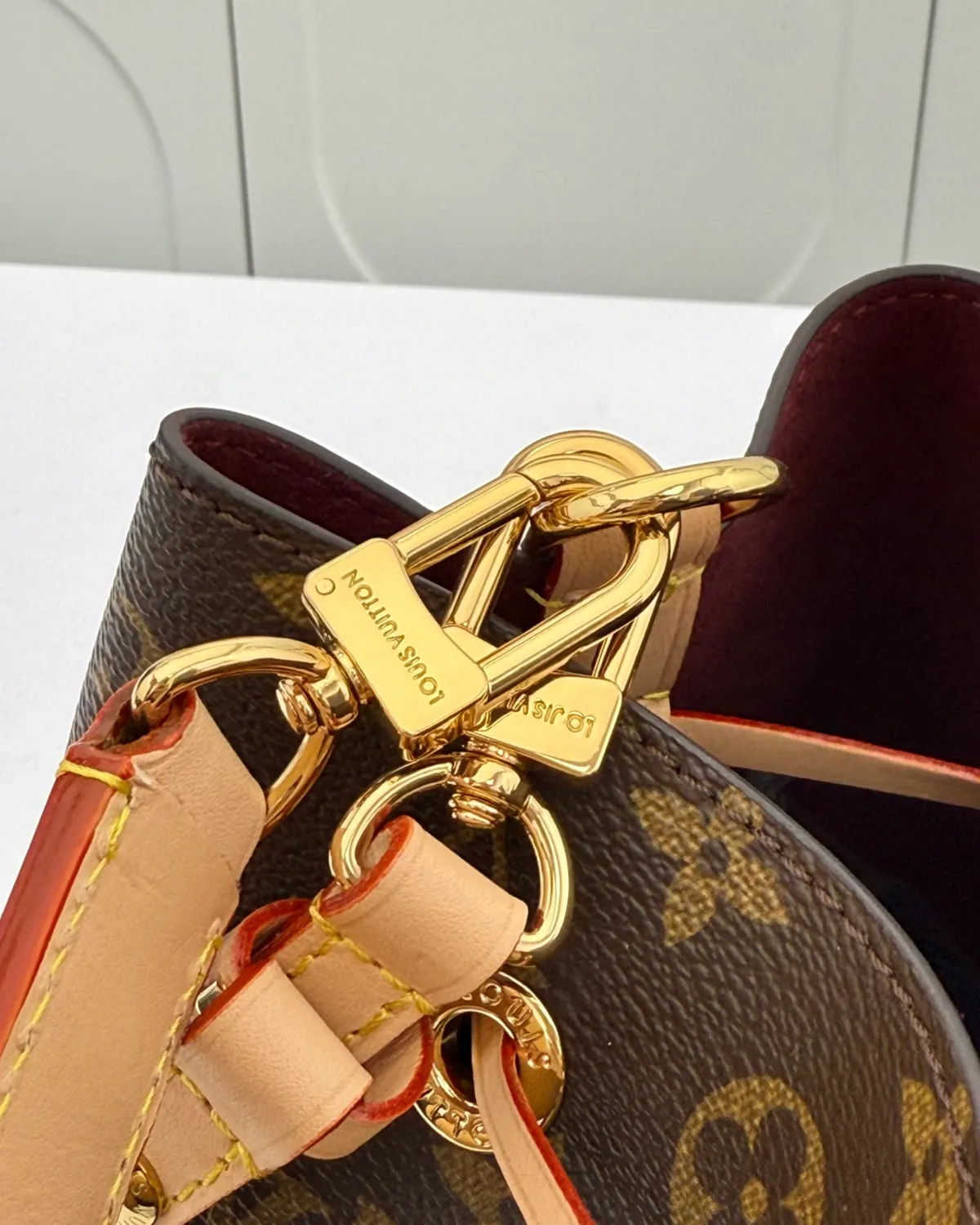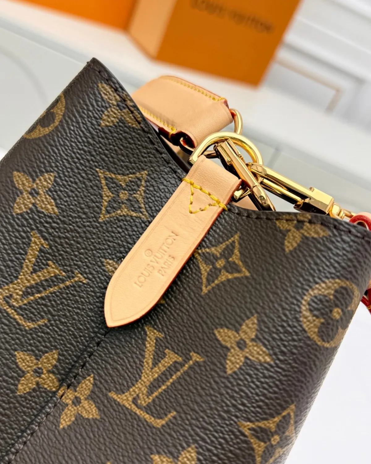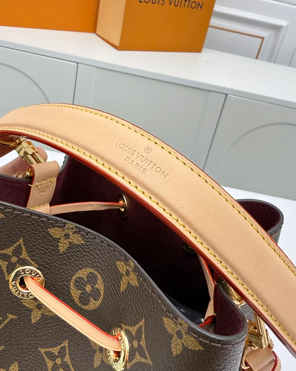 The body is wrapped in the world-renowned coated canvas, famous for its durability and iconic pattern. It is framed by natural cowhide leather (Vachetta) on the drawstring, trim, and straps. This pale, untreated leather adds a fresh contrast and will develop a unique amber patina over time, authenticating the bag’s journey with you.
