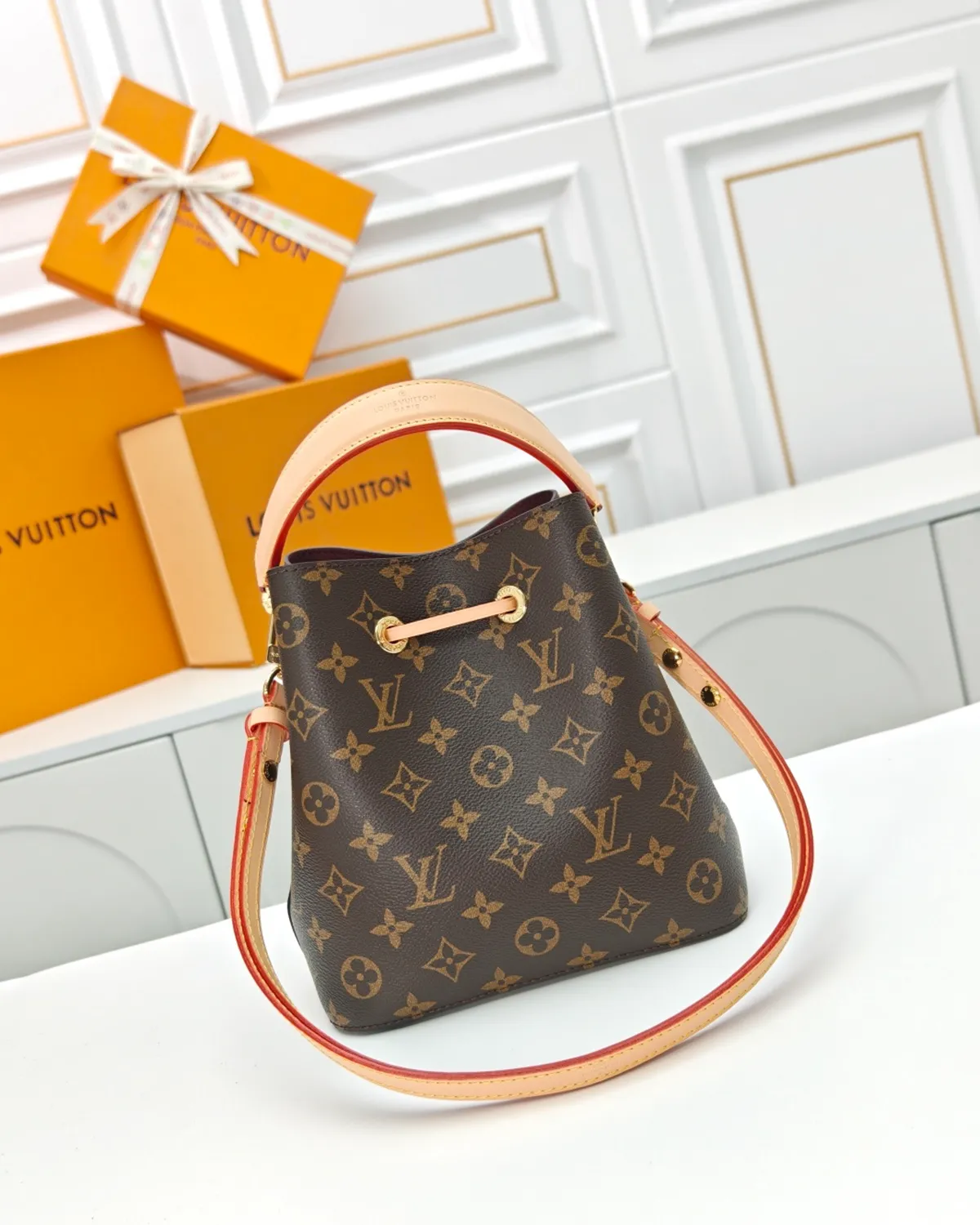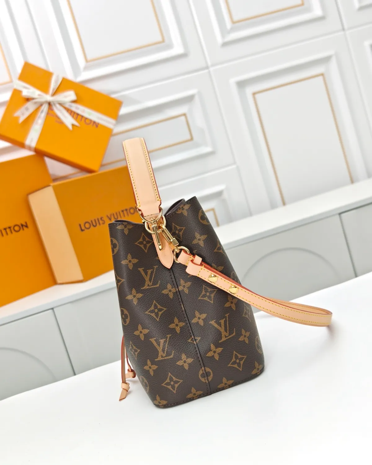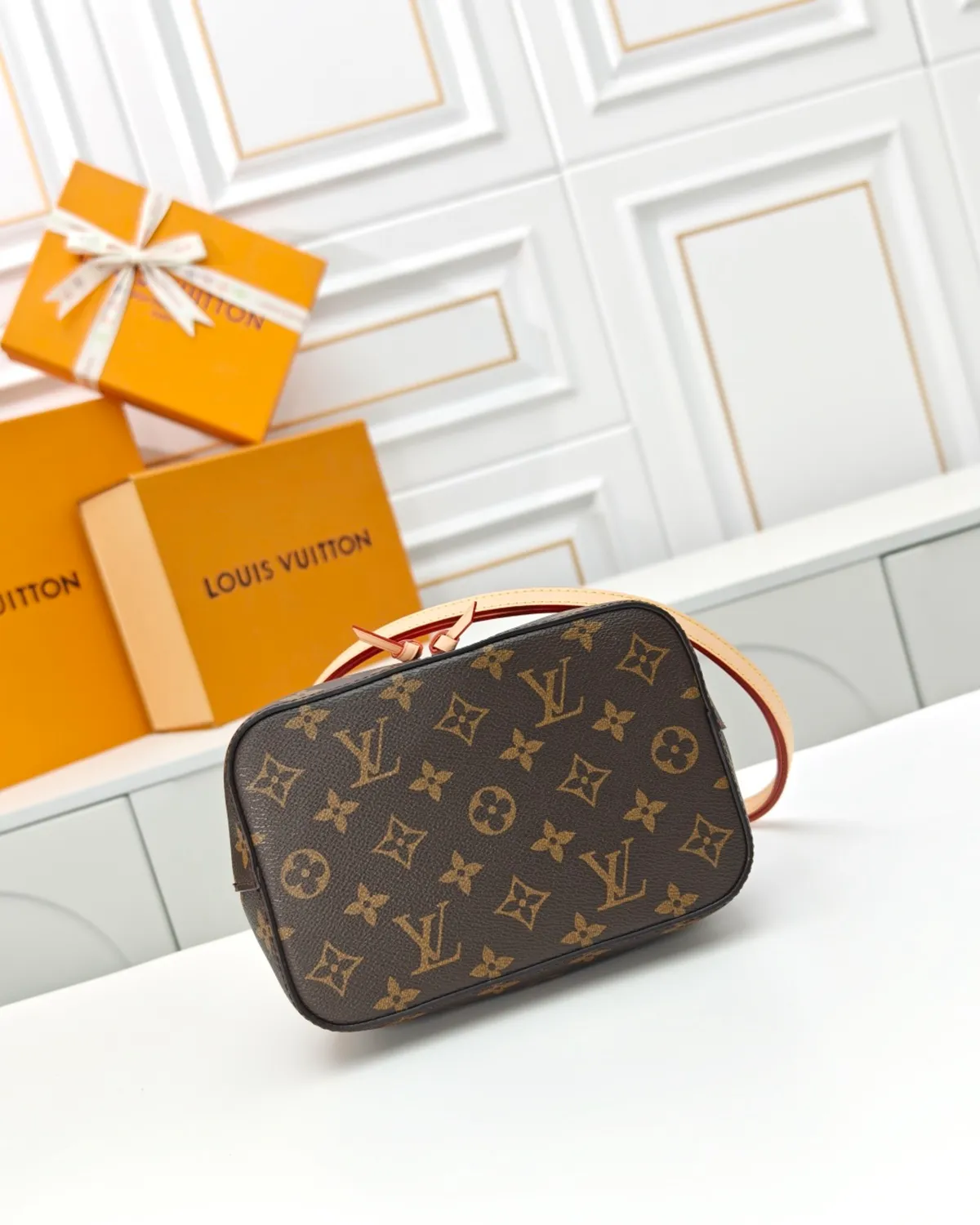 The body is wrapped in the world-renowned coated canvas, famous for its durability and iconic pattern. It is framed by natural cowhide leather (Vachetta) on the drawstring, trim, and straps. This pale, untreated leather adds a fresh contrast and will develop a unique amber patina over time, authenticating the bag’s journey with you.