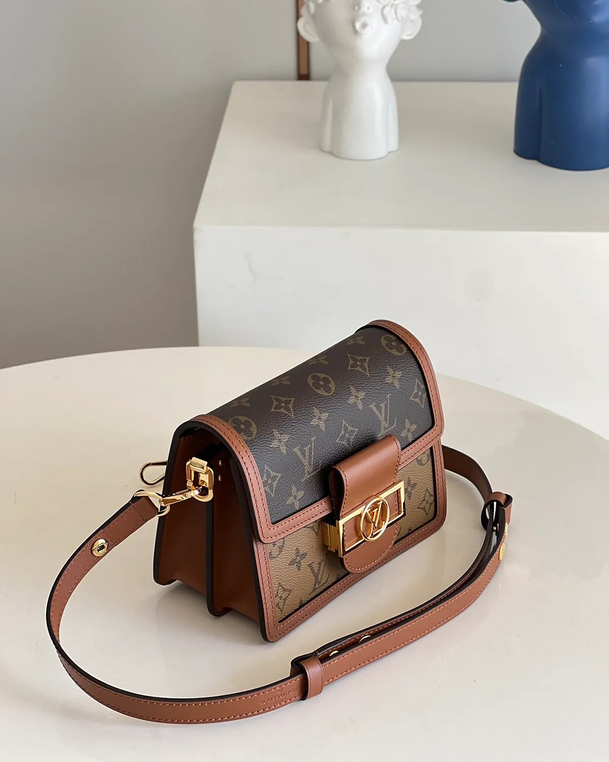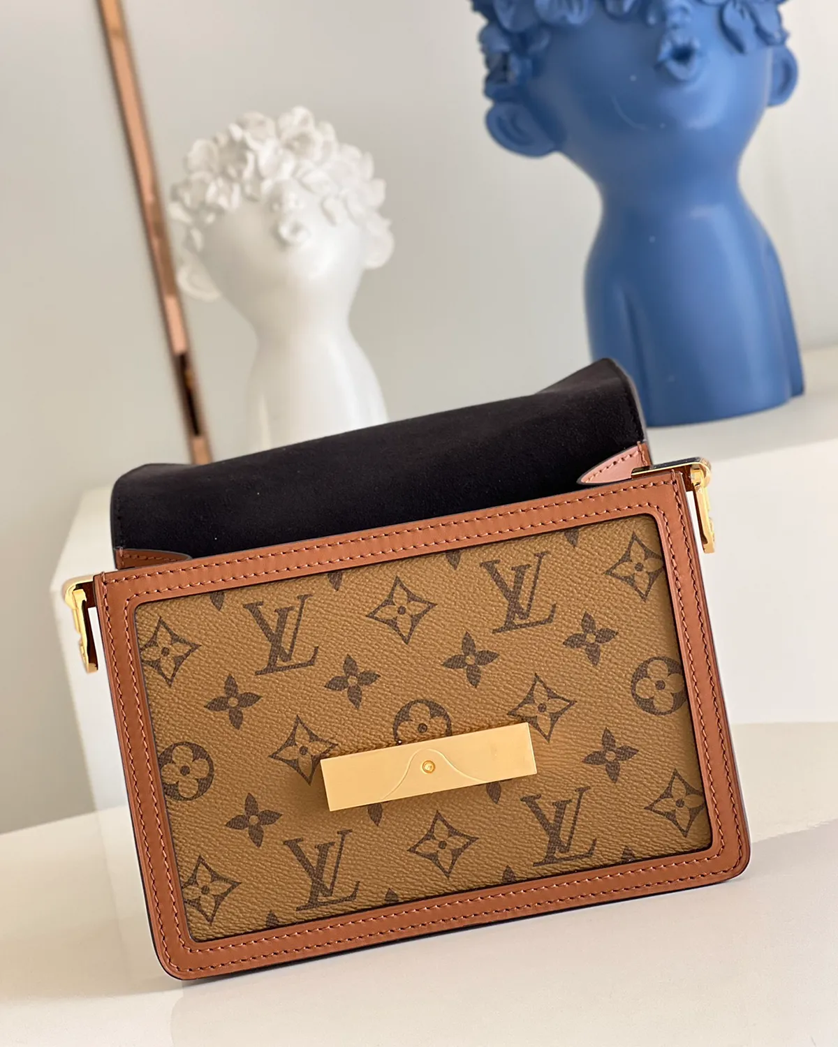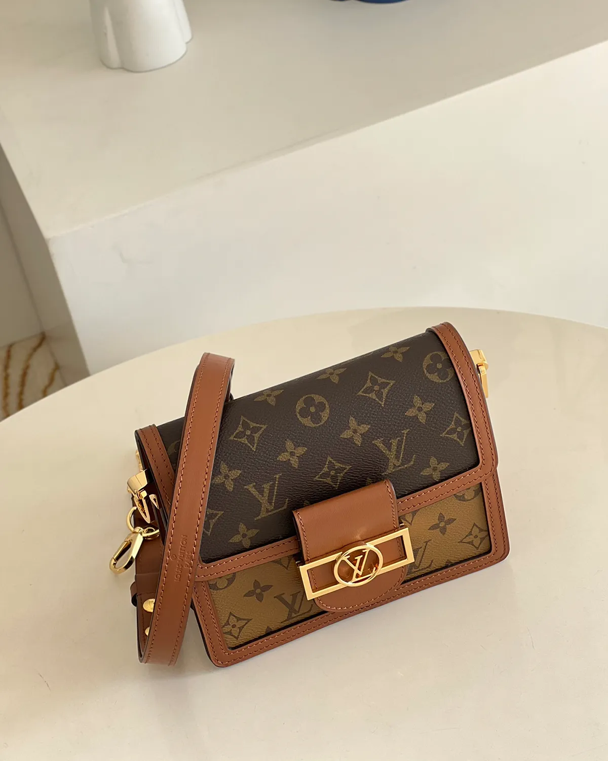 The visual appeal lies in the “Reverse” technique. The main body utilizes the classic dark monogram canvas, while the flap and trim feature the lighter, inverted colorway. This two-tone combination creates a graphic, layered look that is framed elegantly by smooth tan calfskin leather, adding a touch of vintage warmth.