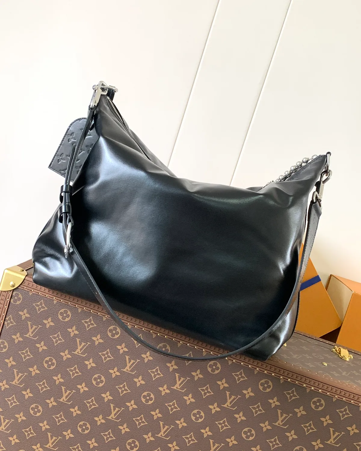 Unlike traditional briefcases or messengers, this hobo bag embraces asymmetry and softness. The integrated leather zipper pulls and matte black hardware reinforce the monochromatic, tactical aesthetic. It is rugged enough for daily use yet sophisticated enough for evening events.