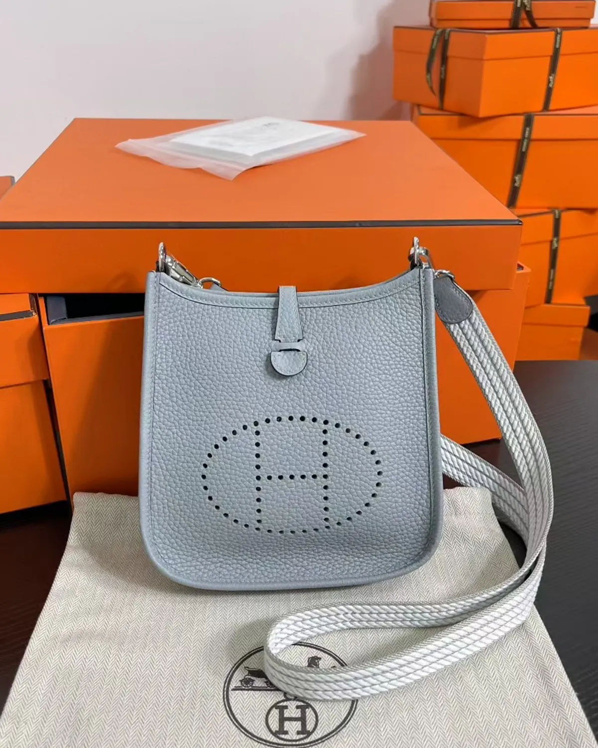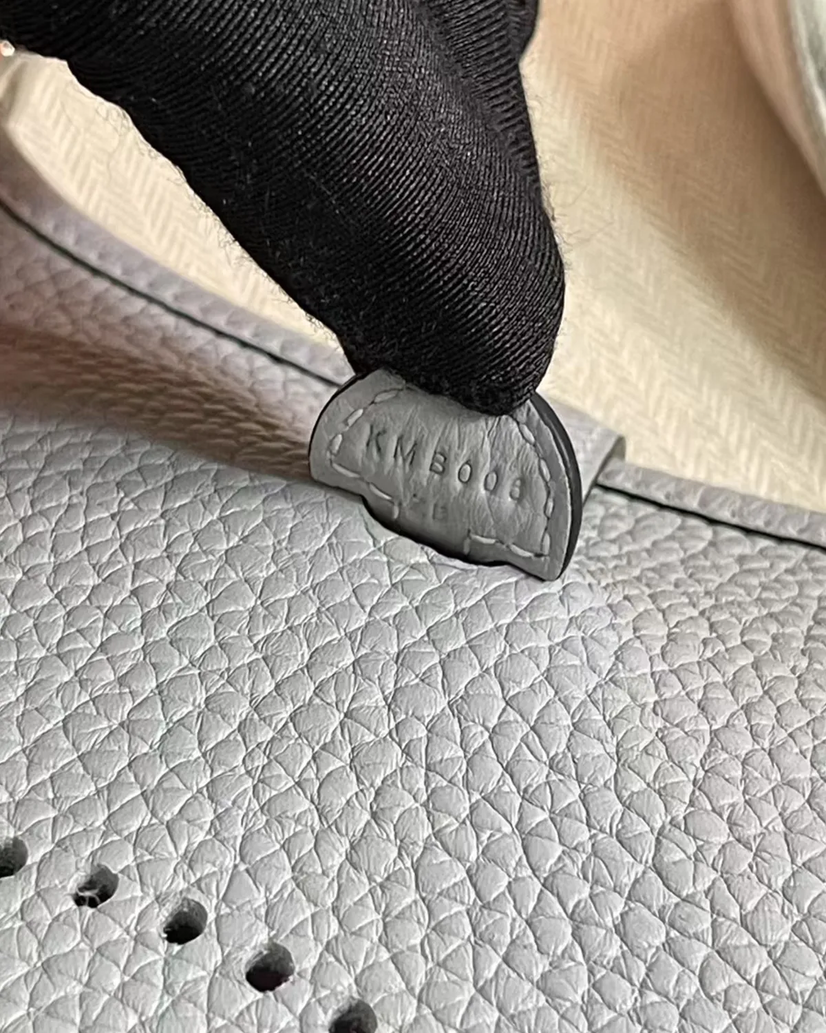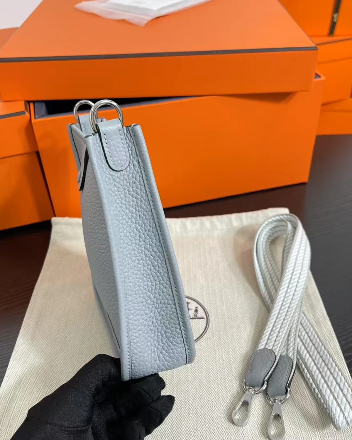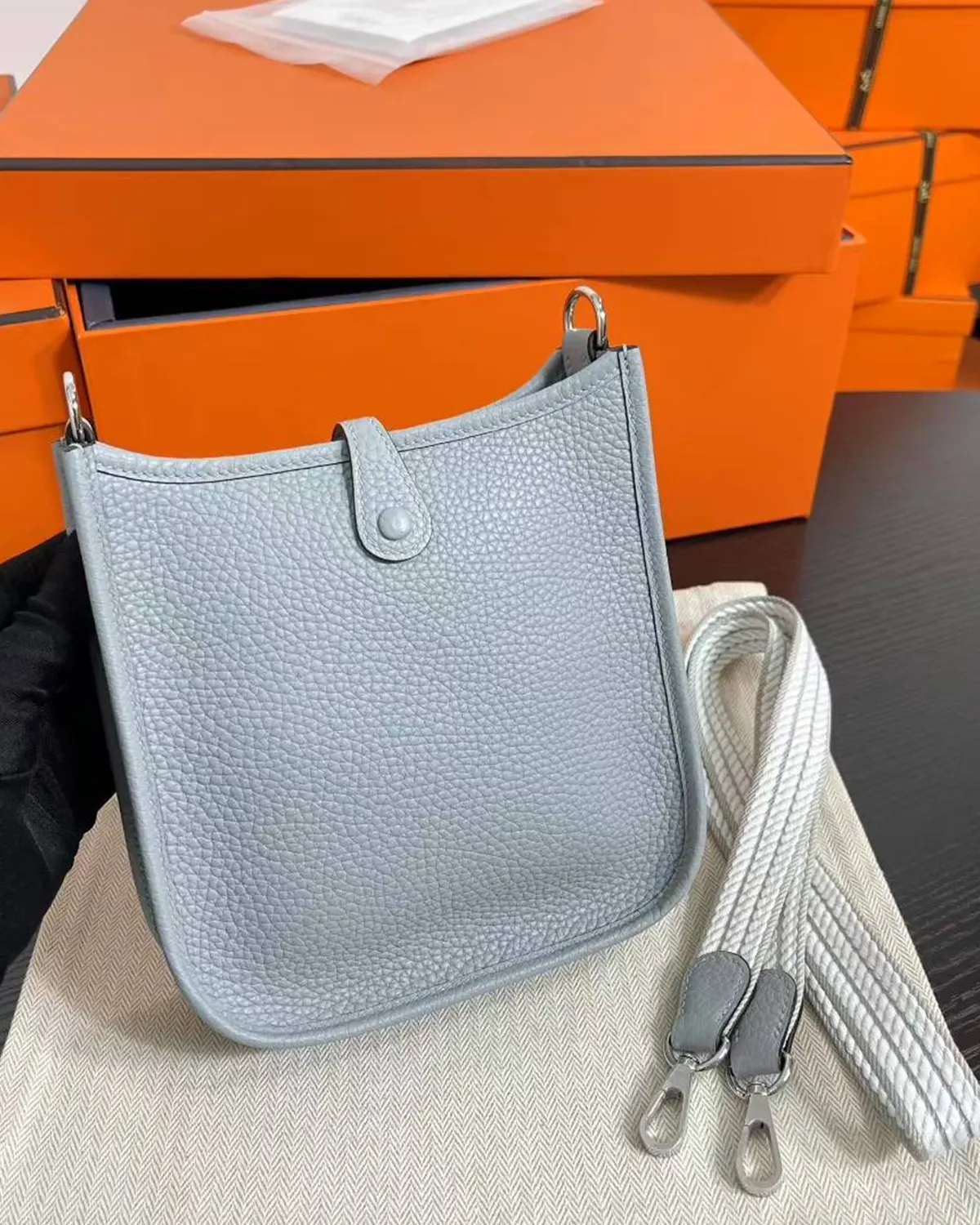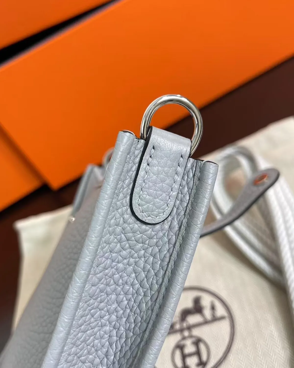 The body is crafted from “Clemence” bull calf, a leather cherished for its matte, powdery finish and heavy grain. The color “Bleu Lin” is a complex, shifting shade—sometimes appearing as a soft denim, other times as a cool grey. This chameleon-like quality allows it to pair effortlessly with everything from white linen to dark navy wool.