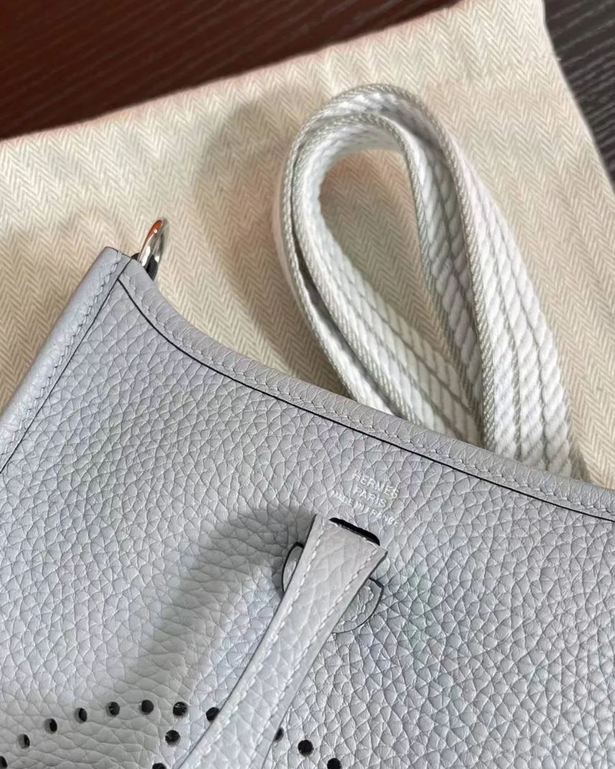 The defining feature of the “Amazone” line is the woven canvas strap. In this edition, it features a harmonious interplay of “Gris Perle” (Pearl Grey) and Blue, adding a sporty, textural contrast to the grained leather body. The wide webbed strap is designed for comfort, sitting lightly on the shoulder without slipping.