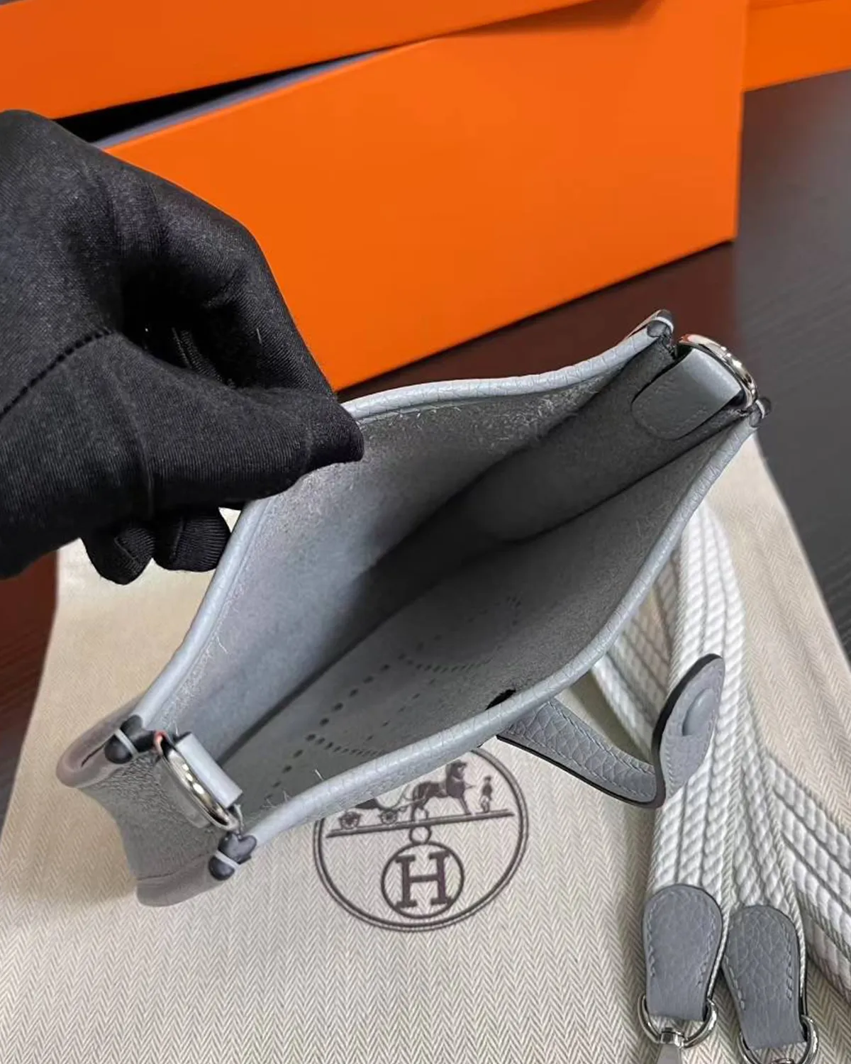 The front panel bears the iconic perforated “H,” a nod to the bag’s history as a carrier for equestrian grooming tools. The ventilation holes now serve as a subtle branding element, instantly recognizable yet understated. Secured by a simple leather tab and snap button on the reverse, it offers quick access to essentials while keeping a clean, open silhouette.