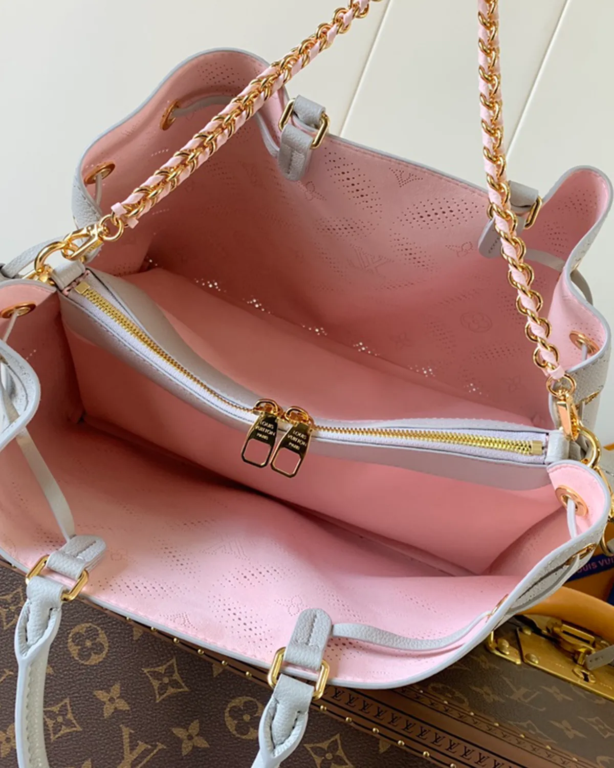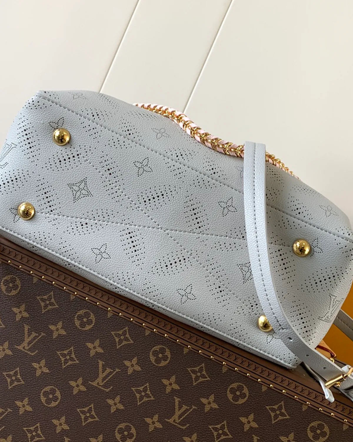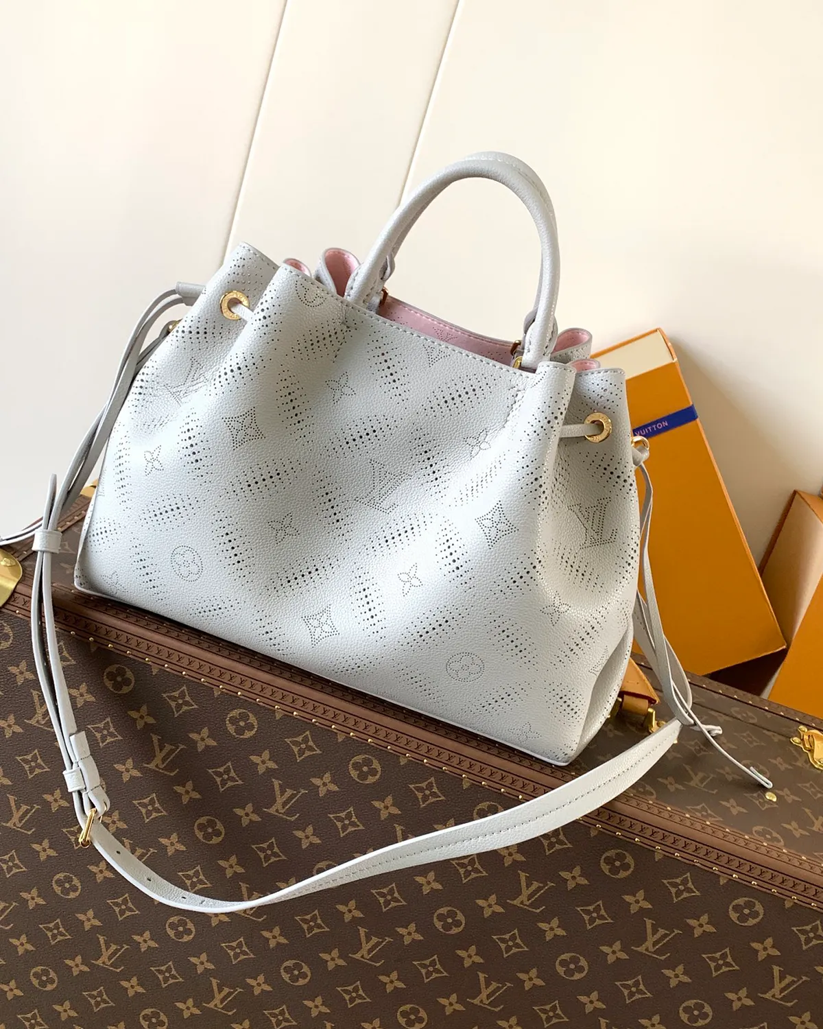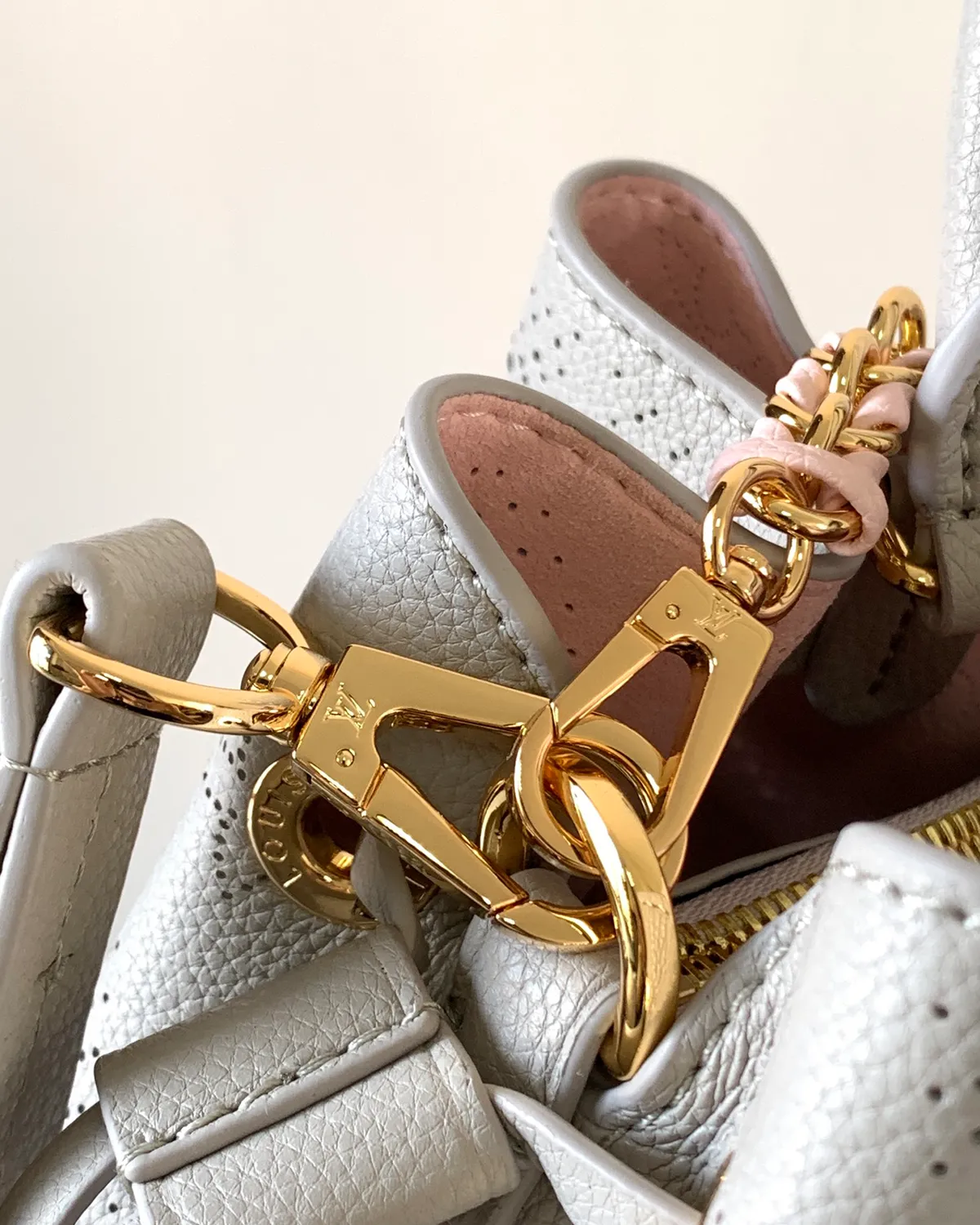 The defining feature is the “Mahina” leather. Premium drummed calfskin is precision-perforated with thousands of tiny holes to recreate the iconic monogram pattern. This technique is subtle and sophisticated, visible only upon closer inspection, offering a discreet way to wear the logo.