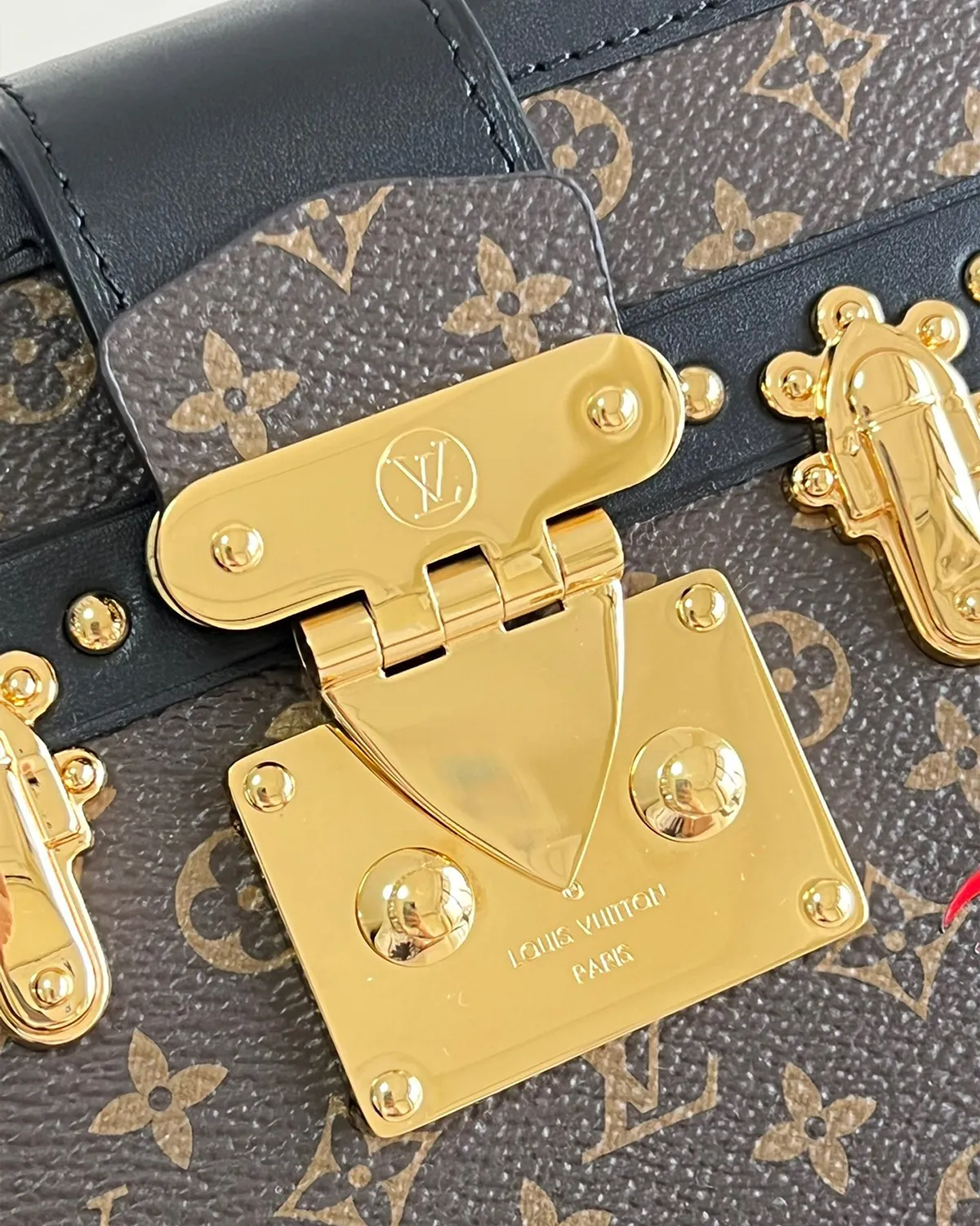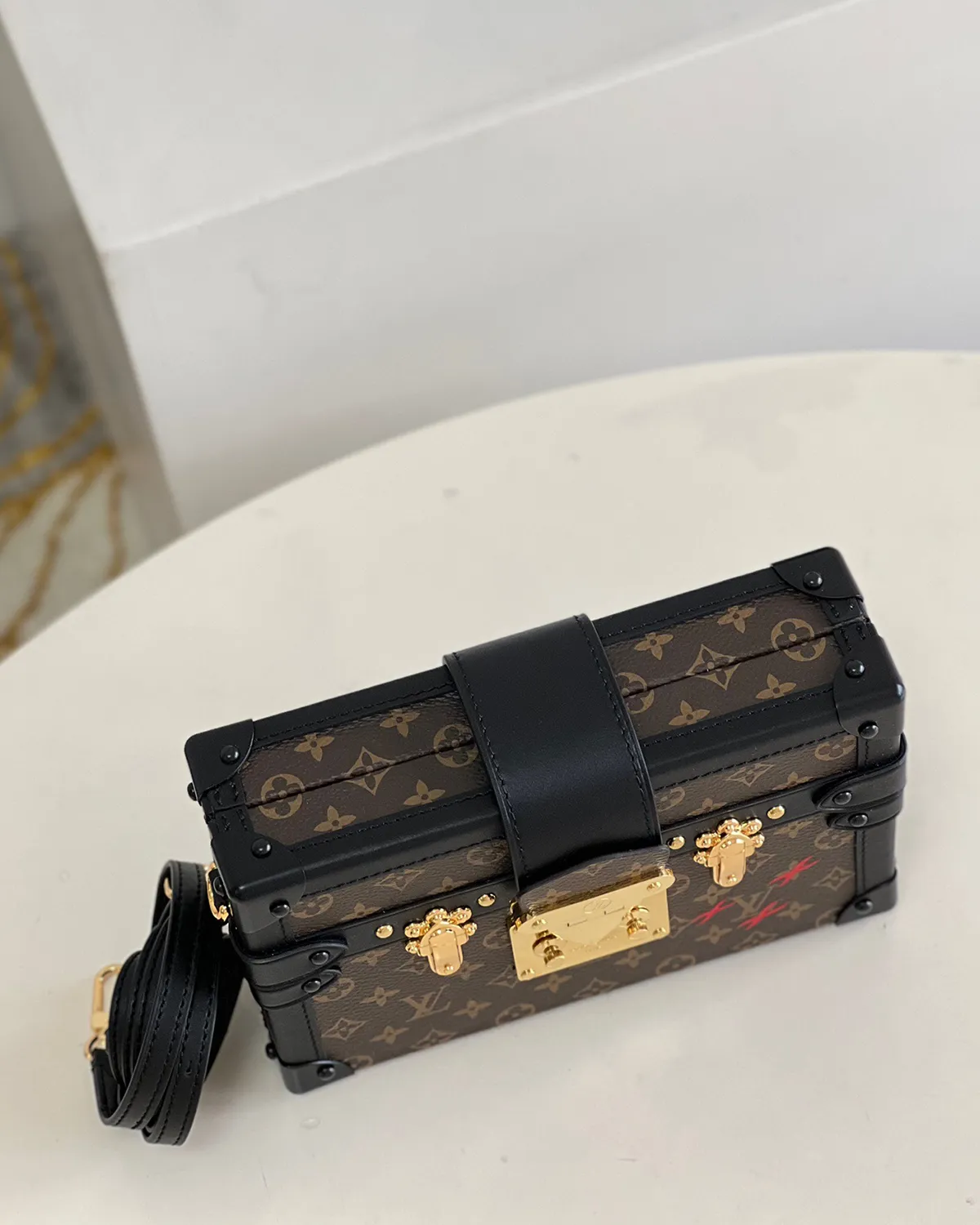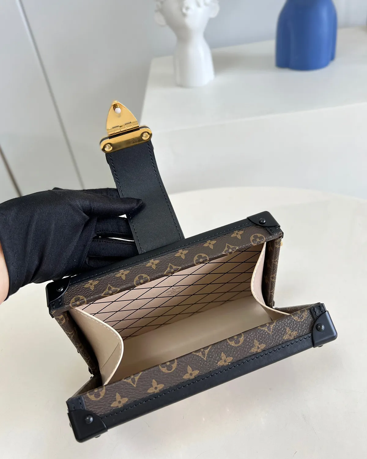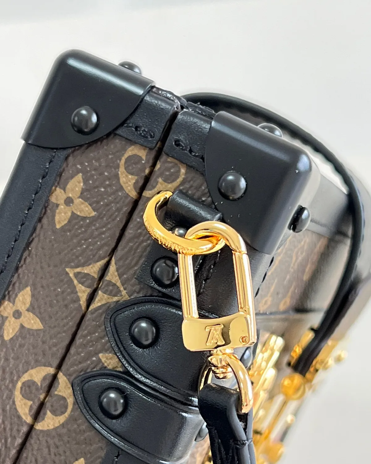 Unlike soft leather bags, this piece maintains a rigid, boxy silhouette constructed from wood and leather, exactly like its larger ancestors. The body is wrapped in the iconic Monogram coated canvas, framed by deep black smooth calfskin leather trim. The corners are reinforced with riveted brackets, ensuring the bag remains pristine even with daily wear.