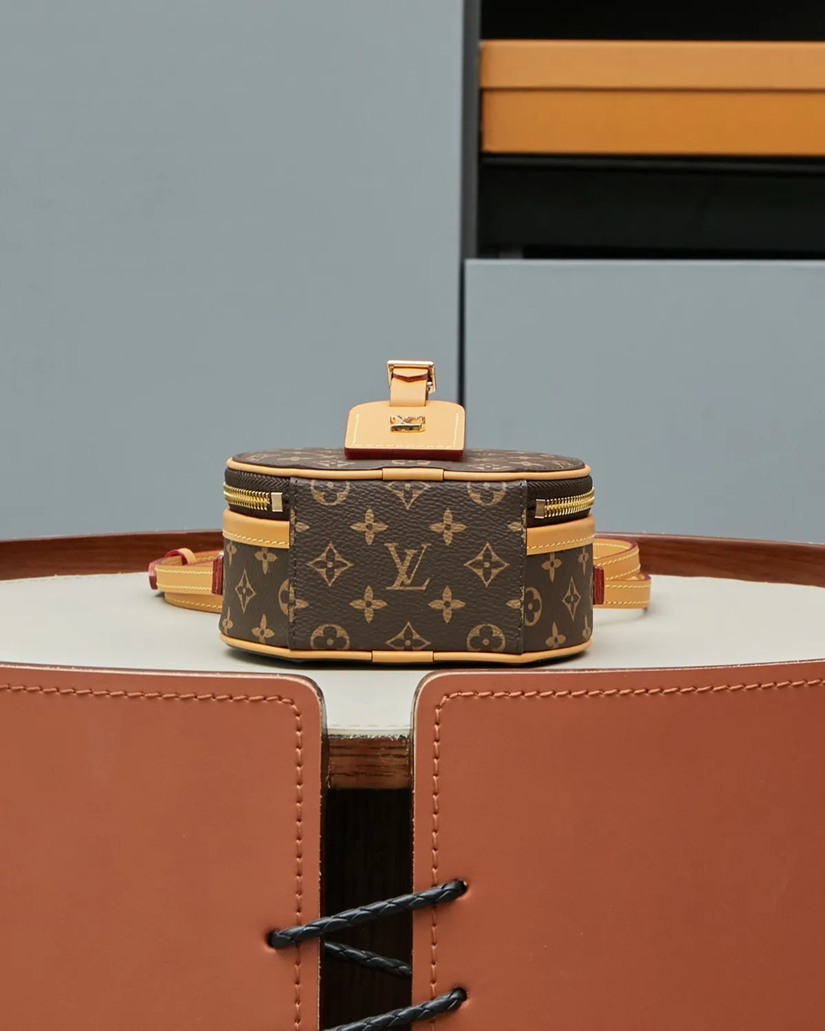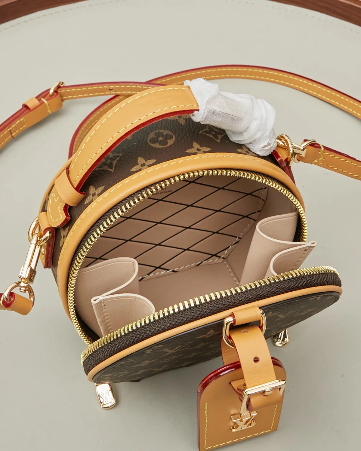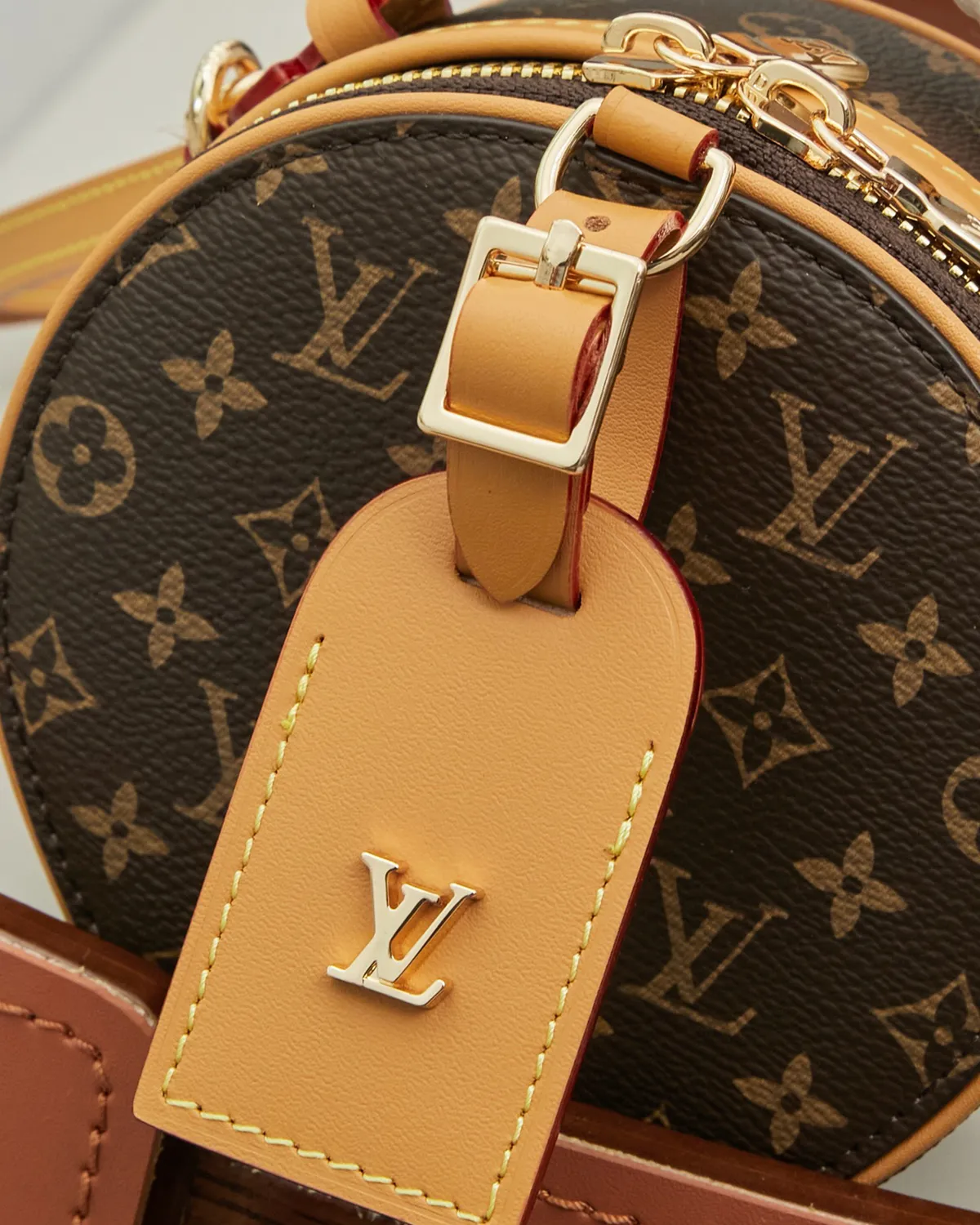 The structured body is wrapped in the legendary coated canvas, ensuring the round shape remains perfect over time. The centerpiece is the rectangular luggage tag crafted from natural cowhide leather (Vachetta). Adorned with a gold-tone metallic logo, this untreated leather adds a touch of authenticity and will develop a warm patina with age.