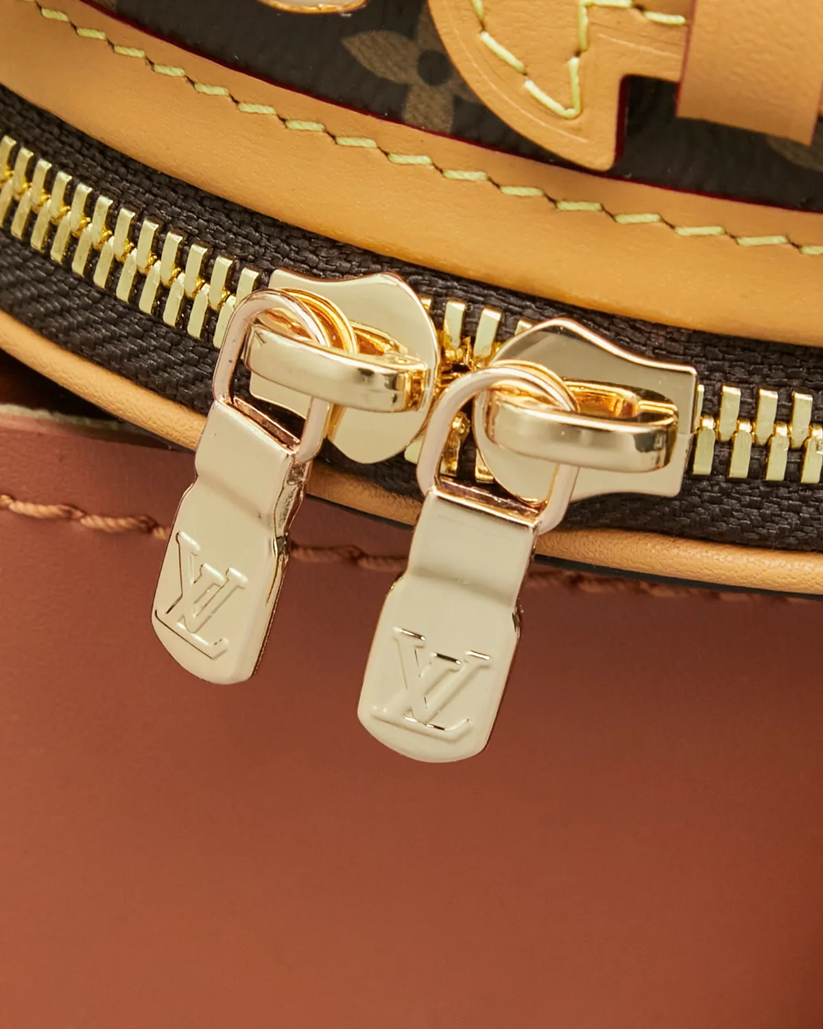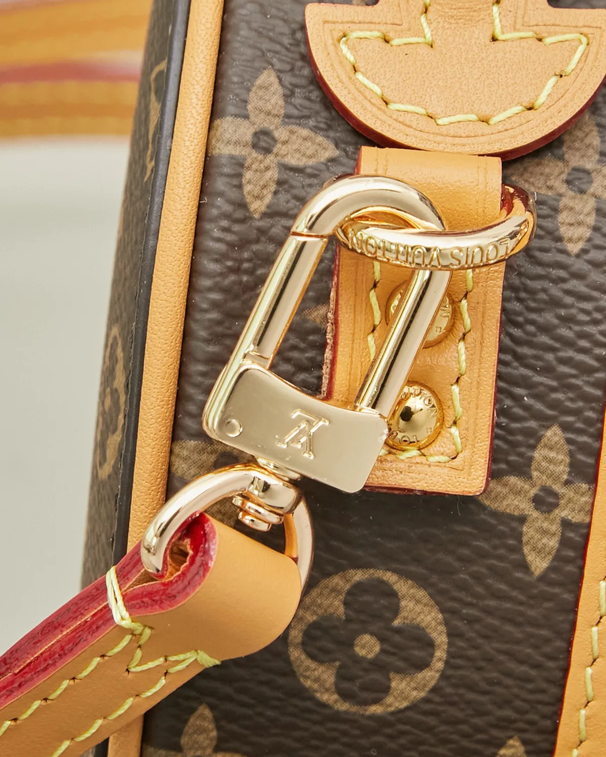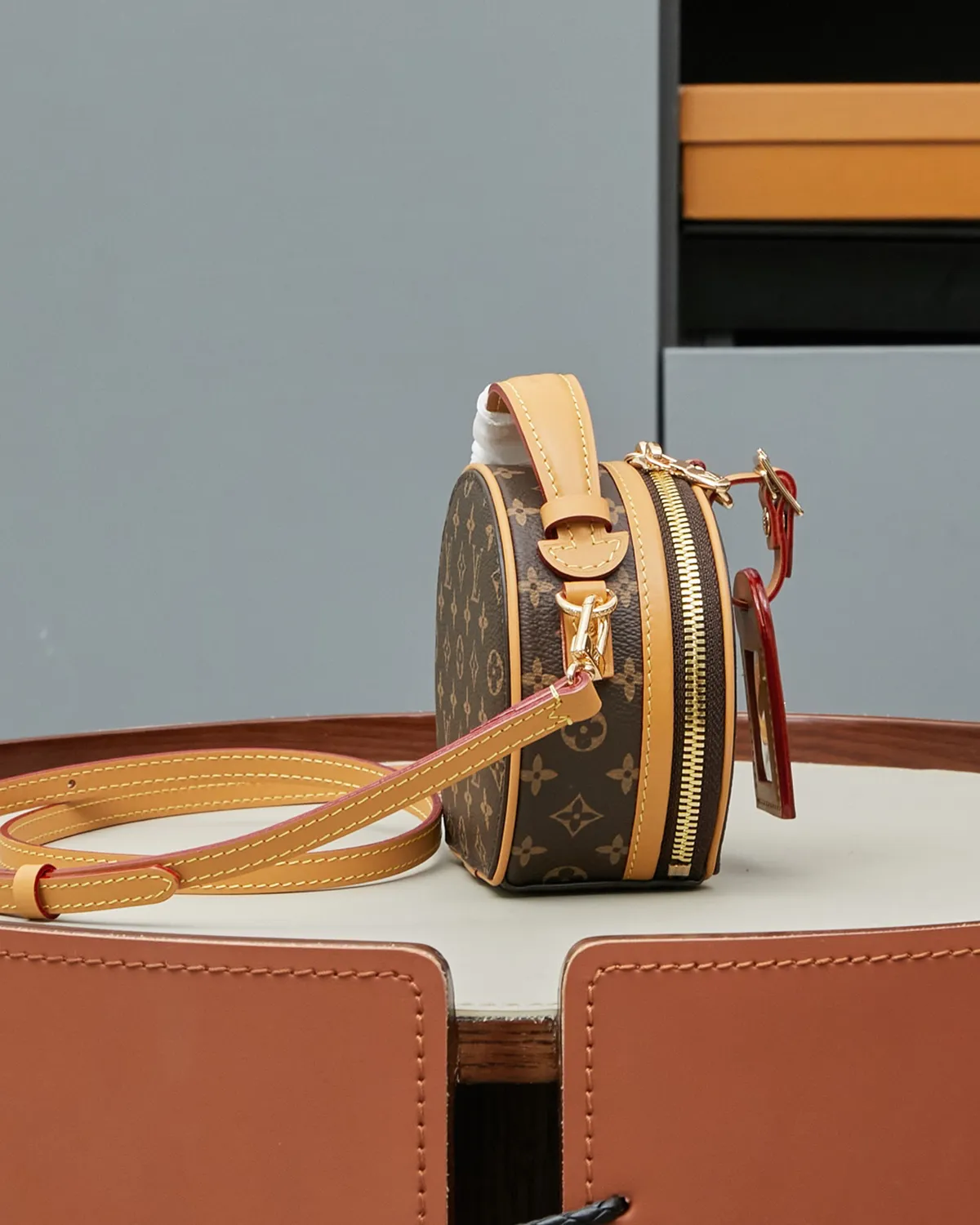 The structured body is wrapped in the legendary coated canvas, ensuring the round shape remains perfect over time. The centerpiece is the rectangular luggage tag crafted from natural cowhide leather (Vachetta). Adorned with a gold-tone metallic logo, this untreated leather adds a touch of authenticity and will develop a warm patina with age.