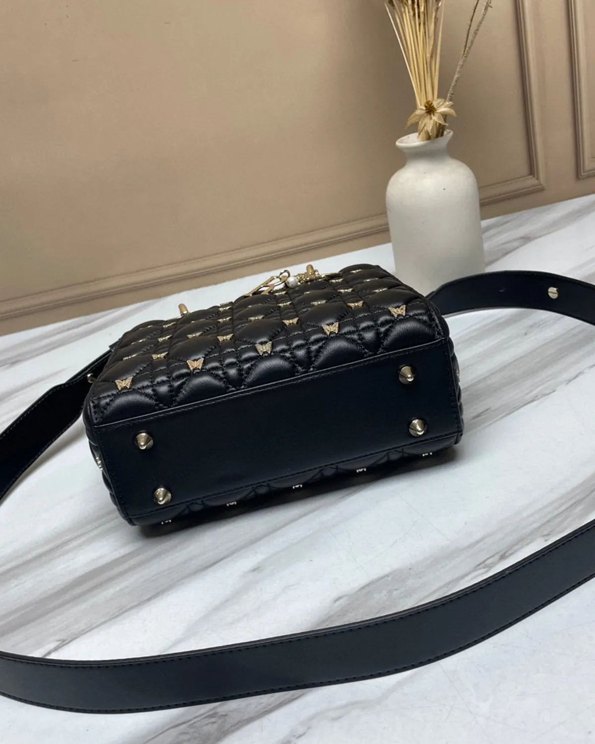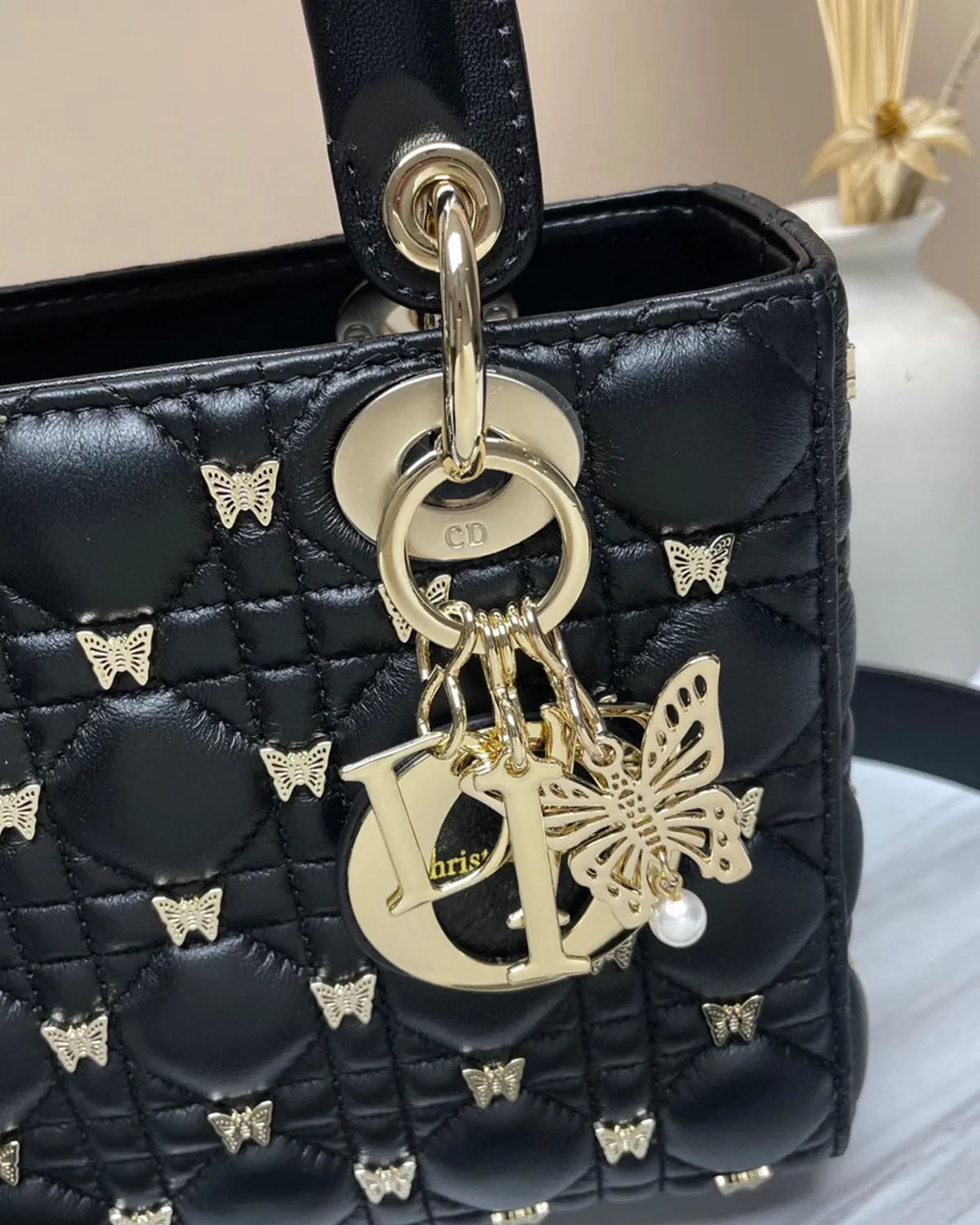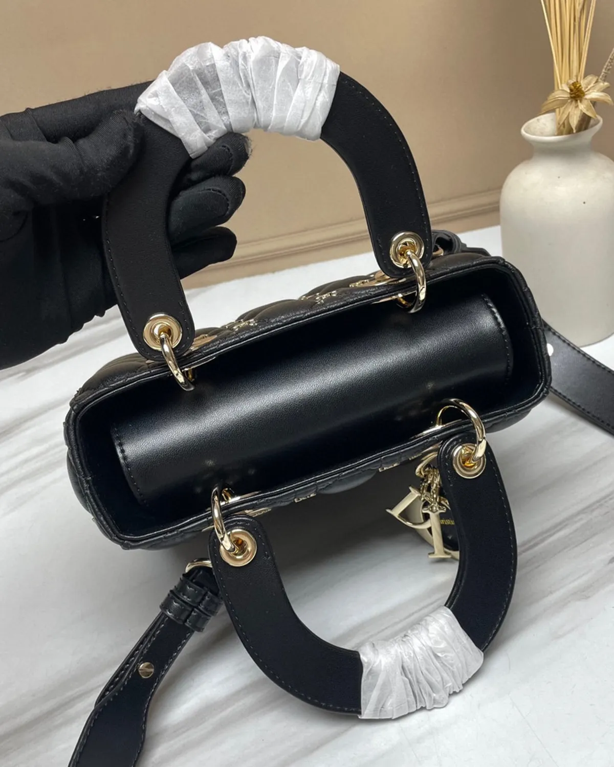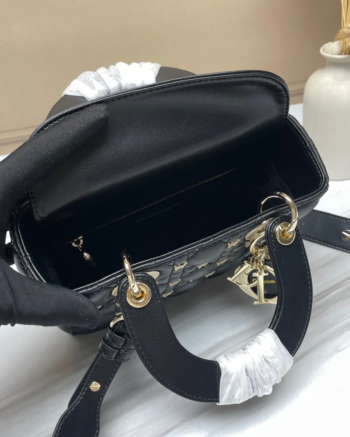 The body is wrapped in the finest lambskin, chosen for its silky touch and deep black luster. The defining feature is the “Cannage” stitching—a geometric grid of diagonals and perpendiculars inspired by the rattan weaving of Napoleon III chairs used in the creator’s first salons. This quilting gives the leather a pillowy, structured volume that is instantly recognizable.