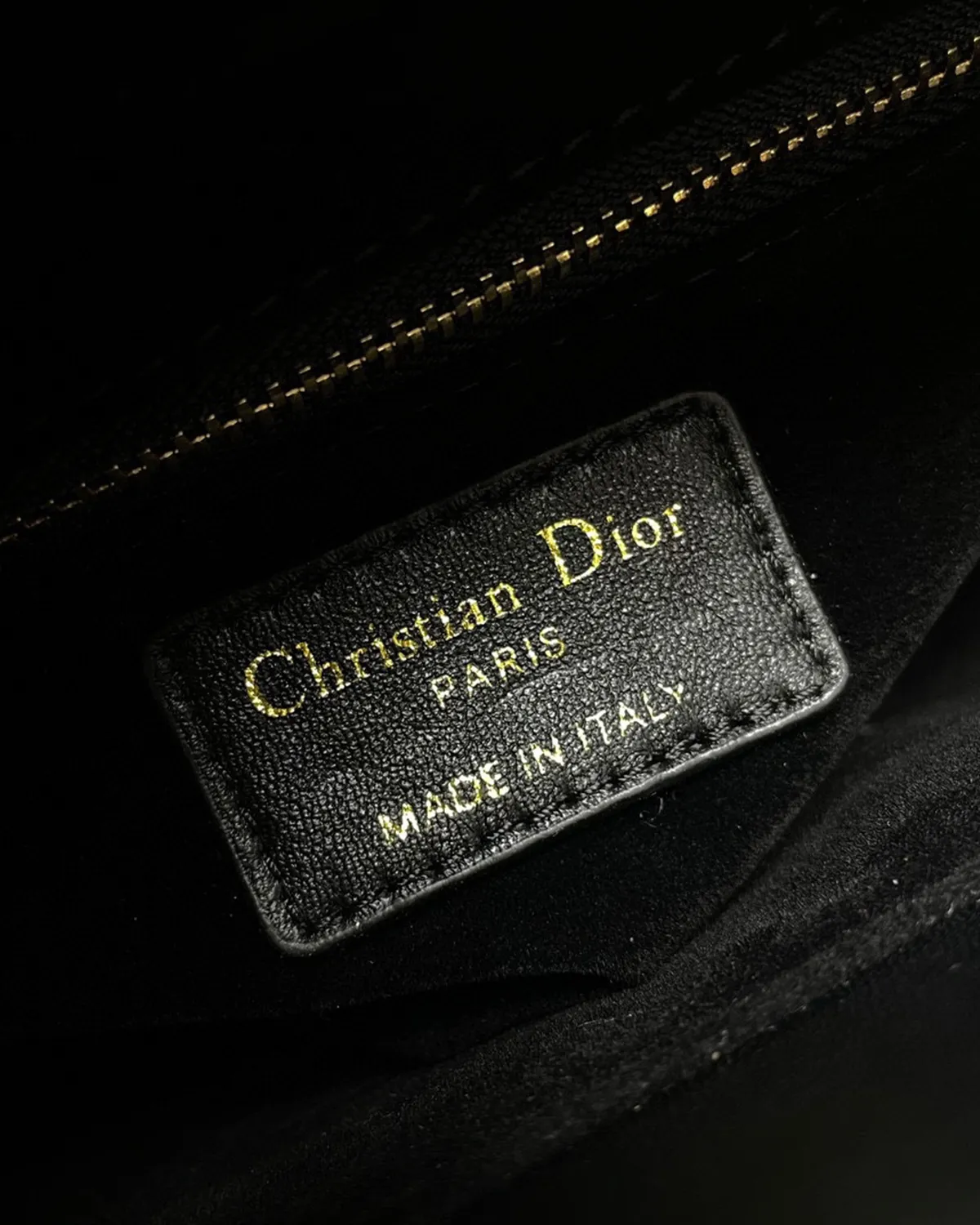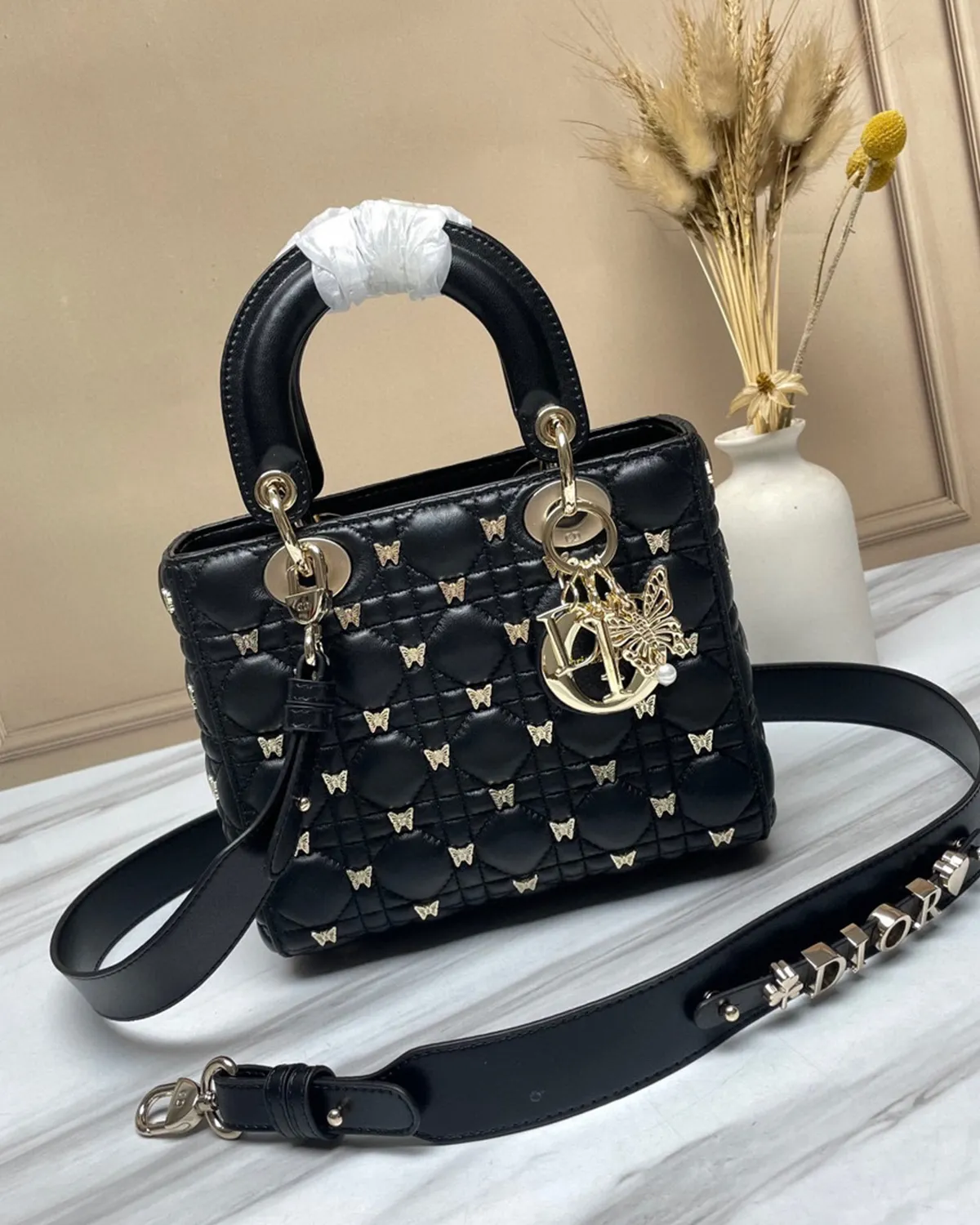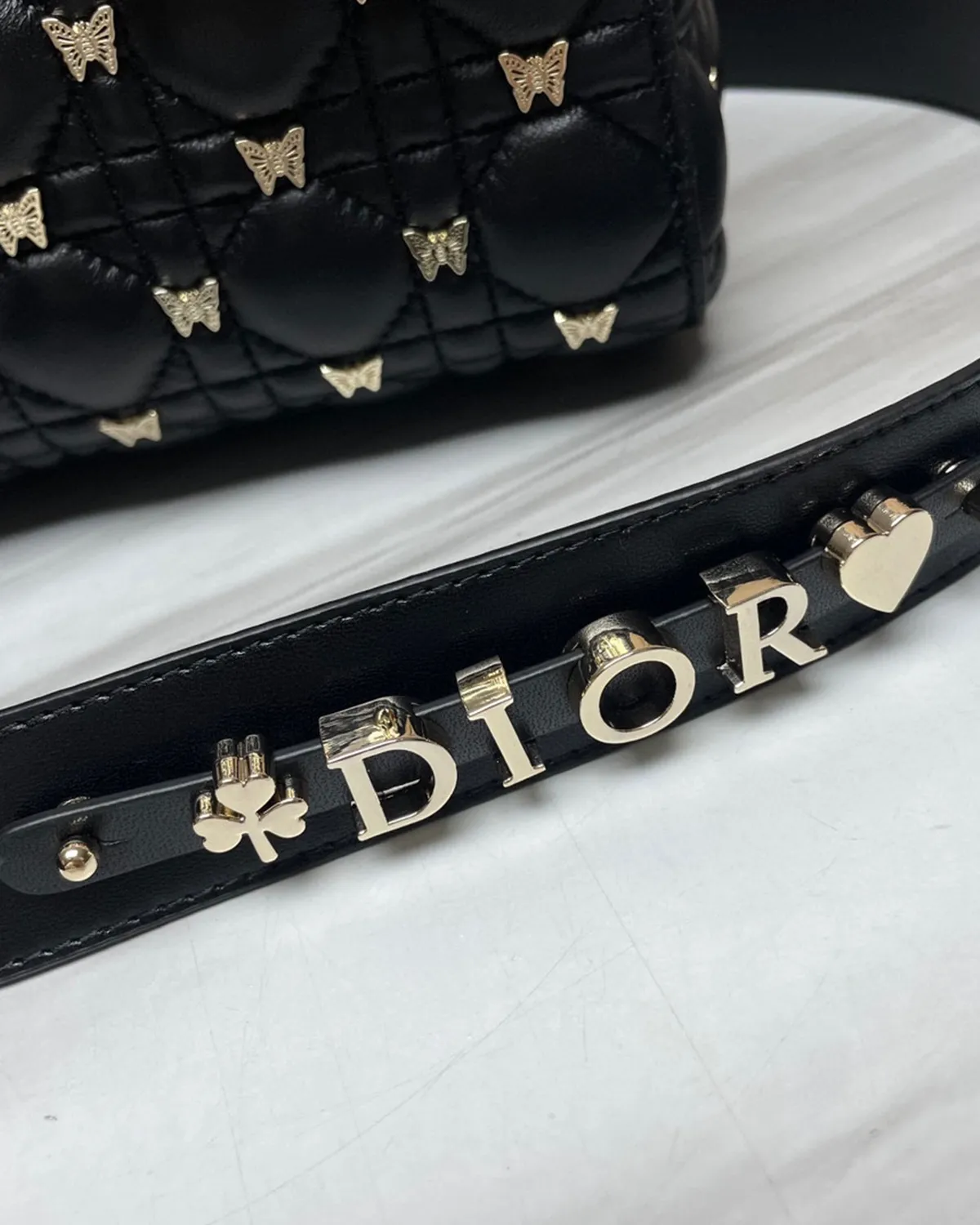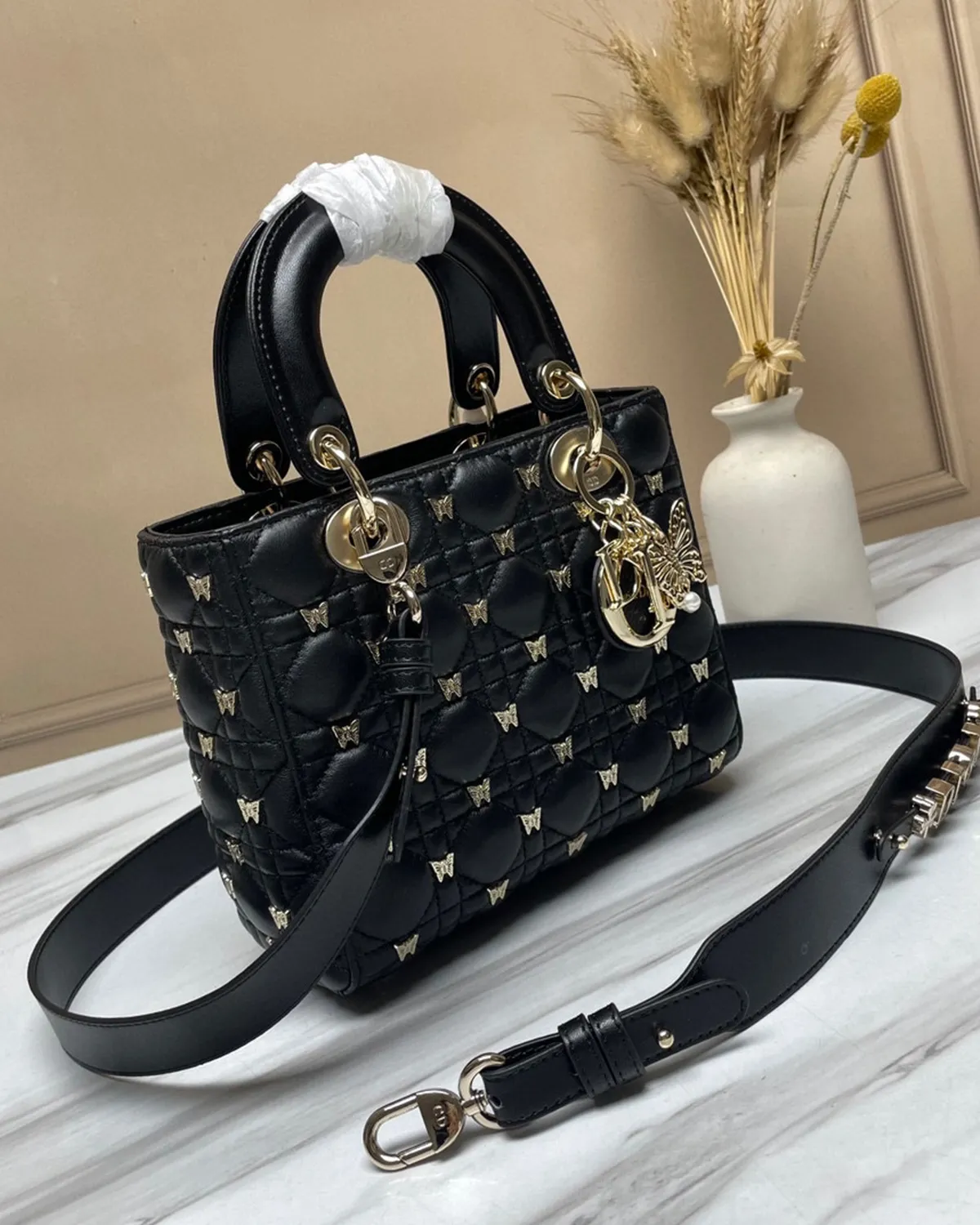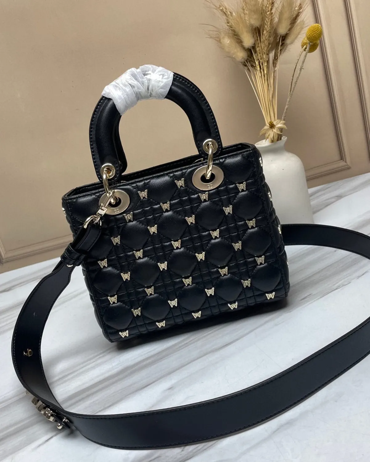 The body is wrapped in the finest lambskin, chosen for its silky touch and deep black luster. The defining feature is the “Cannage” stitching—a geometric grid of diagonals and perpendiculars inspired by the rattan weaving of Napoleon III chairs used in the creator’s first salons. This quilting gives the leather a pillowy, structured volume that is instantly recognizable.