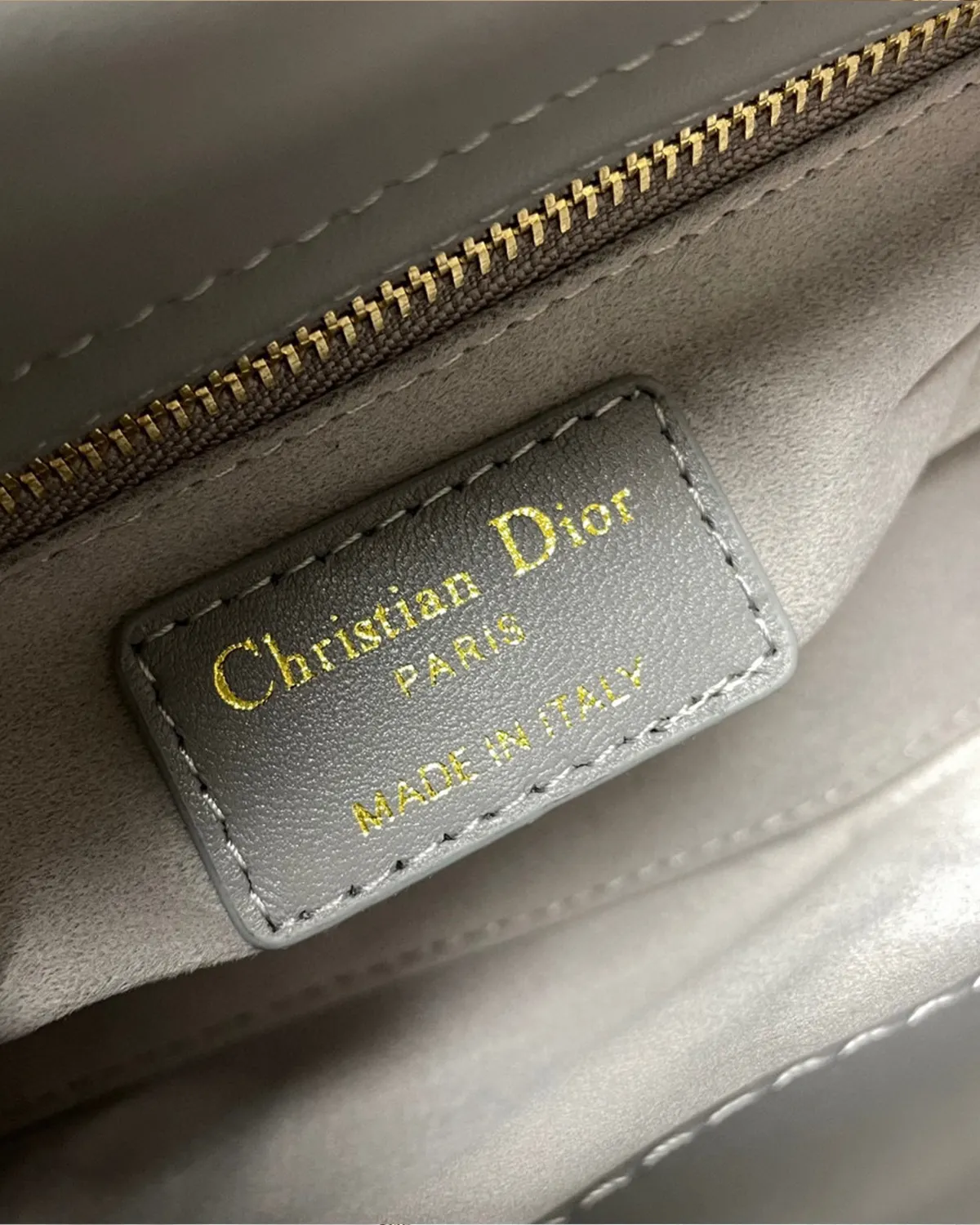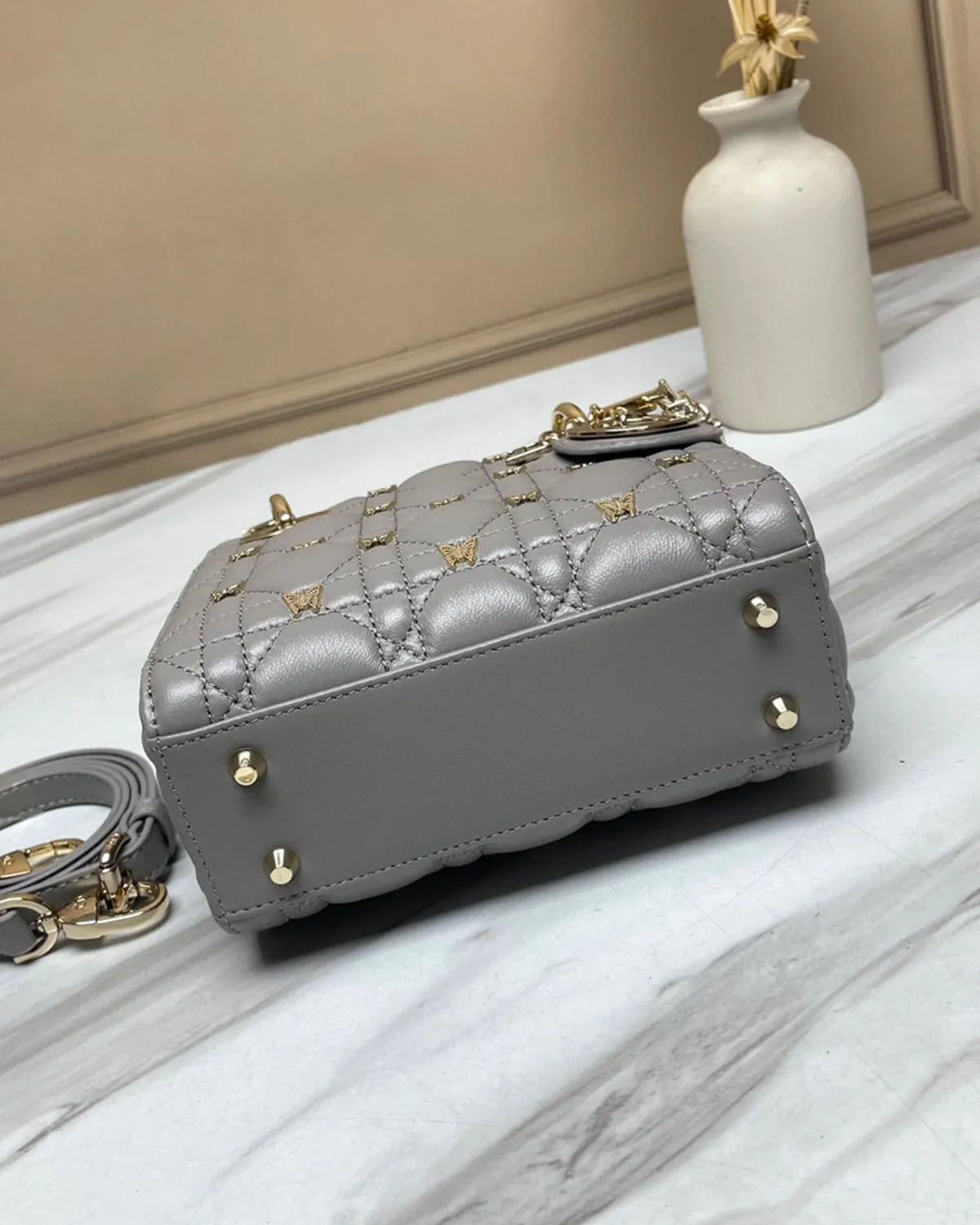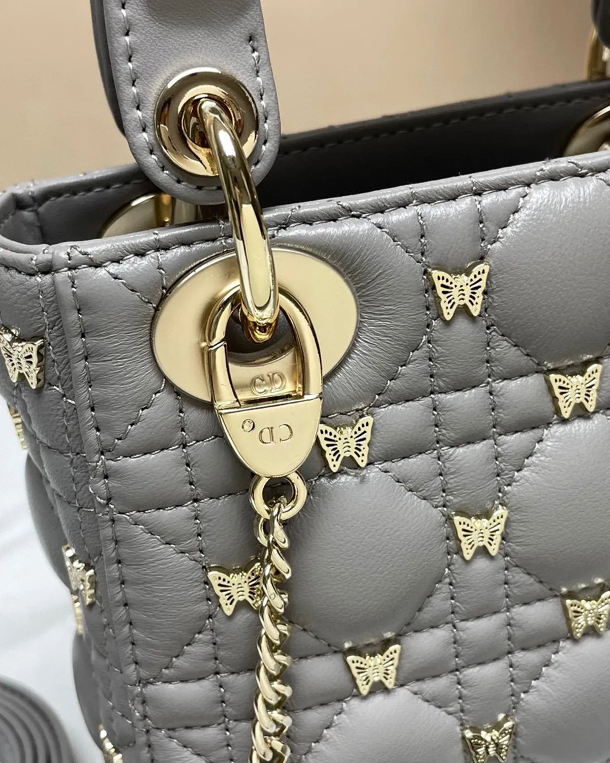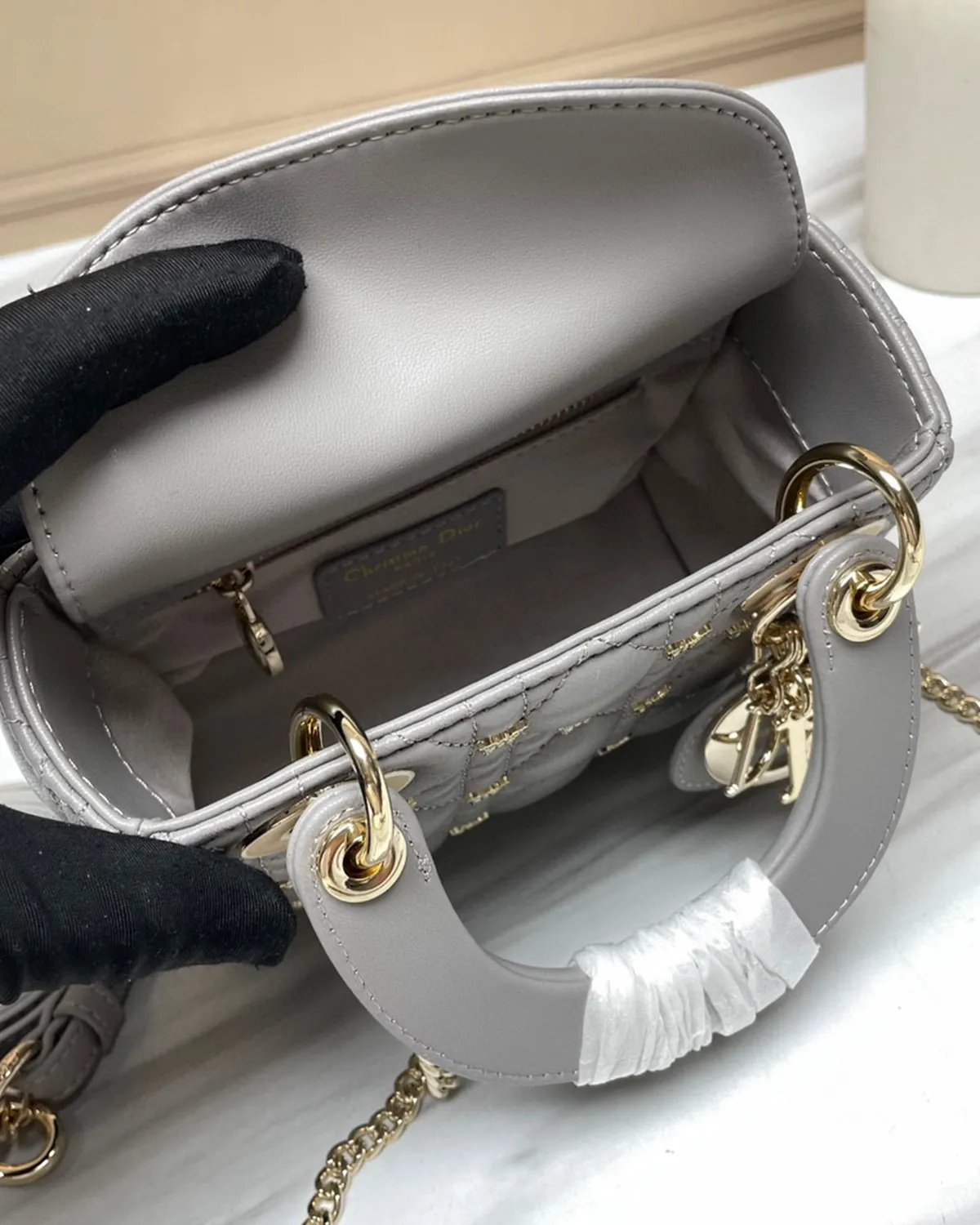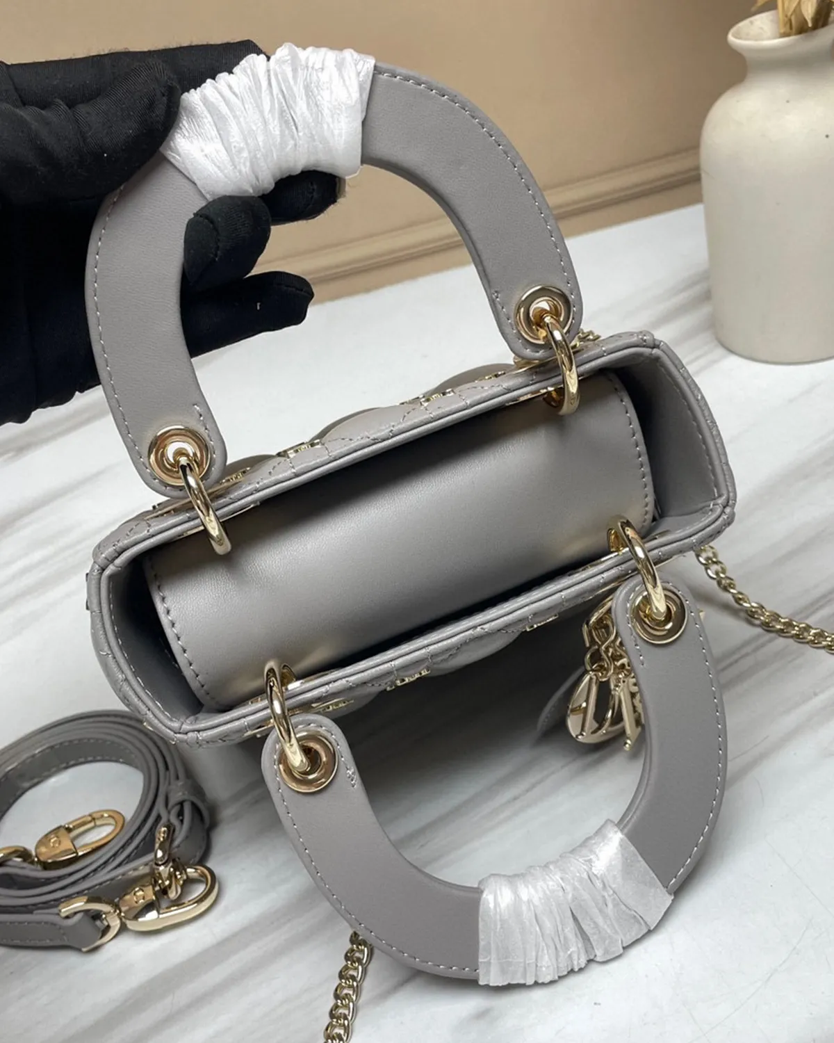 The body is wrapped in the finest lambskin, chosen for its smooth grain and ability to hold color deeply. The “Cannage” topstitching creates a quilted grid of raised lozenges, adding architectural depth to the soft leather. In grey, the shadows created by the quilting are particularly striking, emphasizing the precision of the needlework.