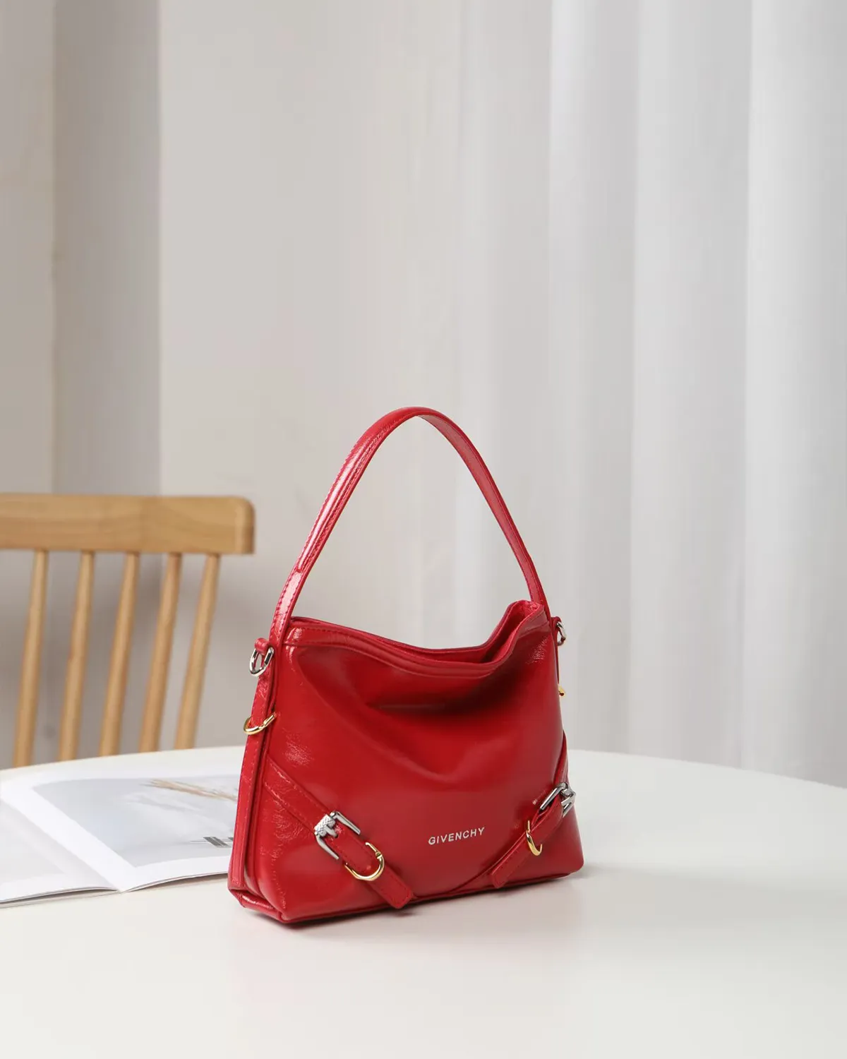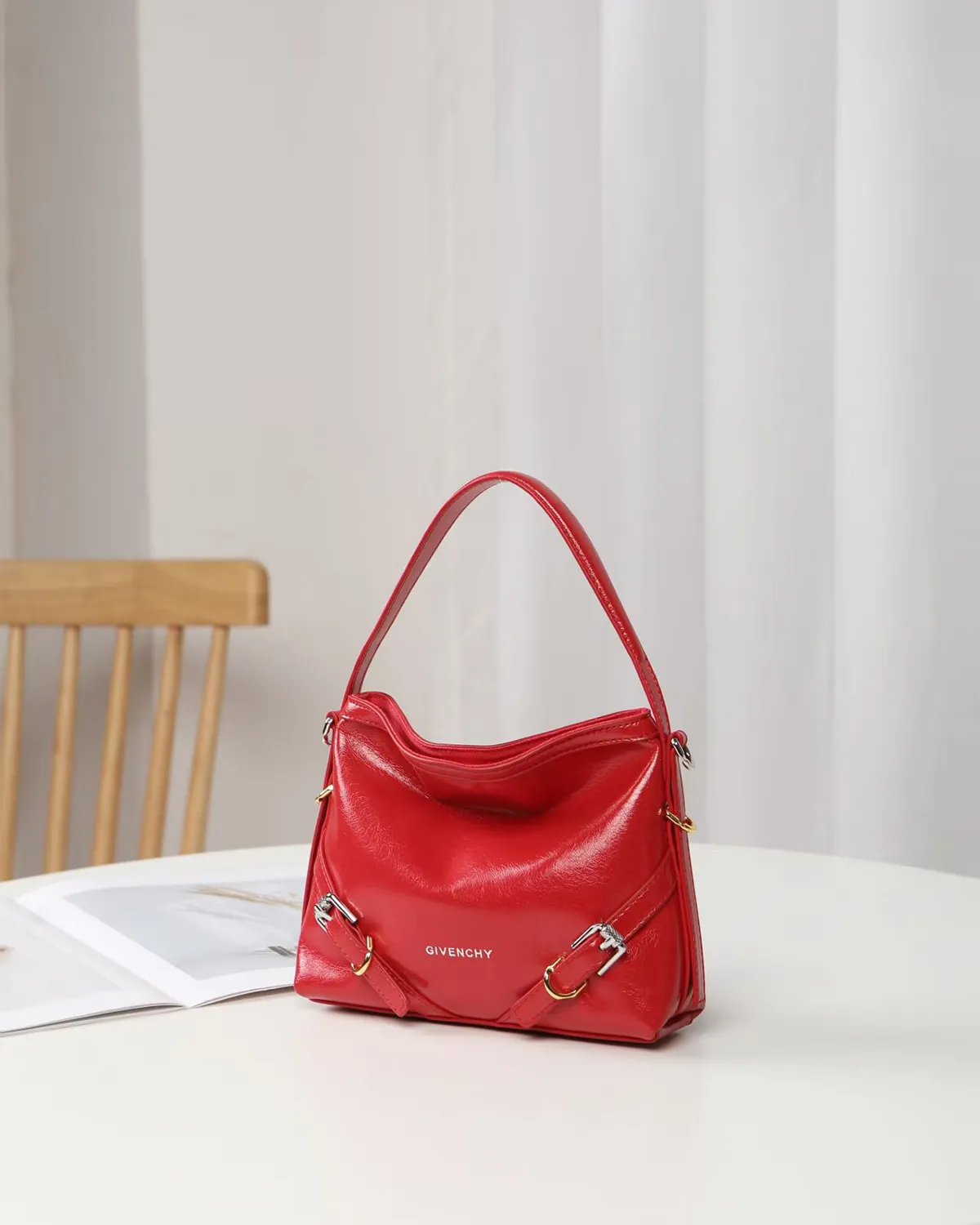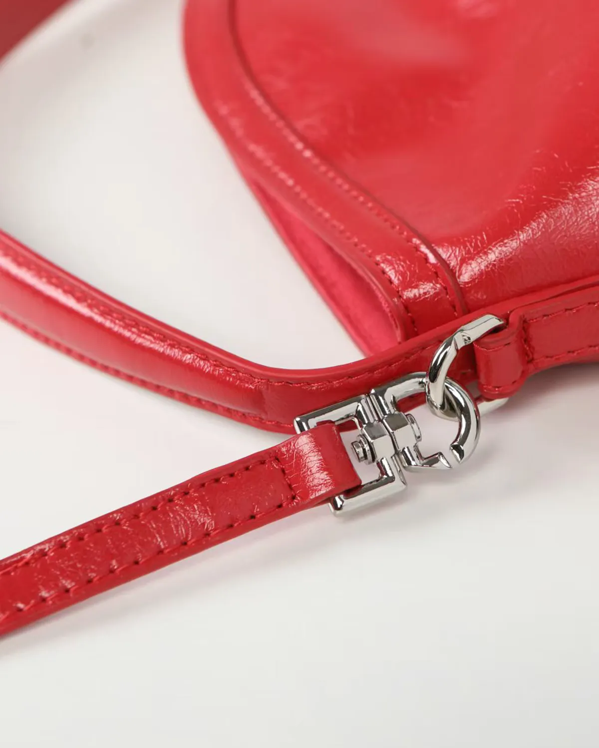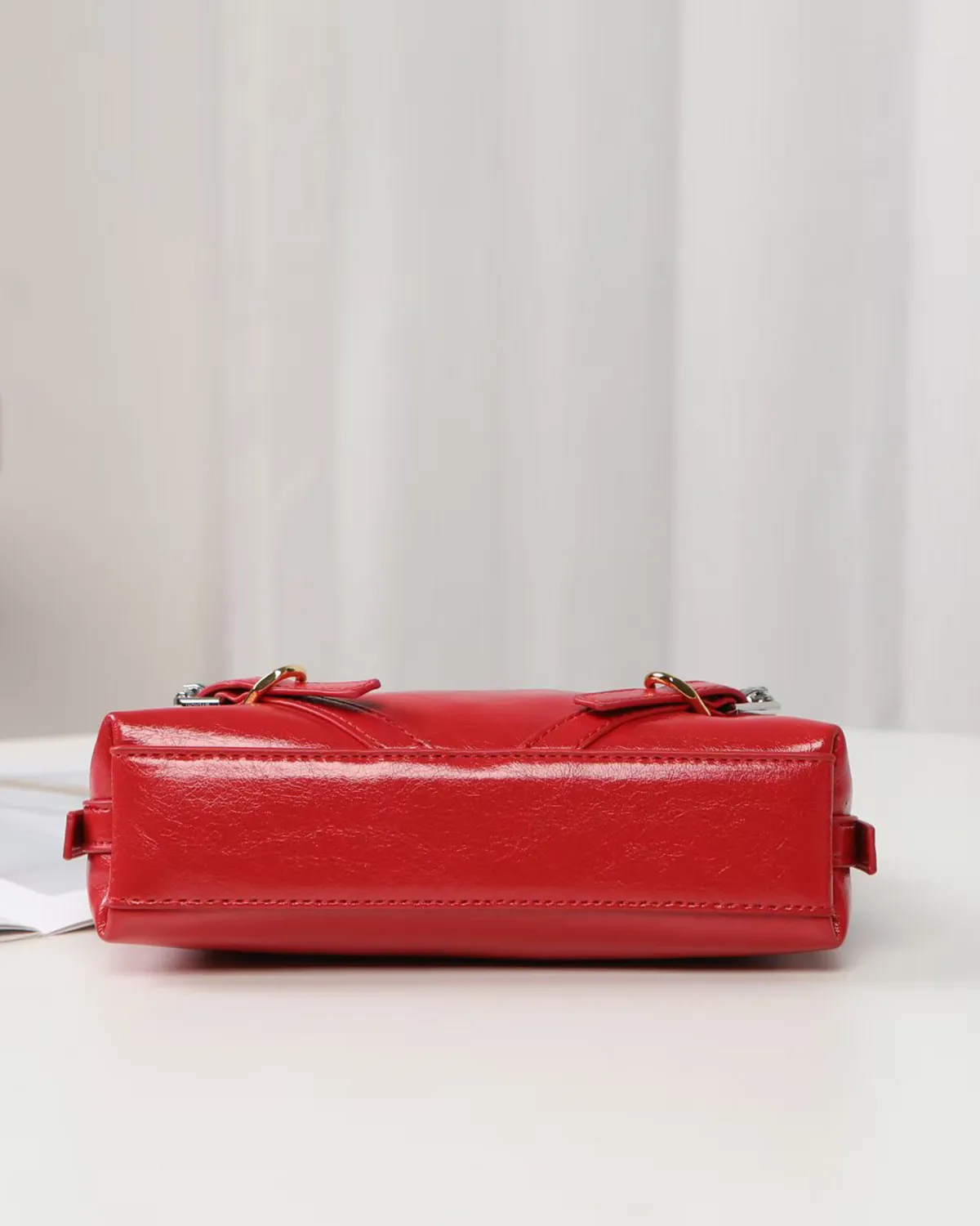 The etched metal buckles are scaled down to fit the petite frame, maintaining the biker aesthetic without overwhelming the bag. The addition of a fine metal chain allows the bag to be carried on the shoulder or by hand like a bracelet bag, adding a flash of shine that complements the mixed-metal hardware.
