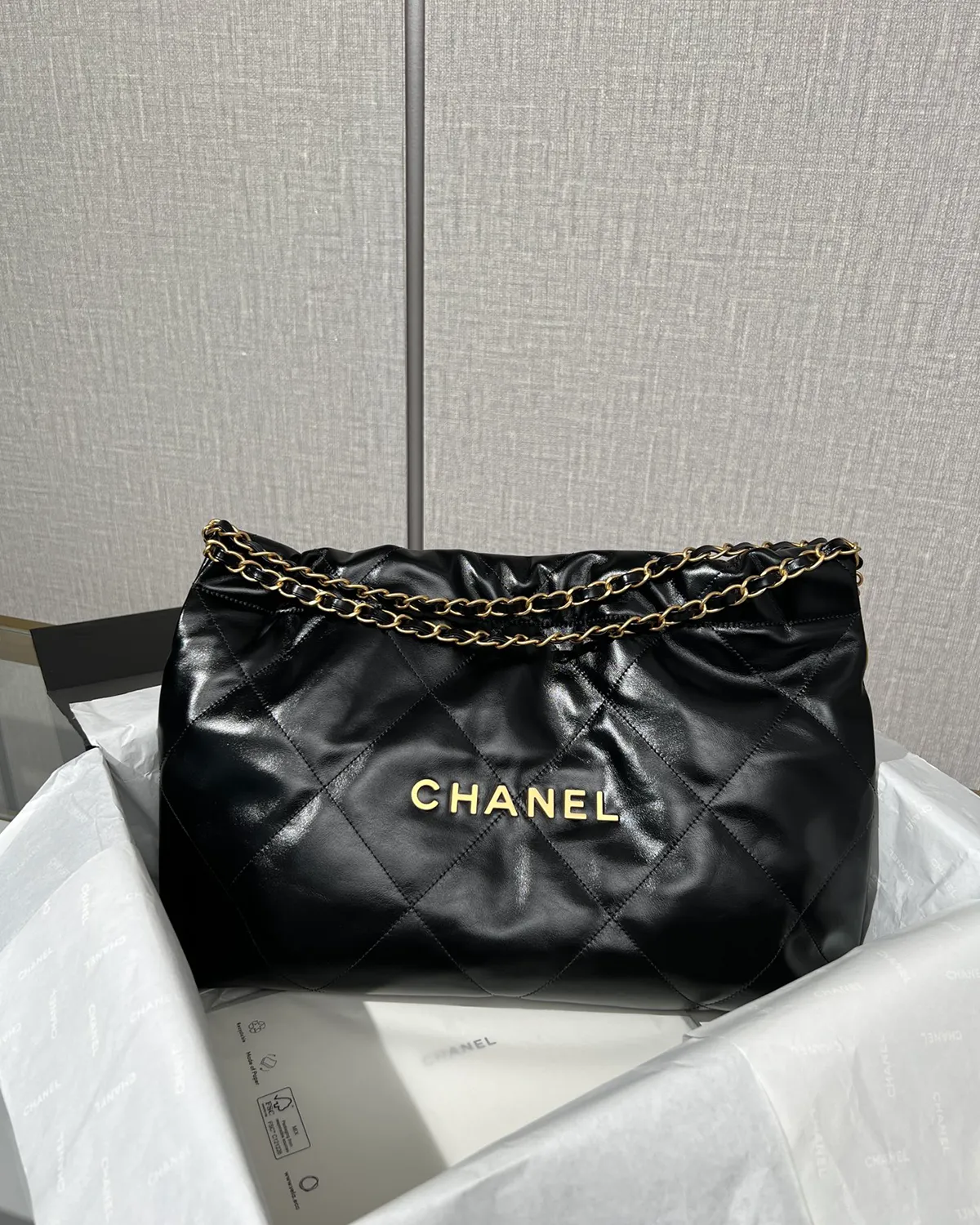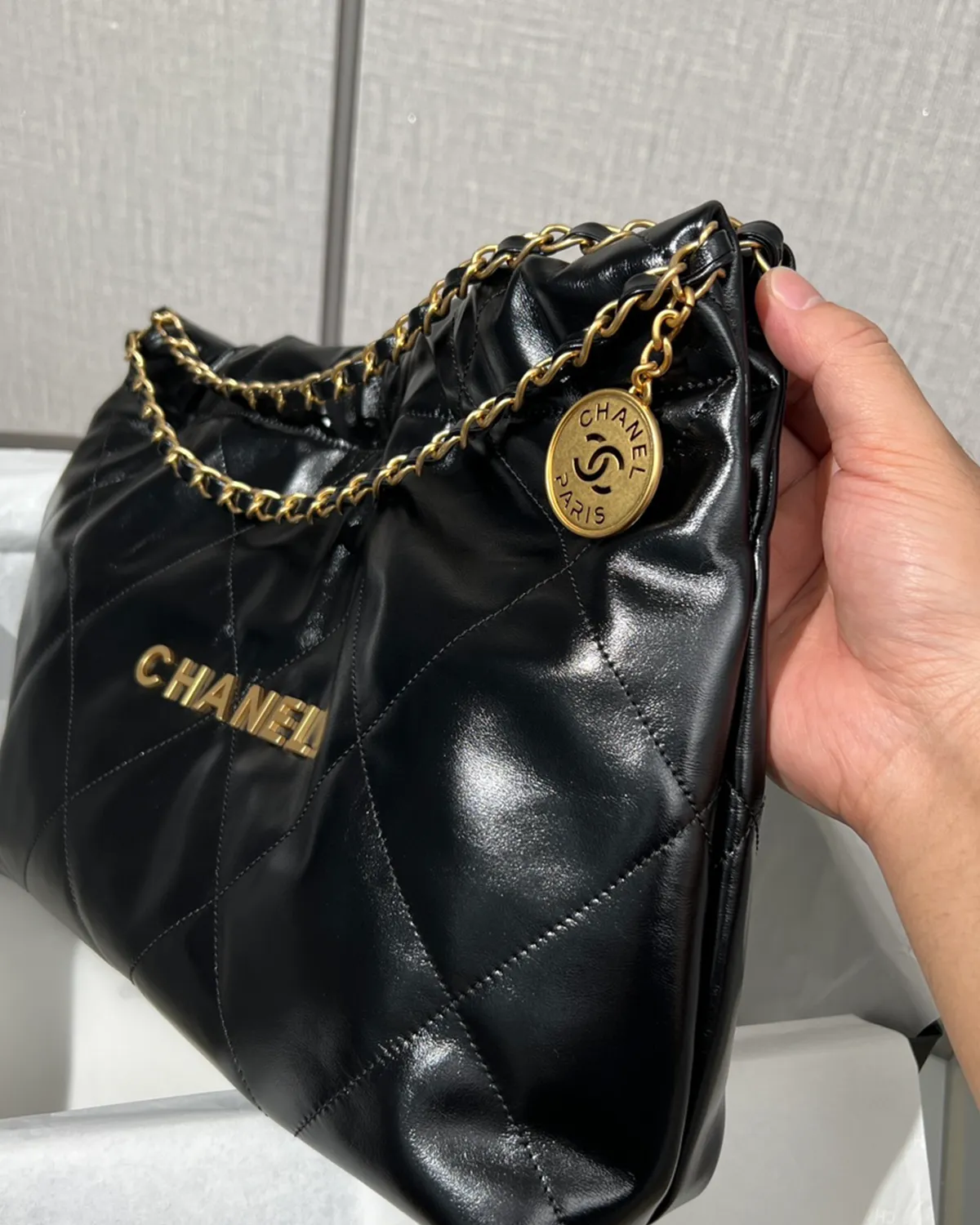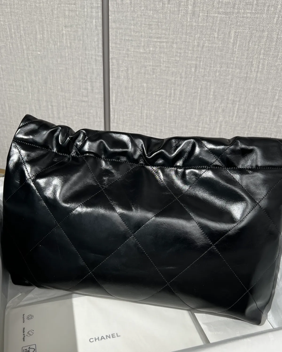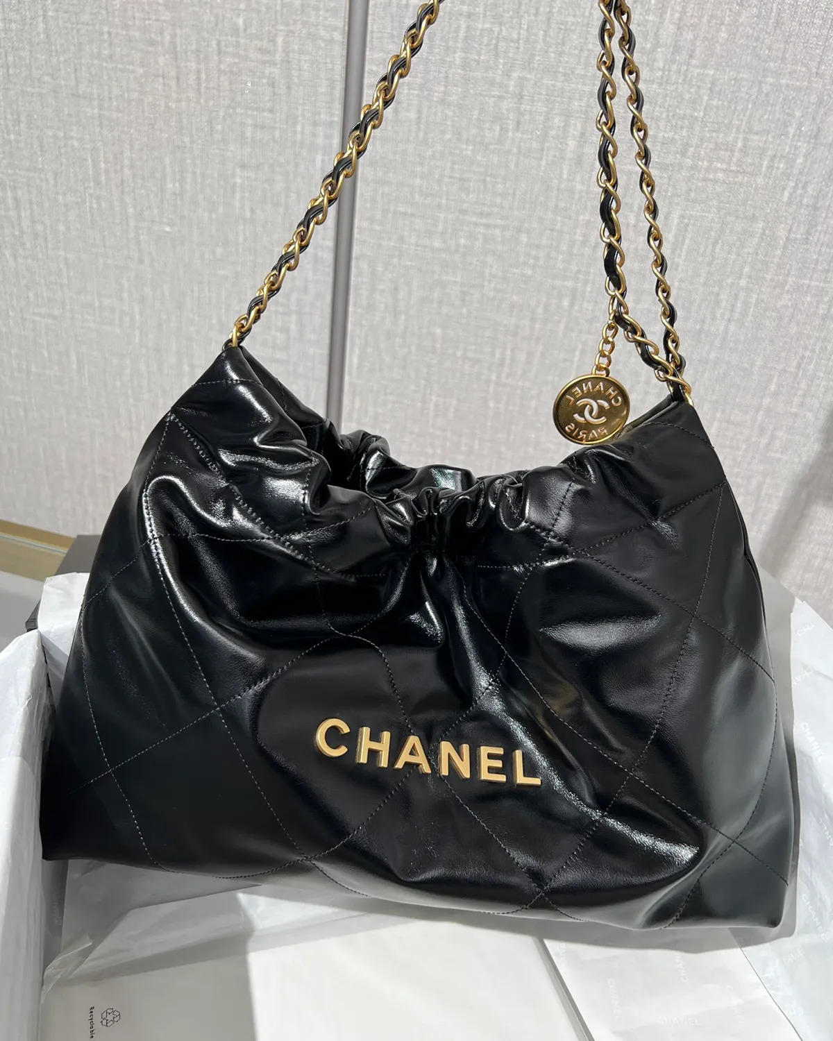 *Note: This item is a high-quality homage inspired by the Chanel 22 Maxi design. It captures the glossy calfskin texture and oversized drawstring aesthetic at an accessible price point.