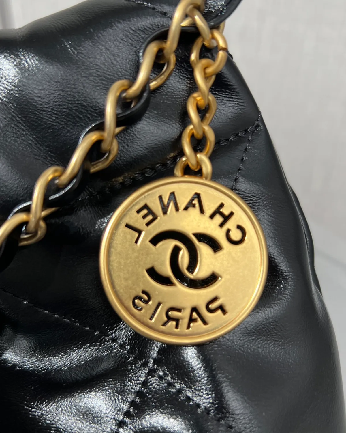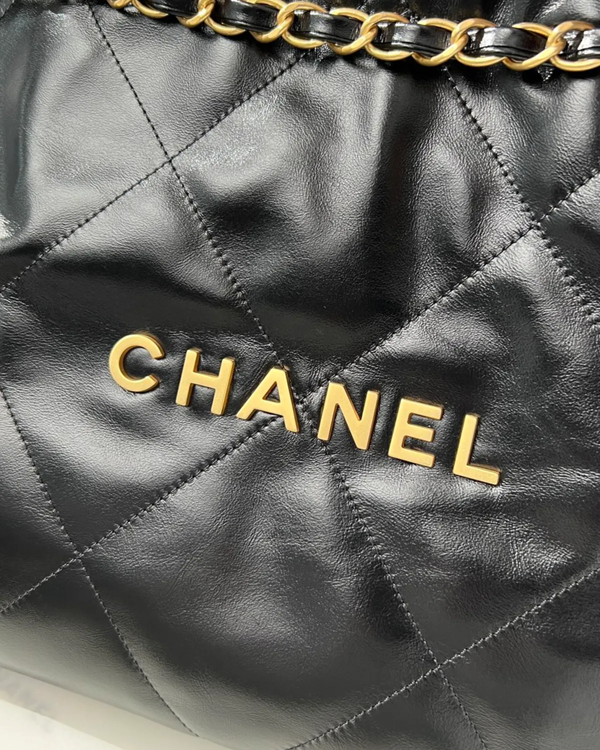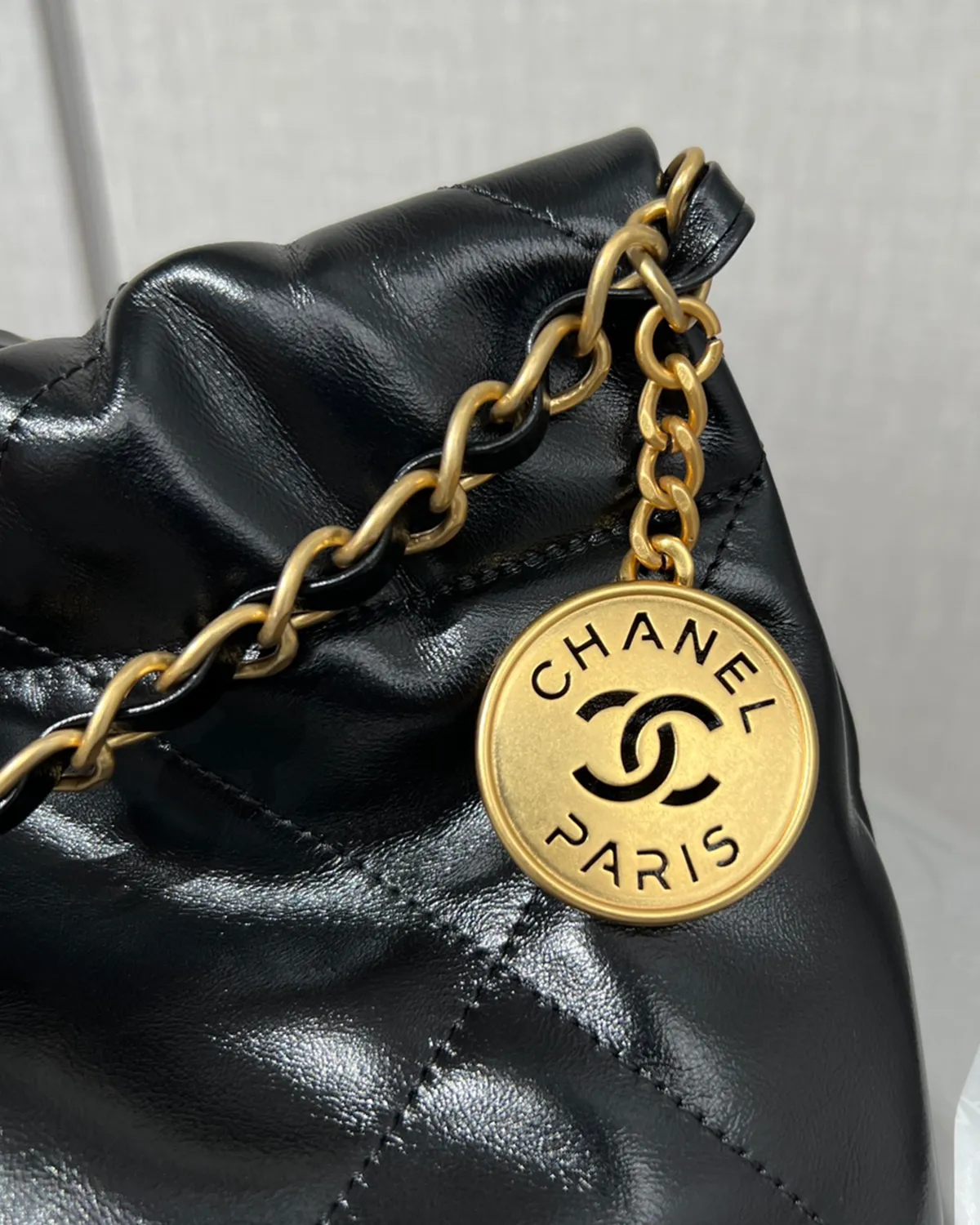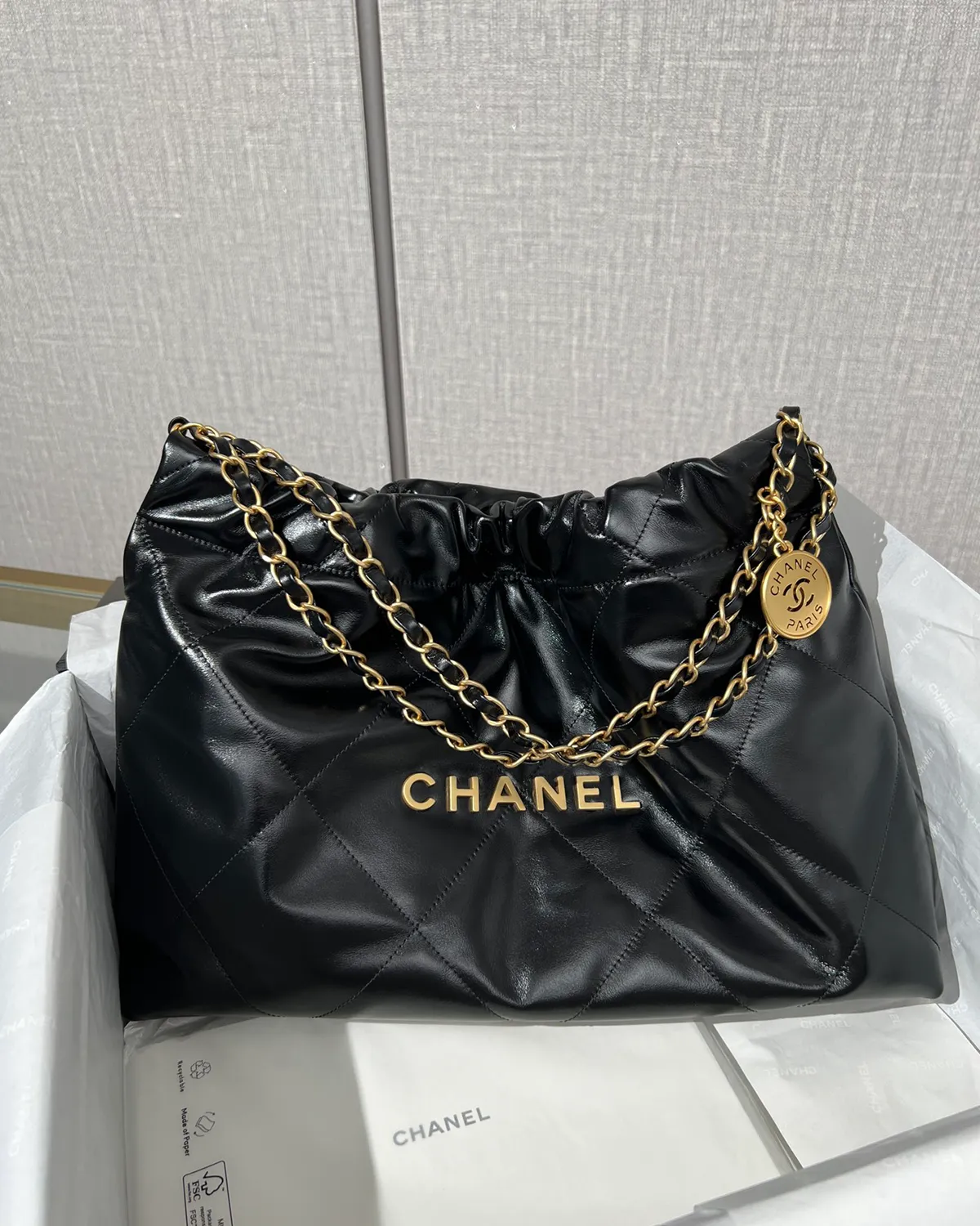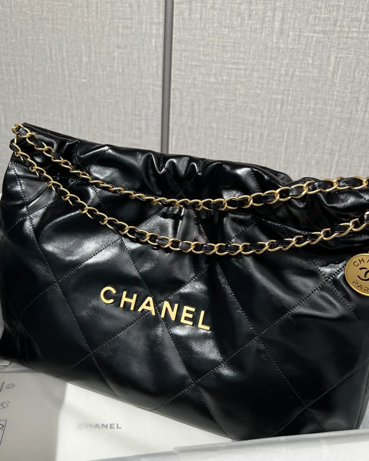 *Note: This item is a high-quality homage inspired by the Chanel 22 Maxi design. It captures the glossy calfskin texture and oversized drawstring aesthetic at an accessible price point.