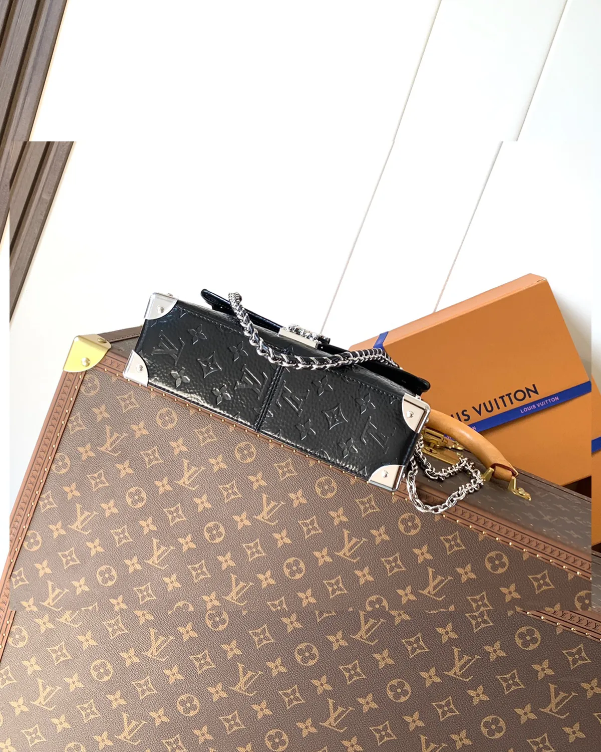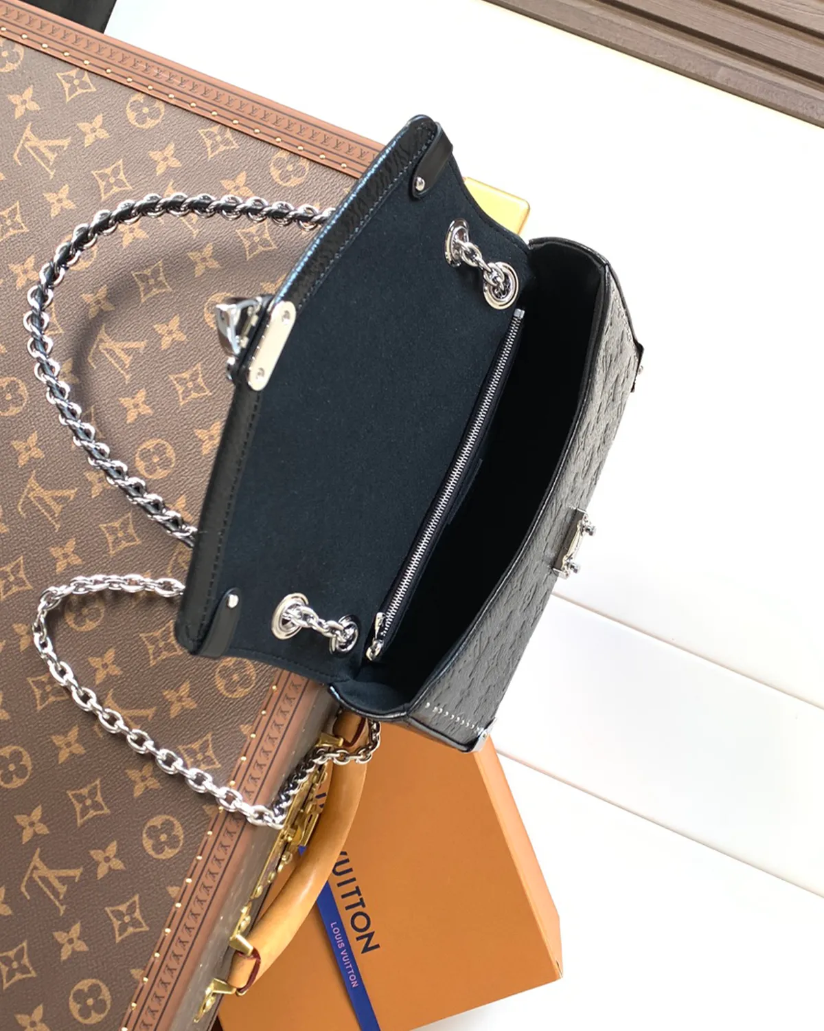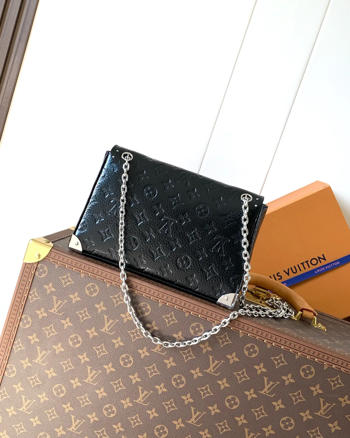 The Signature Soft Trunk Bag in Black Leather strips away the pattern to focus on pure form and hardware. It translates the industrial codes of 19th-century luggage into a sleek, monochromatic accessory. The deep black leather serves as a dramatic canvas for the gleaming gold hardware, creating a look that is equal parts rock-and-roll attitude and Parisian elegance.