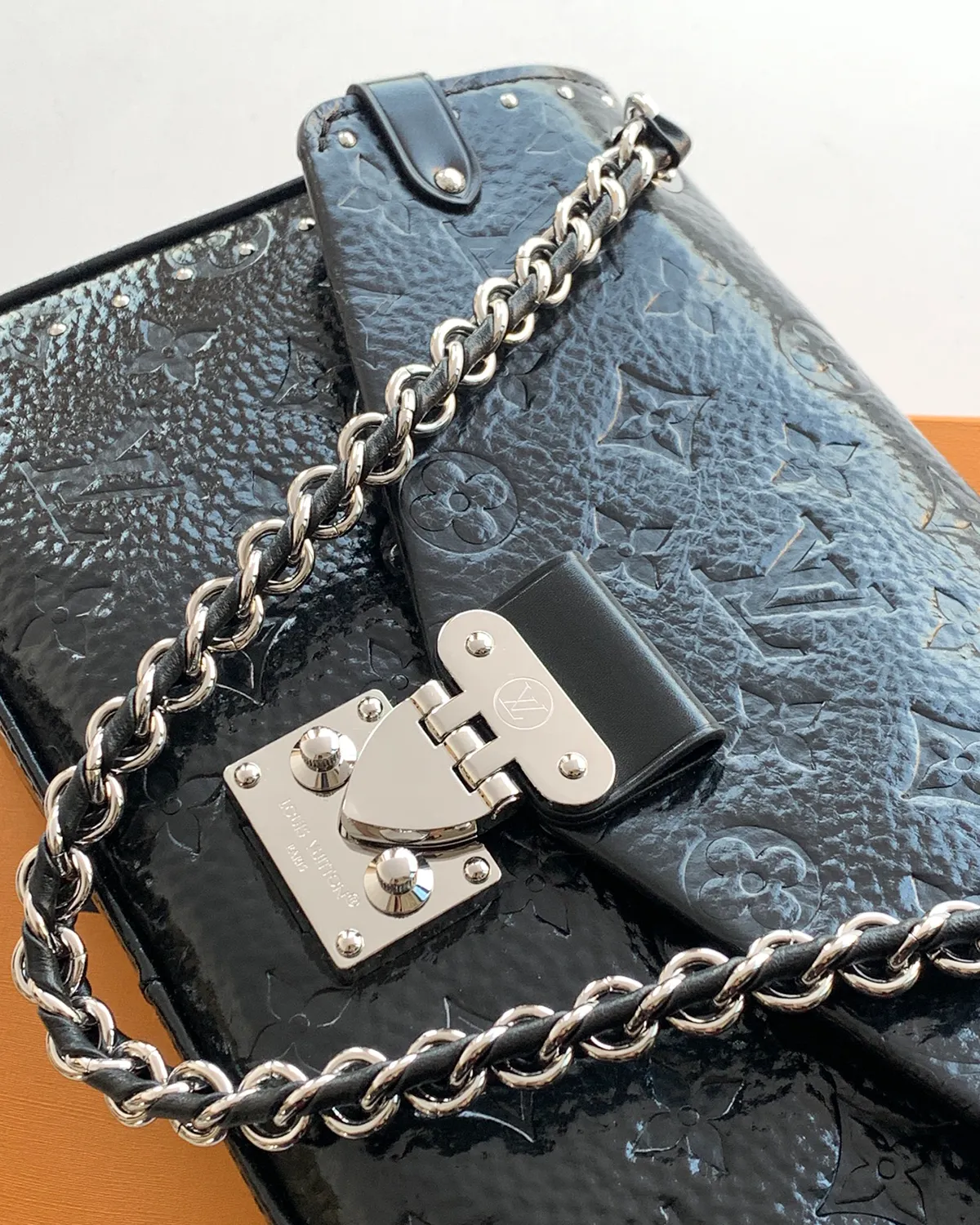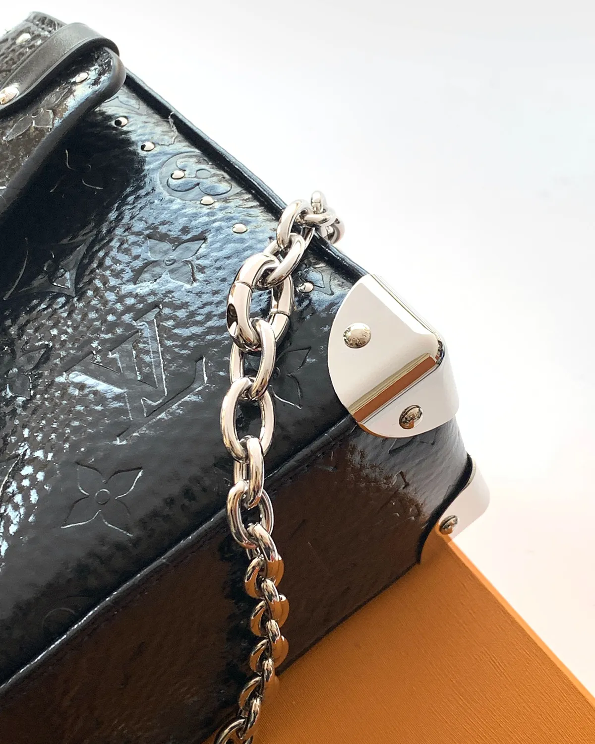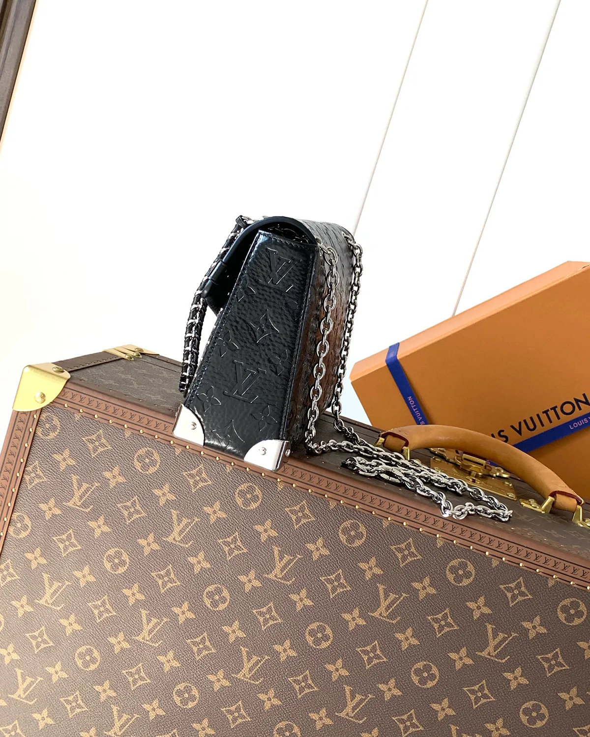 The Signature Soft Trunk Bag in Black Leather strips away the pattern to focus on pure form and hardware. It translates the industrial codes of 19th-century luggage into a sleek, monochromatic accessory. The deep black leather serves as a dramatic canvas for the gleaming gold hardware, creating a look that is equal parts rock-and-roll attitude and Parisian elegance.
