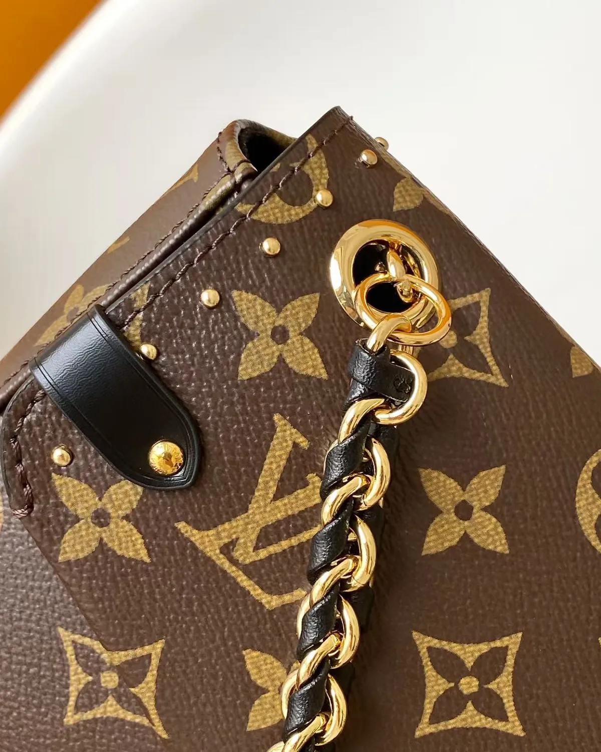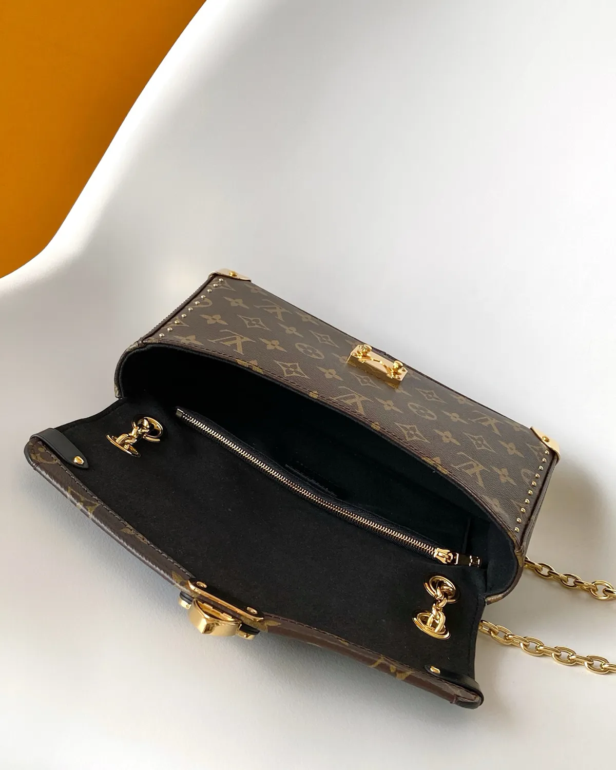 Every millimeter of this bag tells a story. The corners are protected by polished gold-tone metal brackets, originally designed to withstand the rough handling of steamship cargo. The side bands are crafted from smooth black leather and punctuated with miniature “lozine” studs, mimicking the wooden reinforcement slats of vintage trunks.