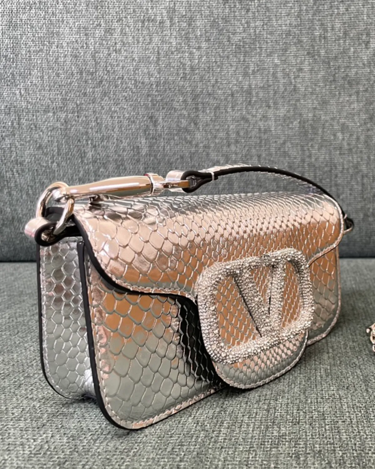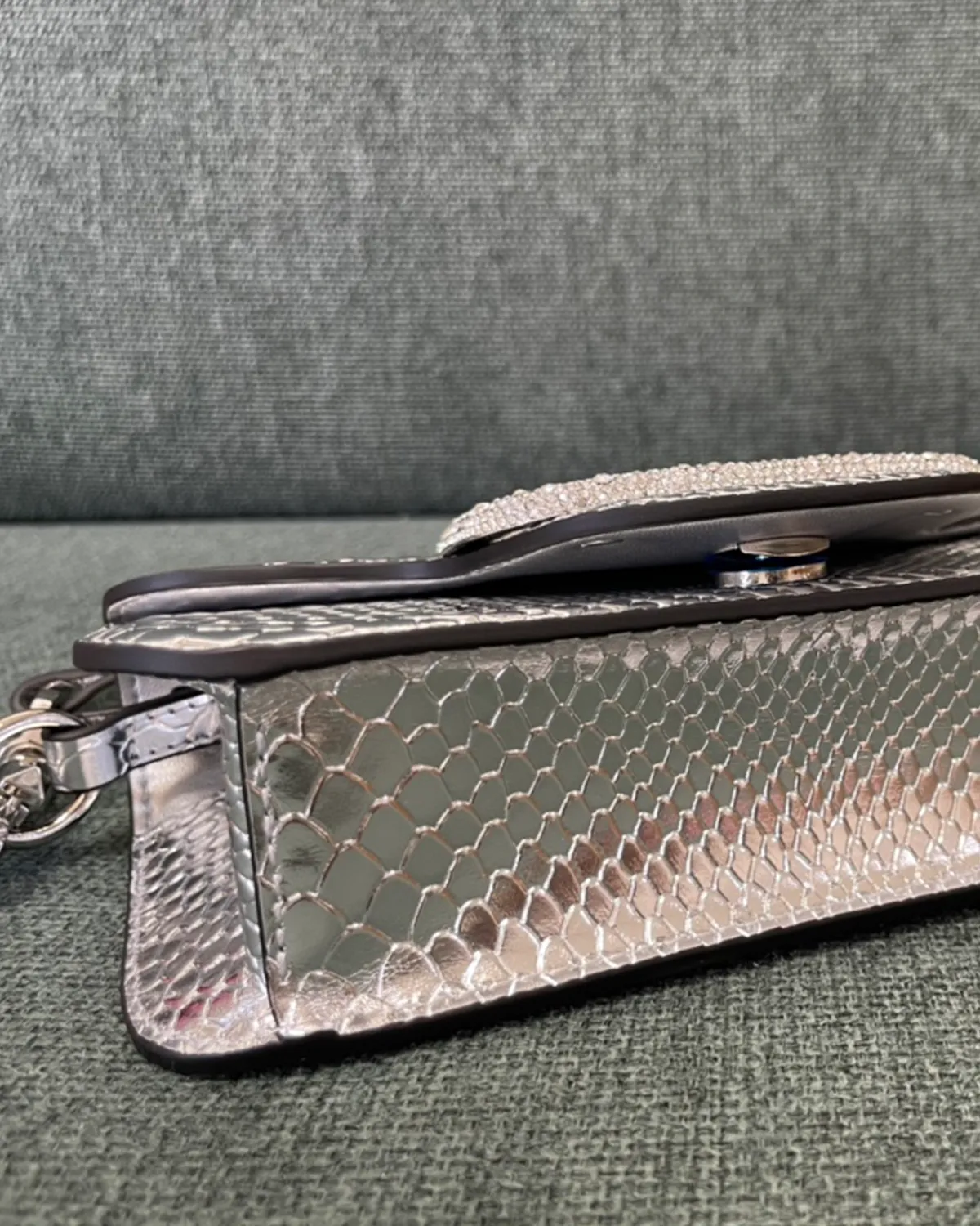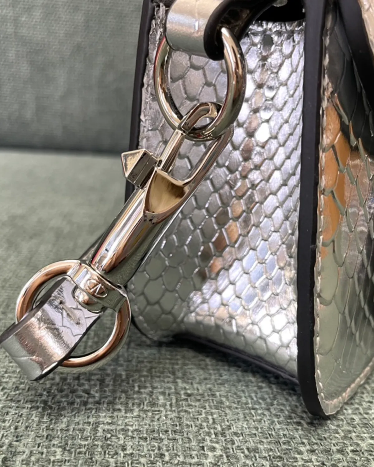 The body is crafted from premium calfskin that has been expertly stamped and treated to mimic the scales of python skin. This “Snake Effect” offers the glamorous look of exotic leather with the durability and ethical ease of calfskin. The scales provide a multi-dimensional texture that catches the light, elevating the simple box shape into a statement piece.