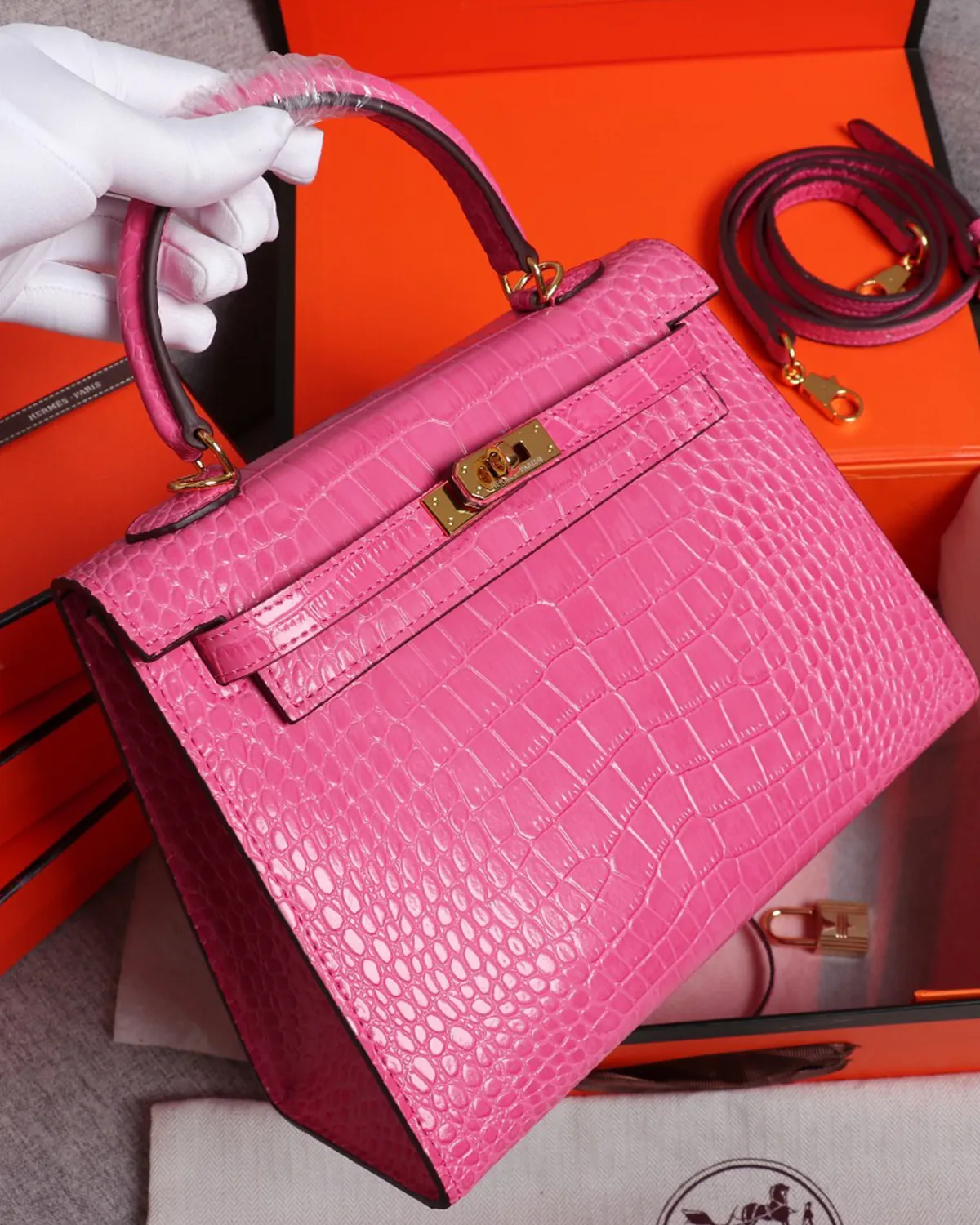 The body is crafted from durable split leather that has been heat-embossed with a realistic crocodile scale pattern. Finished with a high-gloss glaze, the texture mimics the look of exotic skins, offering depth and visual interest. The material is treated to be rigid and hard-wearing, ensuring the bag maintains its sharp architectural shape over time.