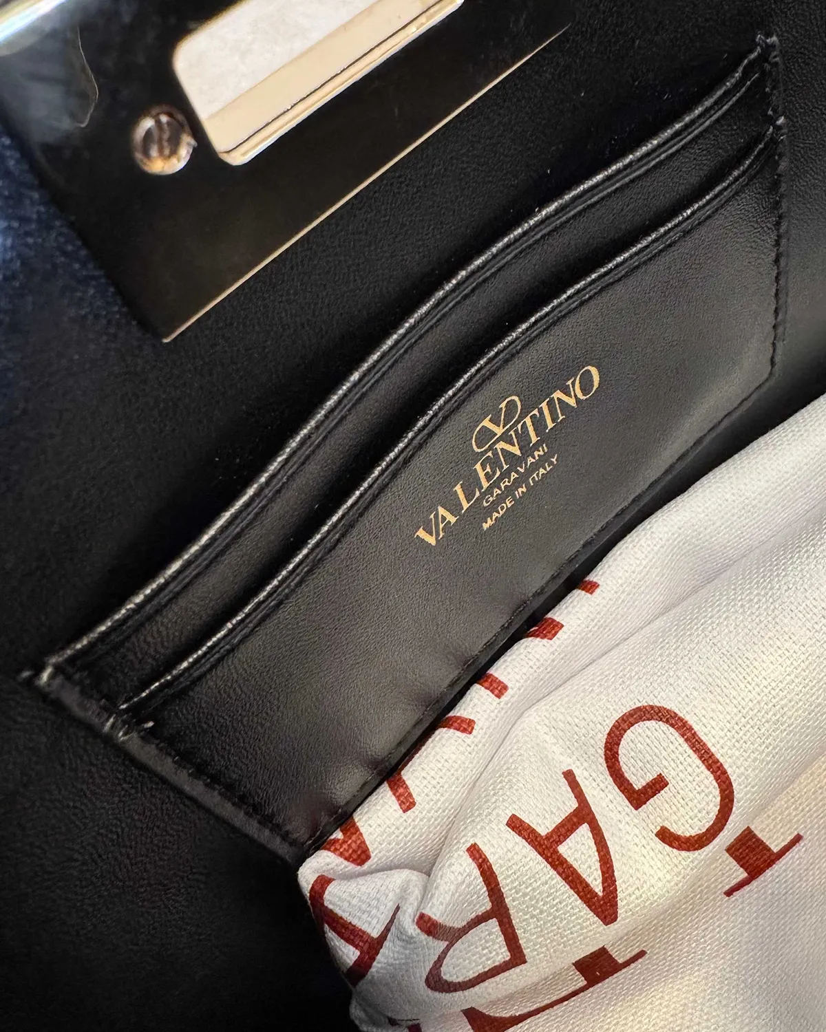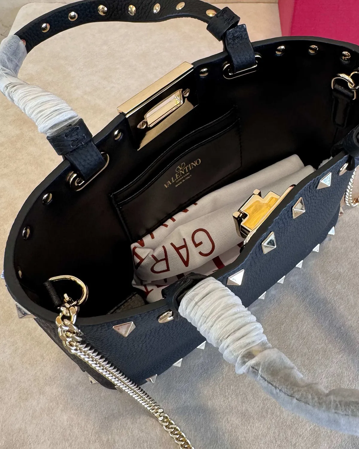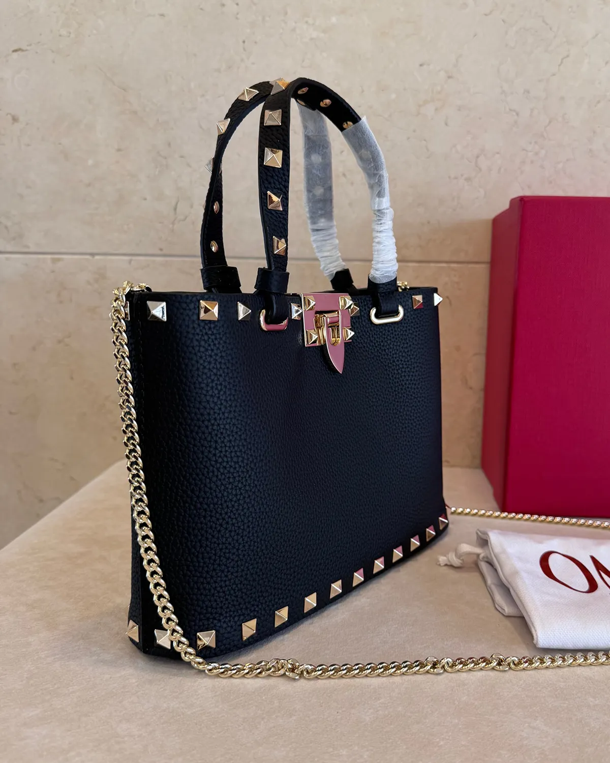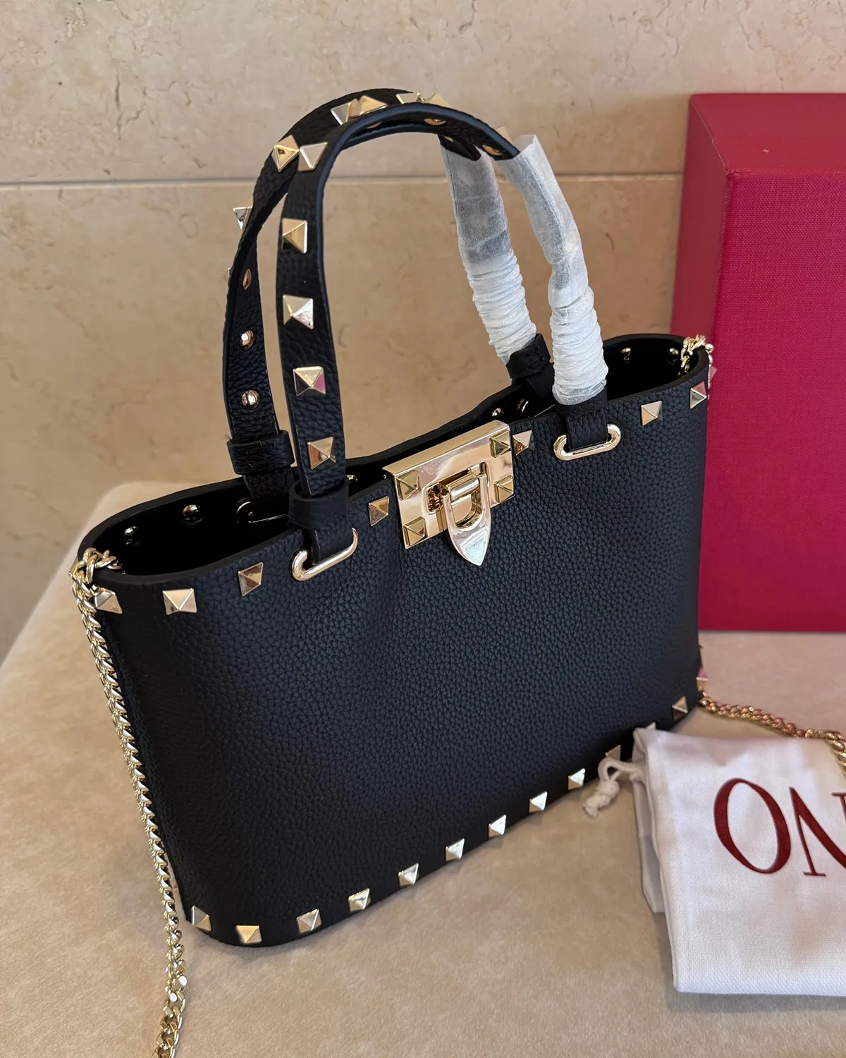 Each platinum-finish pyramid stud is hand-applied, tracing the architectural lines of the bag and the curve of the handles. These studs catch the light and direct the eye, turning the seams of the bag into a decorative feature. The flip-lock clasp adds a secure, mechanical touch to the open-top design.