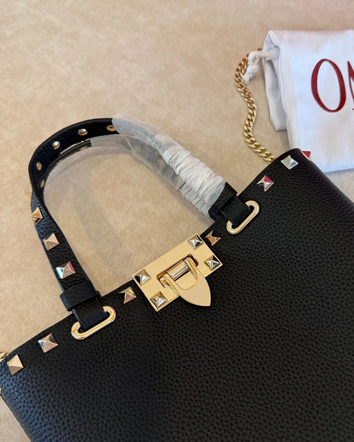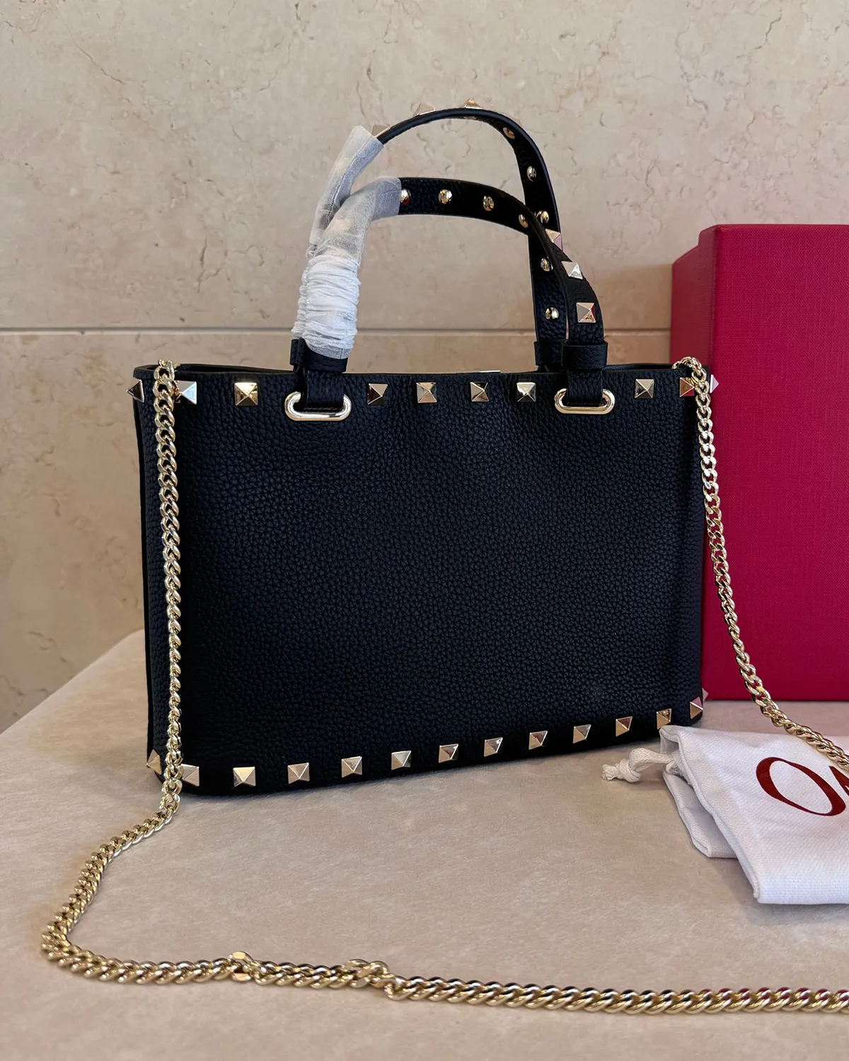 The Signature Studded Mini Tote proves that attitude isn’t a matter of size. It condenses the aggressive elegance of the original “Rock” shopper into a petite format that feels like jewelry for the hand. It is the perfect companion for the woman who wants to add a sharp, metallic edge to a feminine dress or amplify a leather-jacket look.