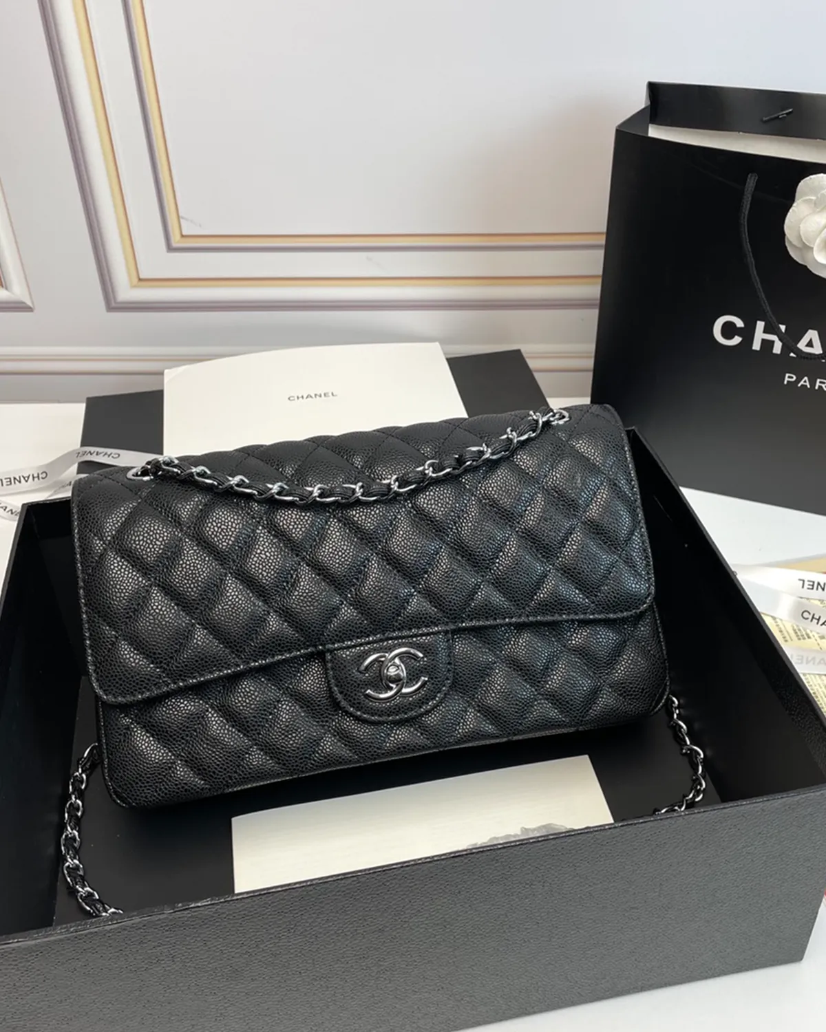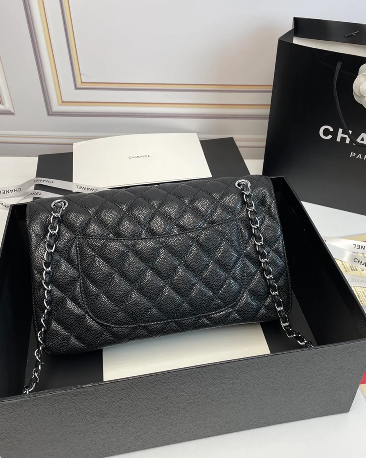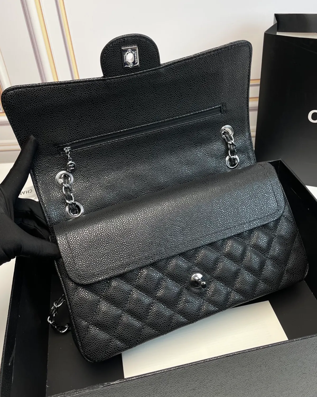 To match the larger proportions, the bag features an upsized version of the legendary interlocking metal turn-lock. Whether in gold or silver tone, this clasp serves as the bag’s jewelry, securing the double flap with a satisfying mechanical click. It is the hallmark of the “Classic” lineage, instantly recognizable across any room.