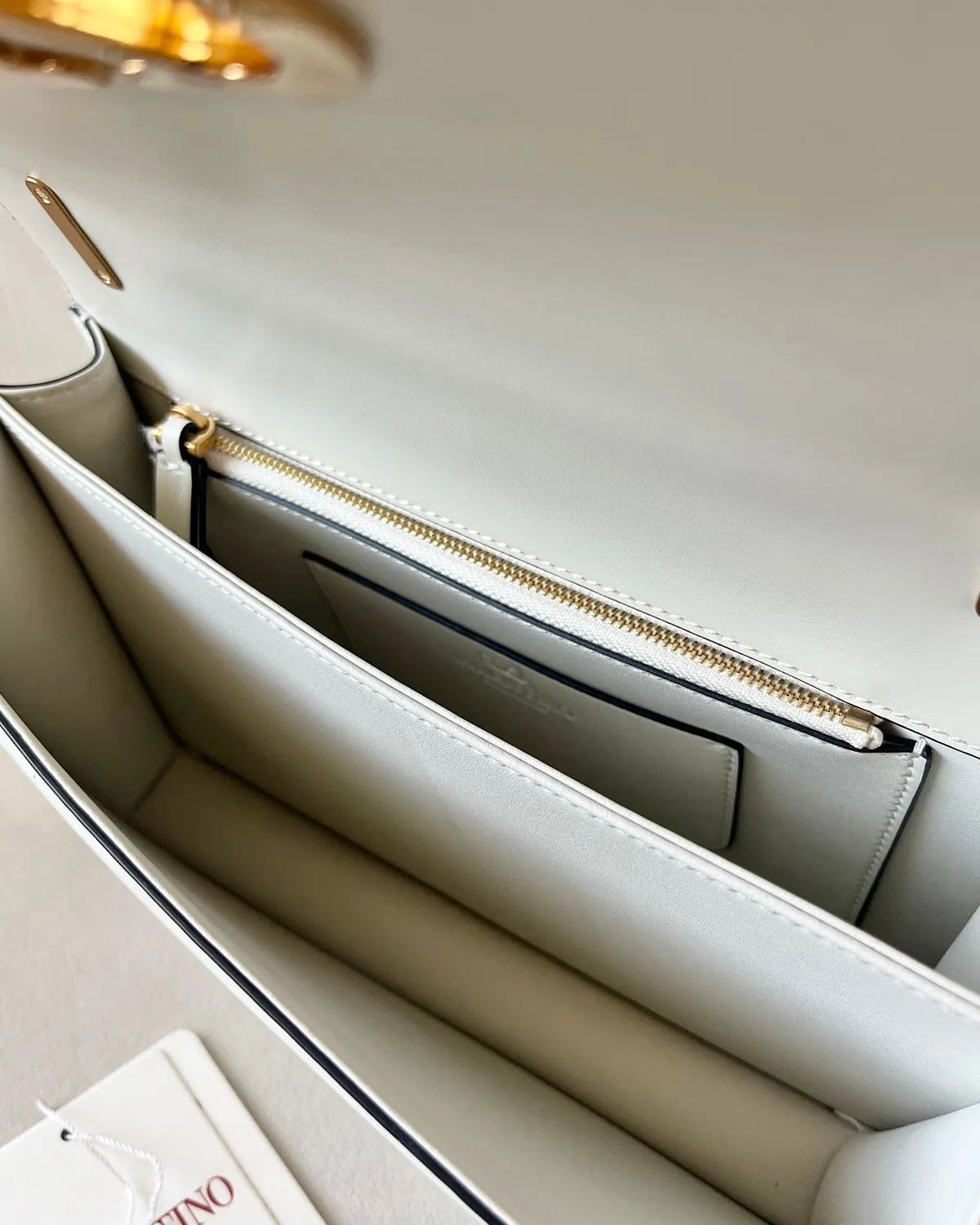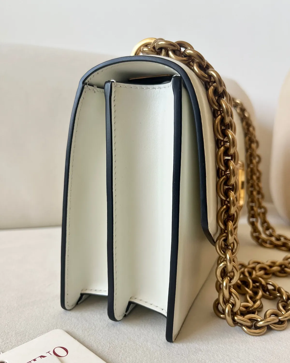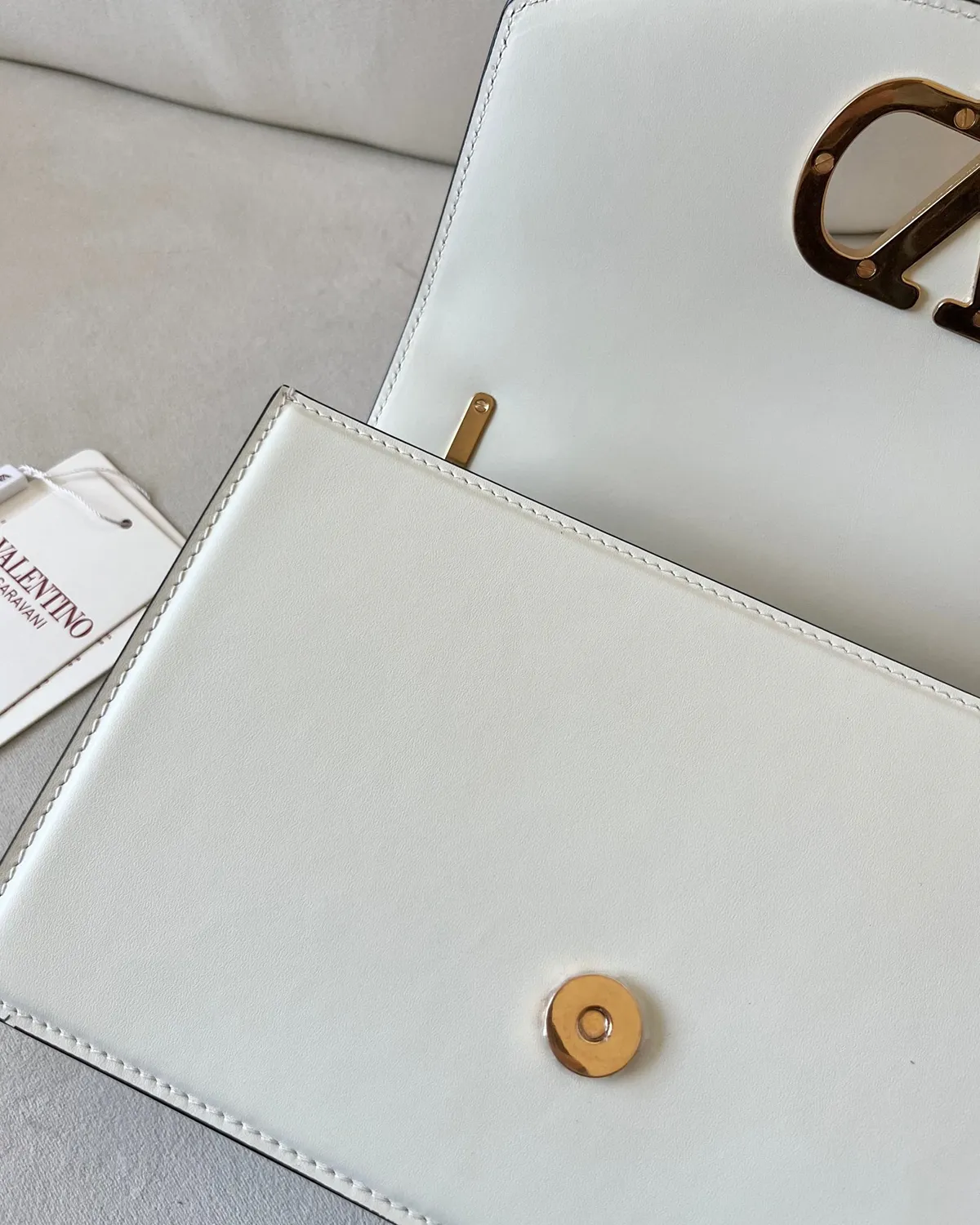 The magnetic closure features the iconic V-shaped logo, but with a twist: it is enveloped in the same beige leather as the body. This tone-on-tone technique creates a sculptural relief effect, outlined subtly by gold-tone metal. It is branding that whispers luxury, blending perfectly into the bag’s architecture.