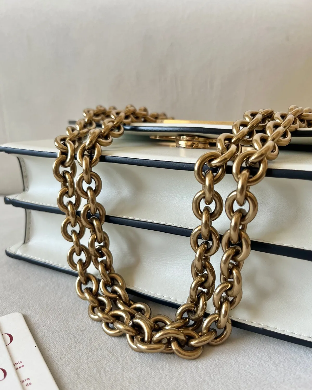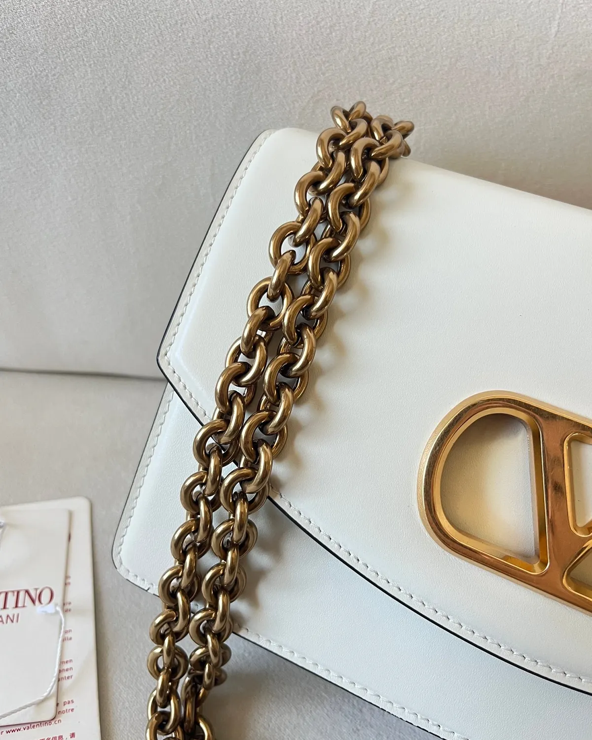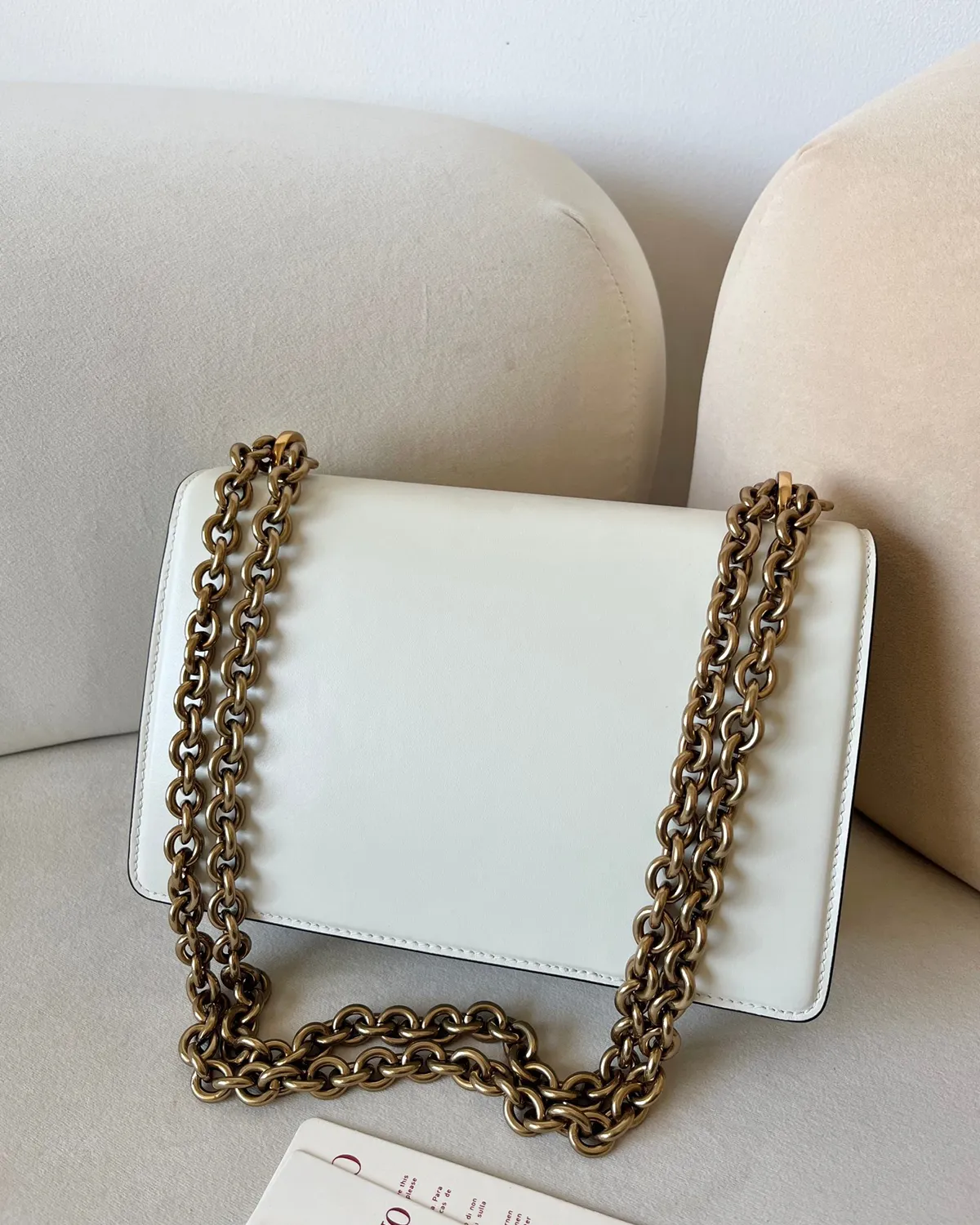 The magnetic closure features the iconic V-shaped logo, but with a twist: it is enveloped in the same beige leather as the body. This tone-on-tone technique creates a sculptural relief effect, outlined subtly by gold-tone metal. It is branding that whispers luxury, blending perfectly into the bag’s architecture.