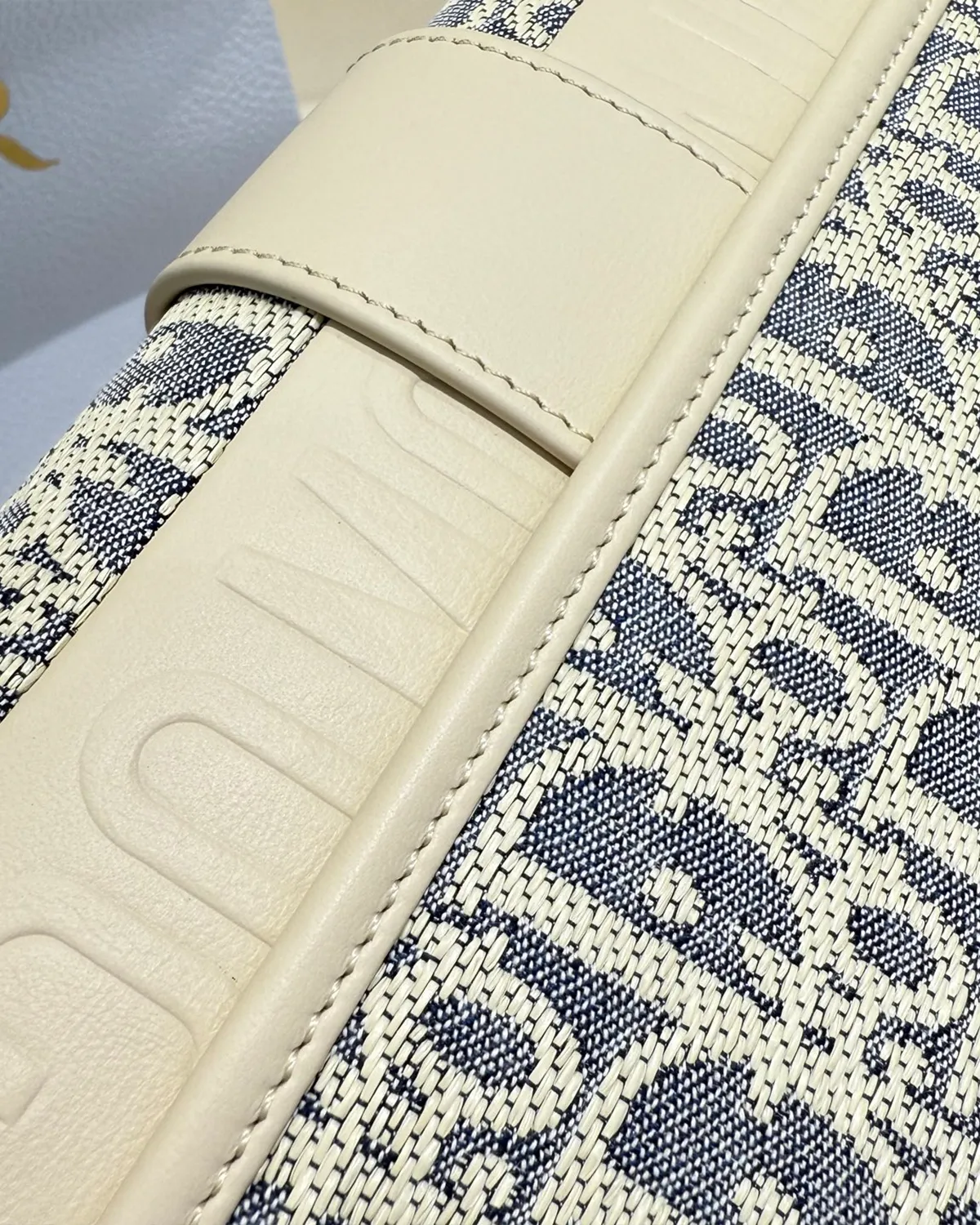 The body is crafted from the dense, embroidered Oblique Jacquard in navy blue. Designed in 1967, this hypnotic geometric pattern is a symbol of the brand’s legacy. It is meticulously framed by smooth, light-colored calfskin leather, creating a crisp contrast that highlights the bag’s structured rectangular shape.