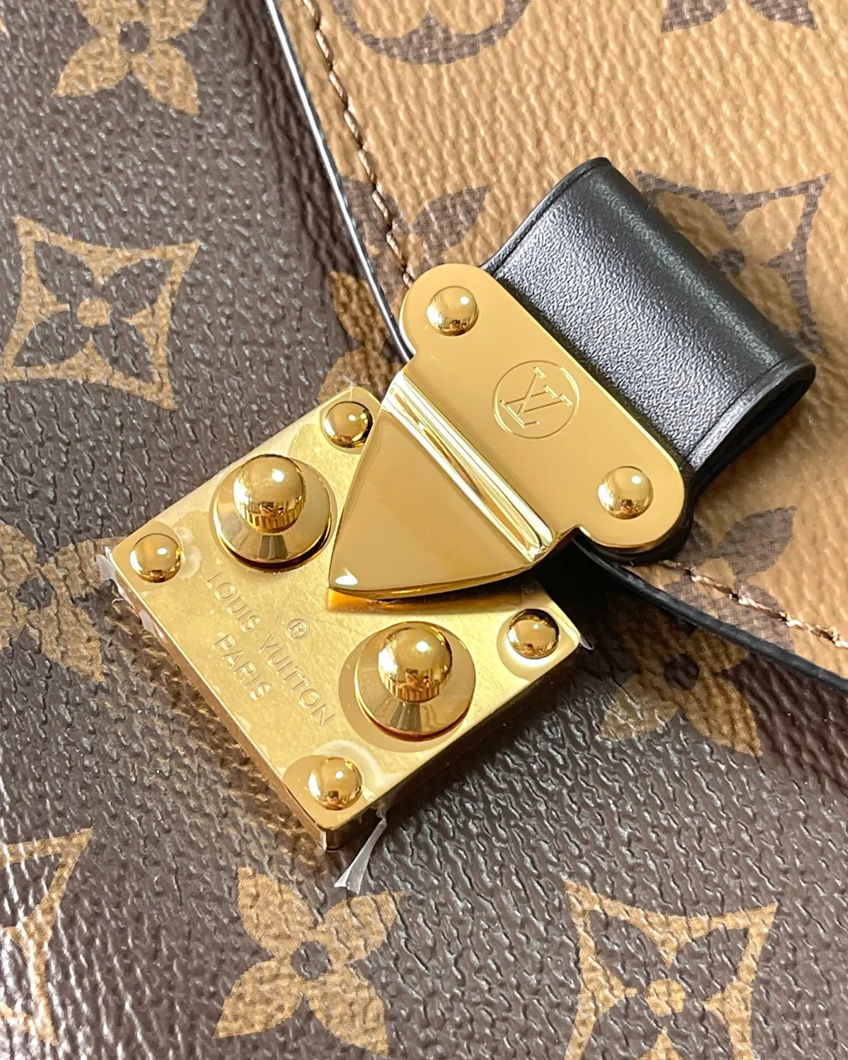 The body expertly combines two variations of the legendary coated canvas. The warm, honey-toned “Reverse” print on the body contrasts sharply with the classic dark brown flap (or vice versa), creating visual depth. This graphic look is framed by a chic black leather top handle, which offers a more urban, edgy feel than the traditional natural leather.