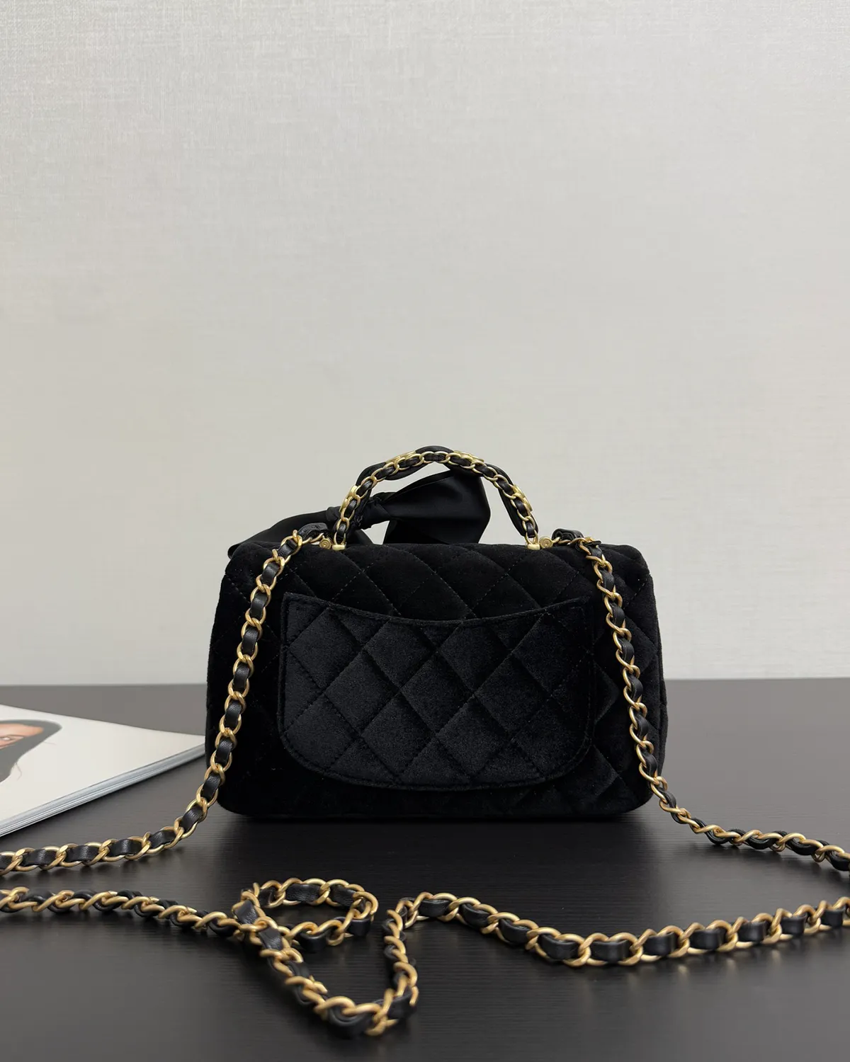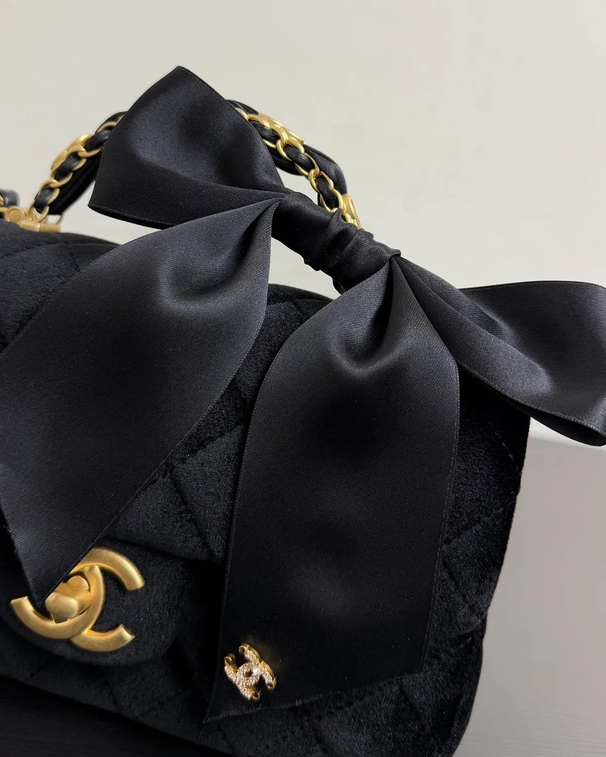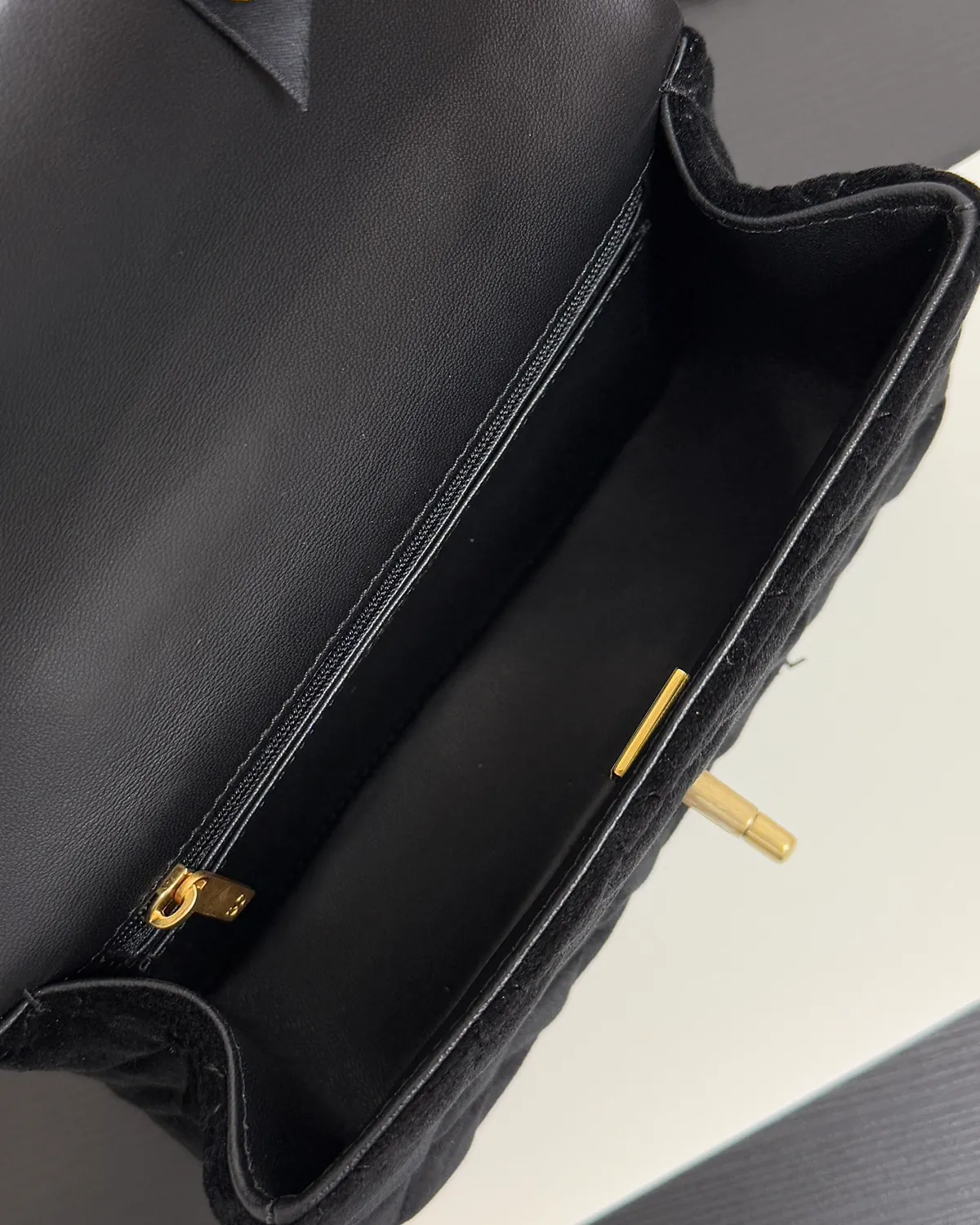 The Signature Velvet Top Handle Mini is designed for the woman who owns the night. Moving away from the practicality of leather, this bag embraces the pure opulence of textiles. The deep, light-absorbing black velvet creates a dramatic backdrop for the gleaming gold hardware, evoking the glamour of the 1920s and the mystery of a midnight soirée.