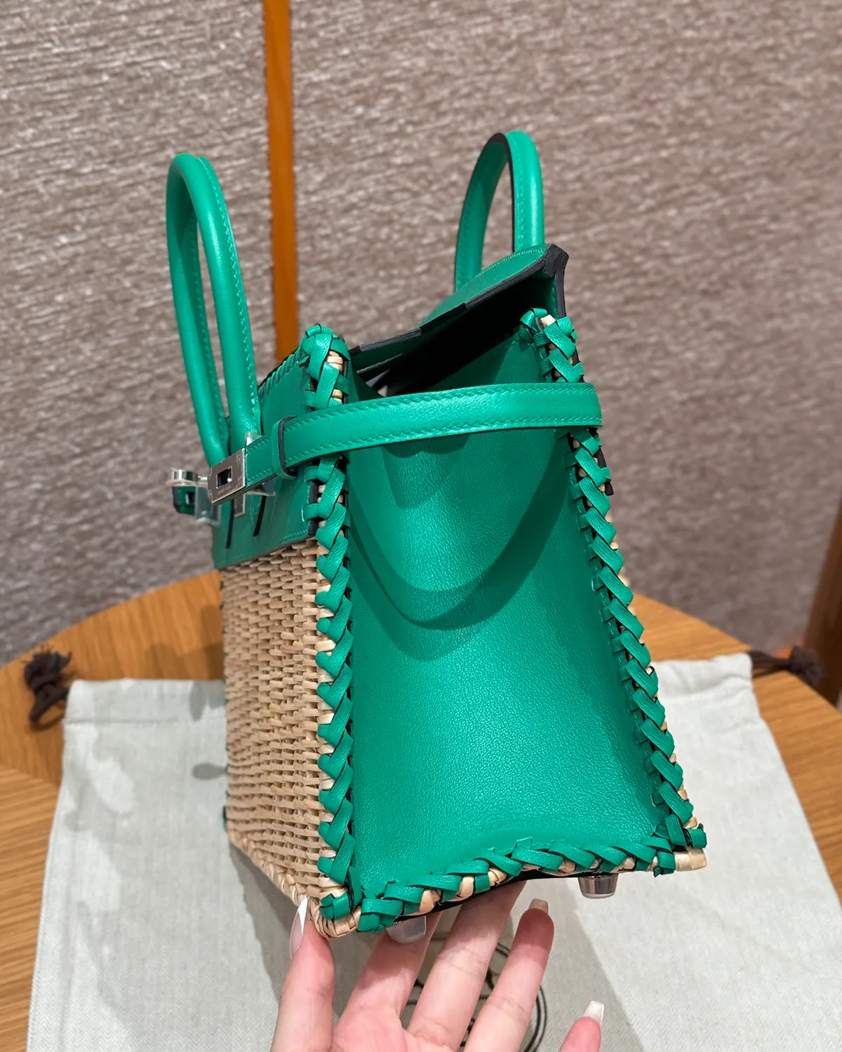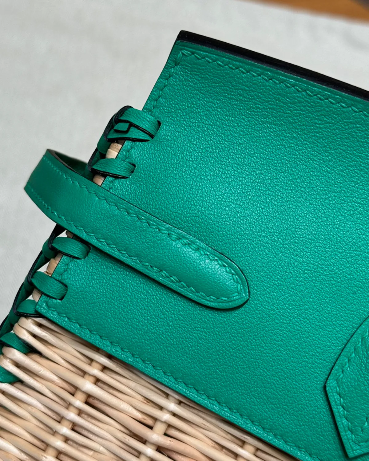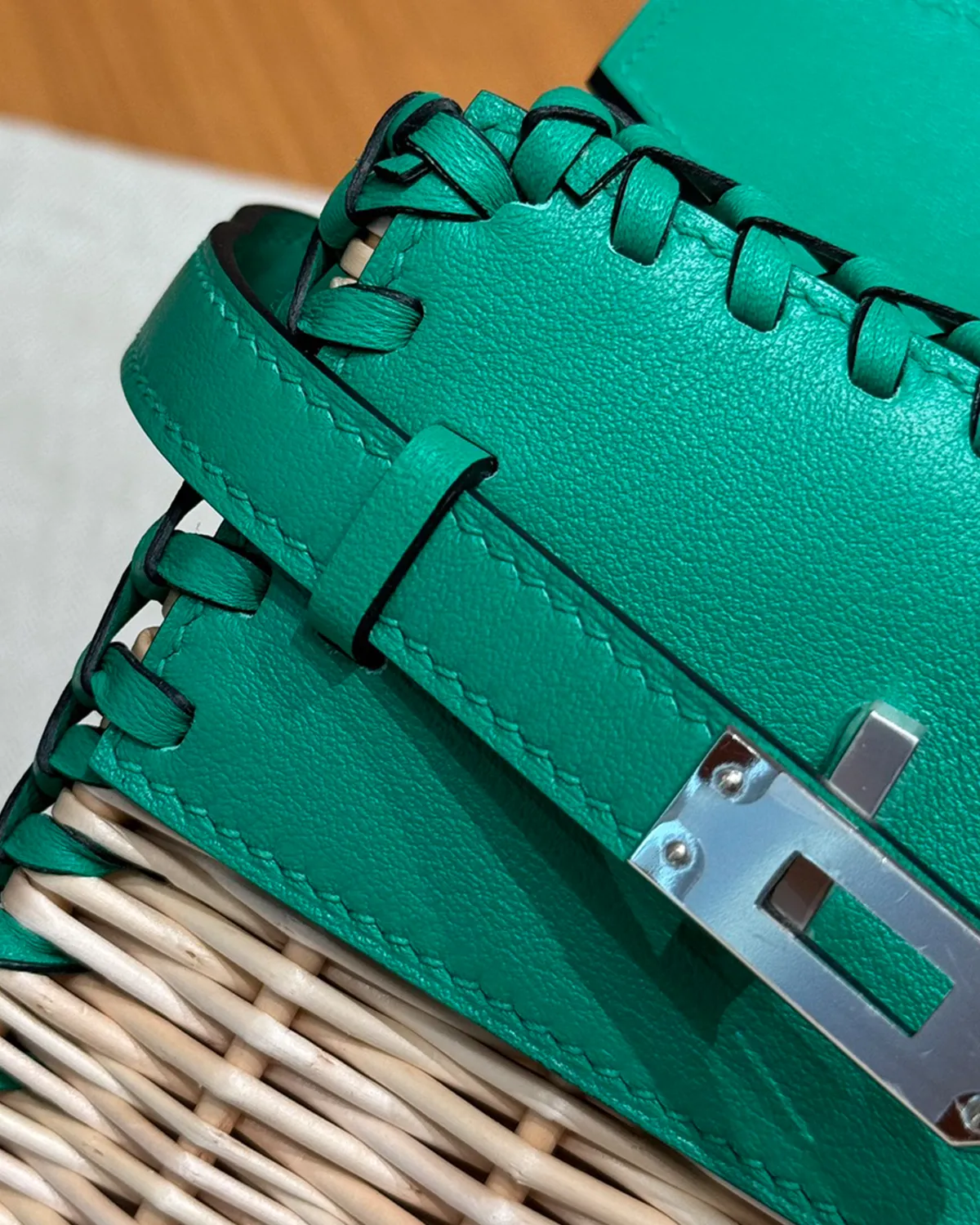 The wicker is held in place by a complex cage of “Swift” leather in “Menthe.” This fresh, cool green acts as a structural skeleton, securing the woven body while forming the flap, handles, and sanglon straps. Swift leather is chosen for its smooth surface and ability to absorb vibrant dye, offering a pop of color that feels like a cool breeze.