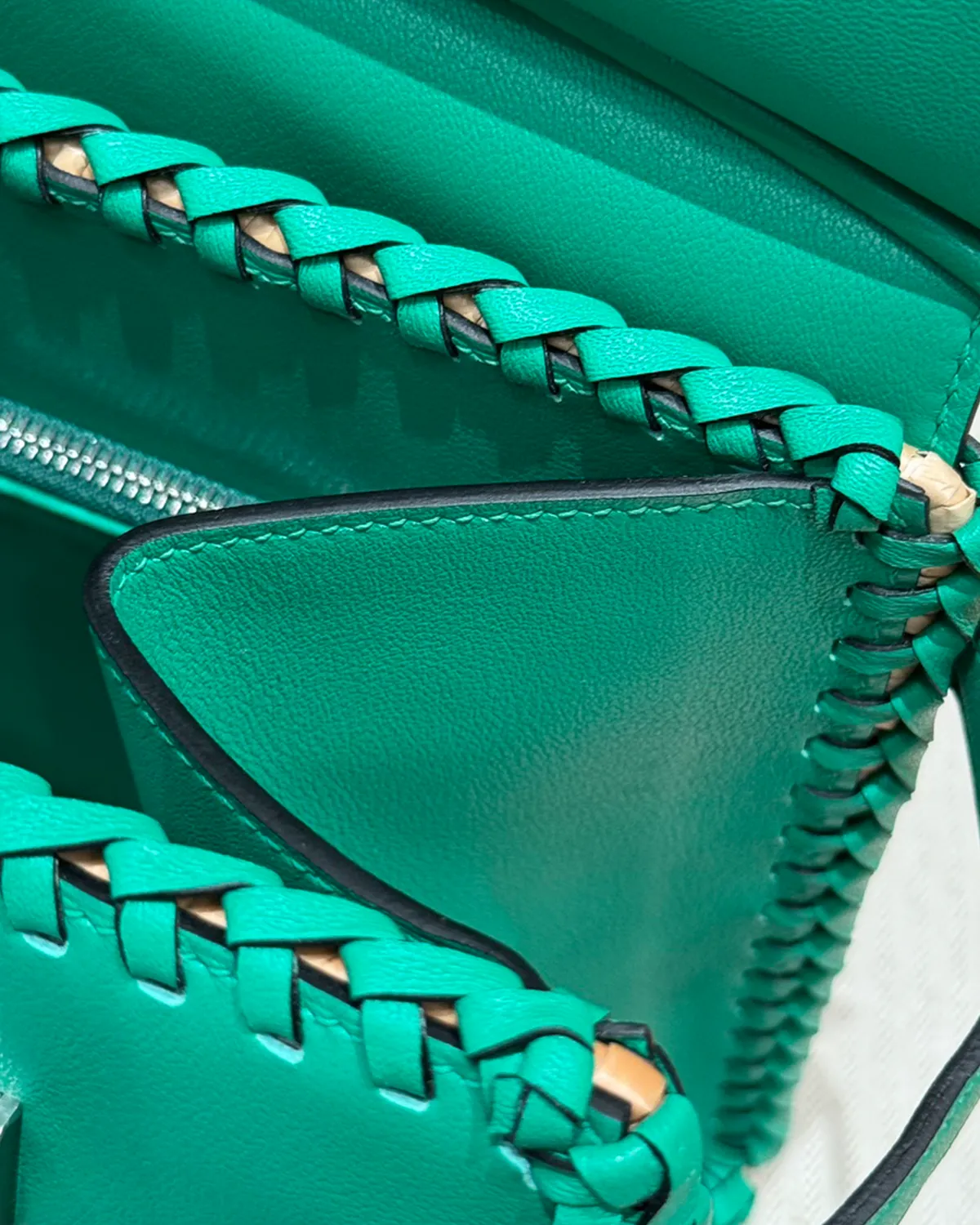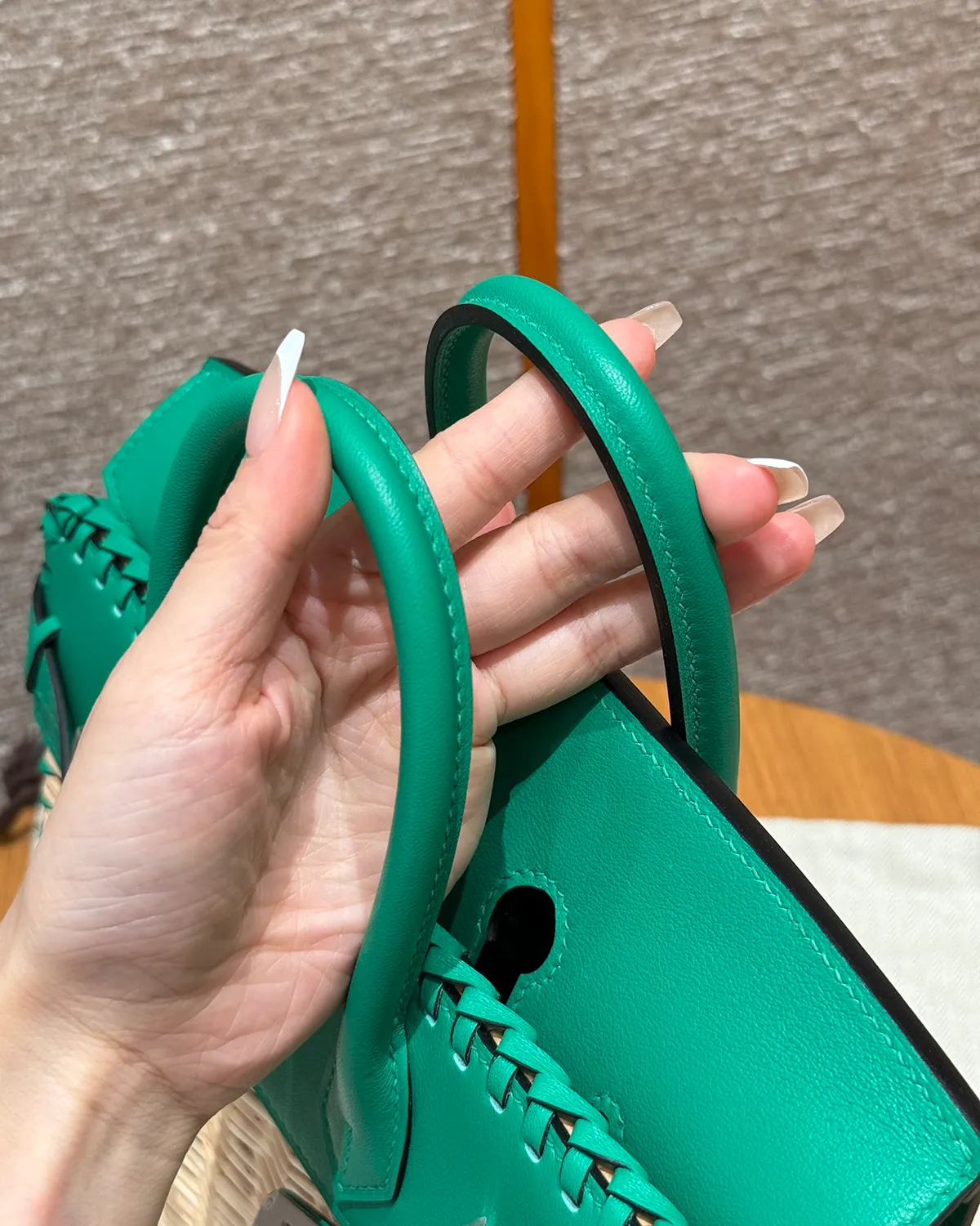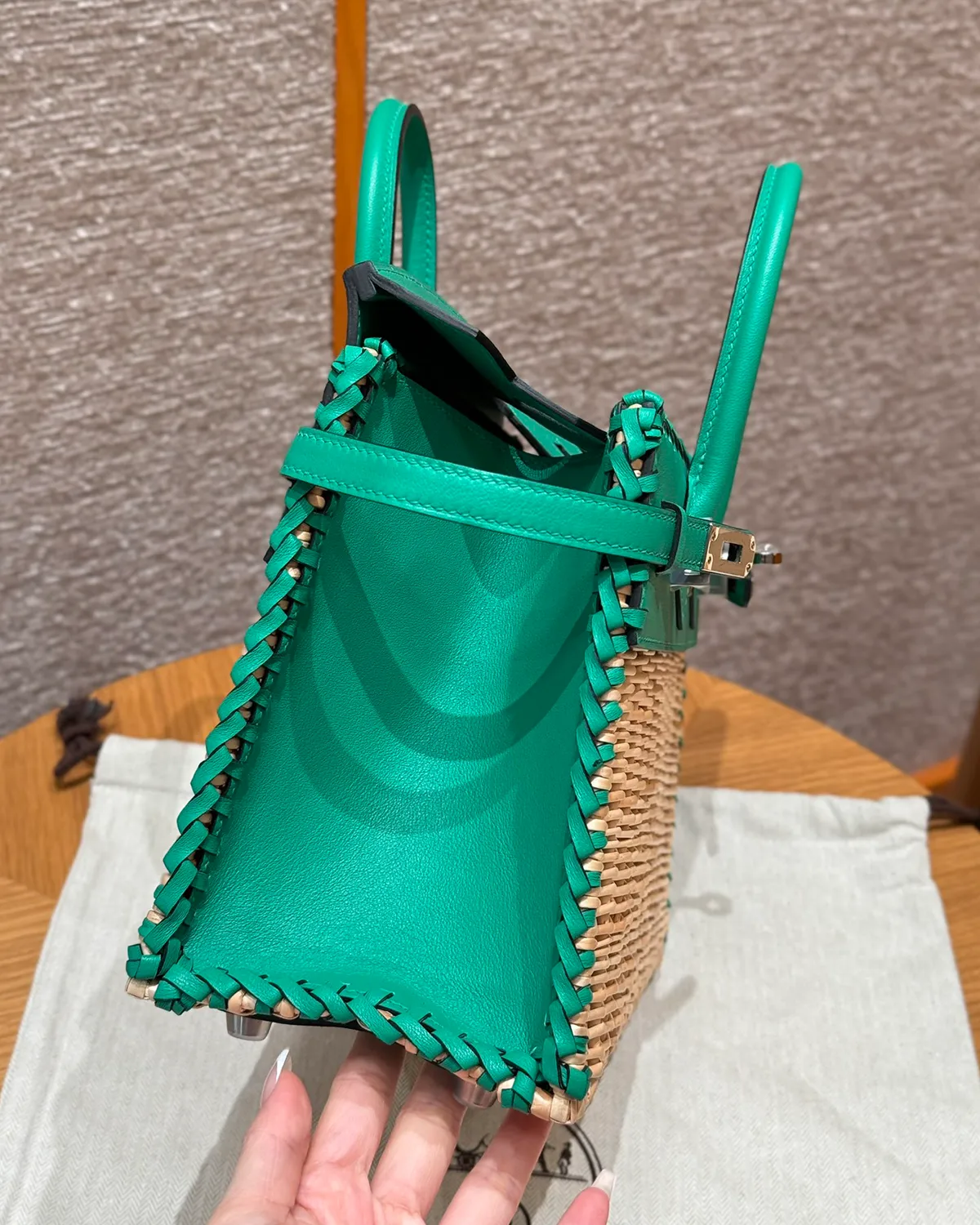The wicker is held in place by a complex cage of “Swift” leather in “Menthe.” This fresh, cool green acts as a structural skeleton, securing the woven body while forming the flap, handles, and sanglon straps. Swift leather is chosen for its smooth surface and ability to absorb vibrant dye, offering a pop of color that feels like a cool breeze.