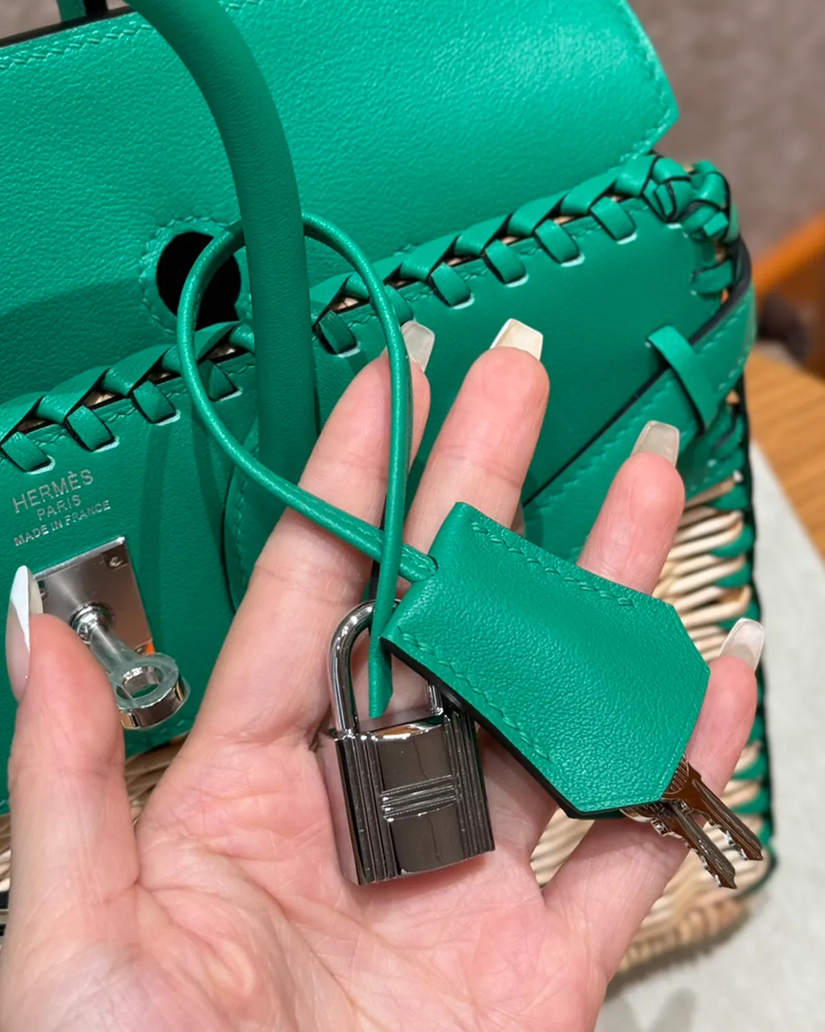 *Note: This item is a museum-grade homage inspired by the Hermes Picnic Birkin 25 Menthe design. It captures the rare woven osier and leather construction at an accessible price point.