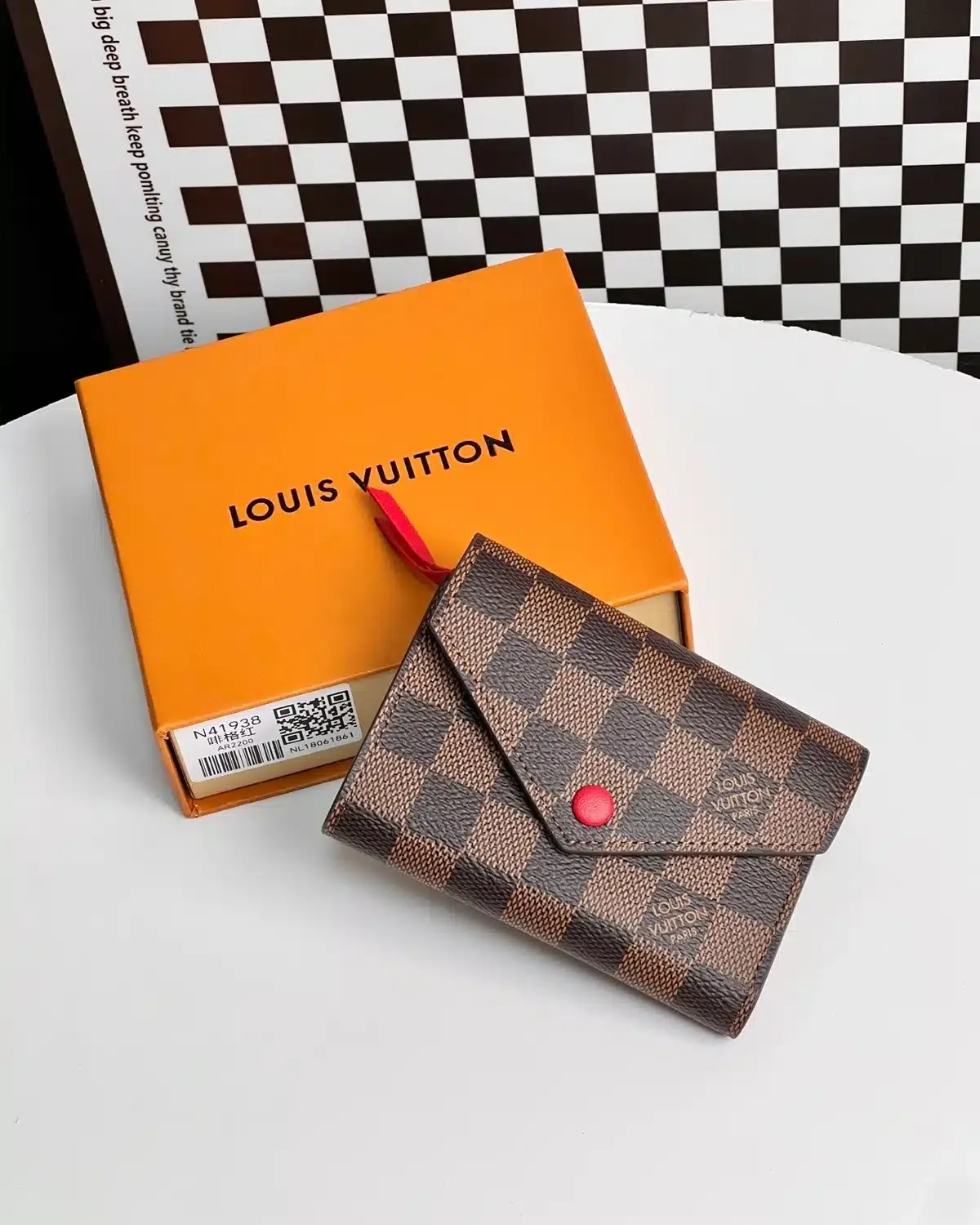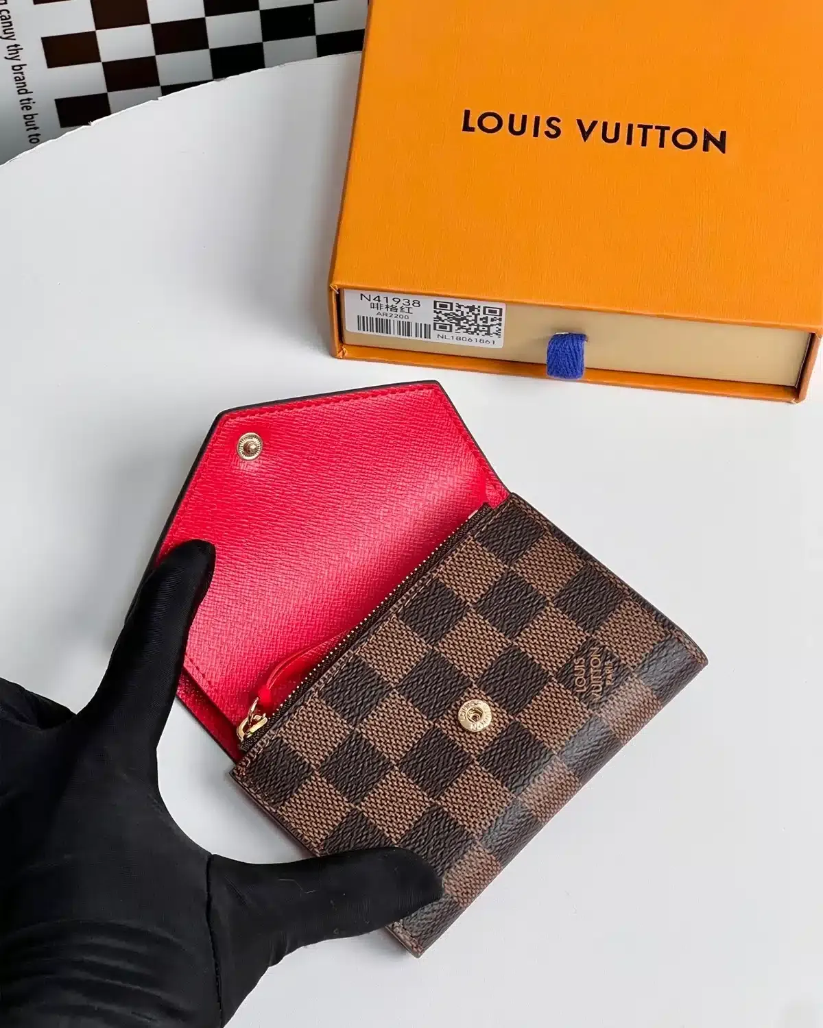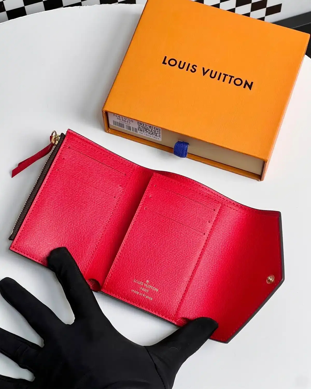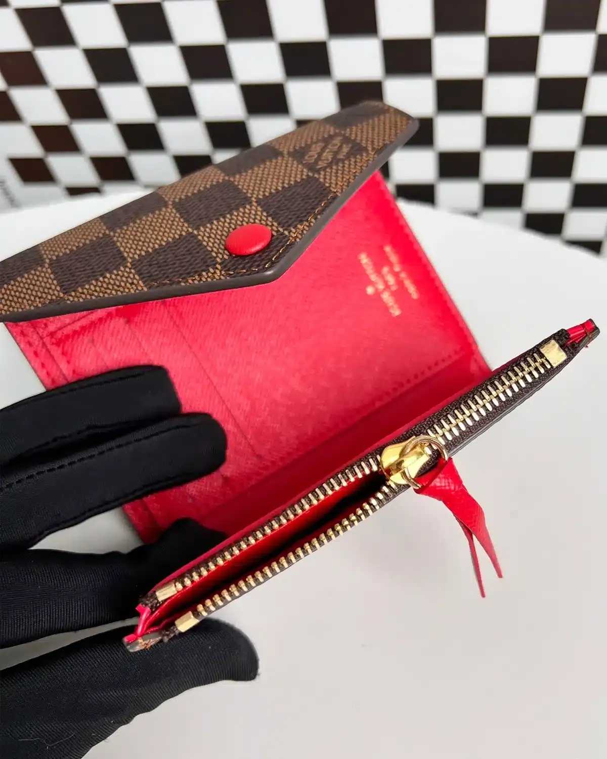 The victorine wallet damier ebene red features a compact tri-fold silhouette in coated checkered canvas with a red snap closure accent. It offers daily practicality while remaining lightweight and easy to carry.