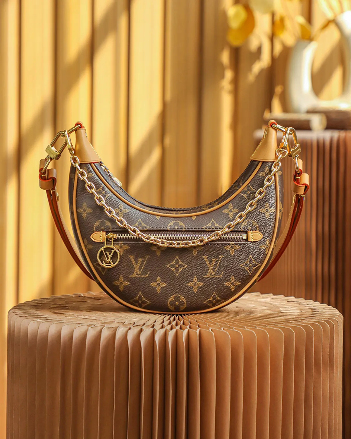 Signature Half-Moon Shoulder Bag – Monogram & Gold Chain | BagLadt
